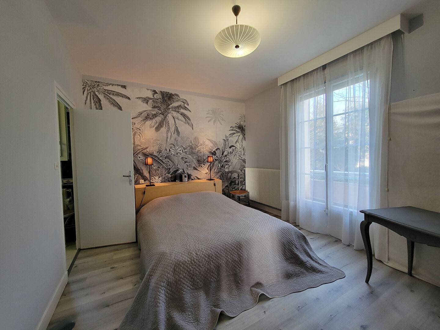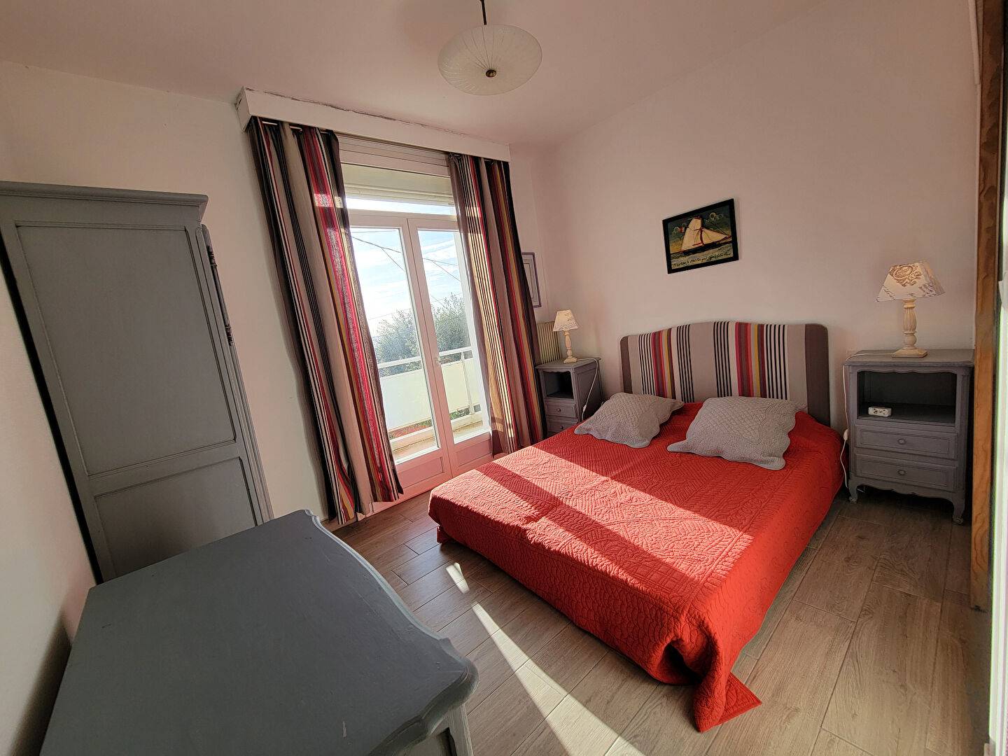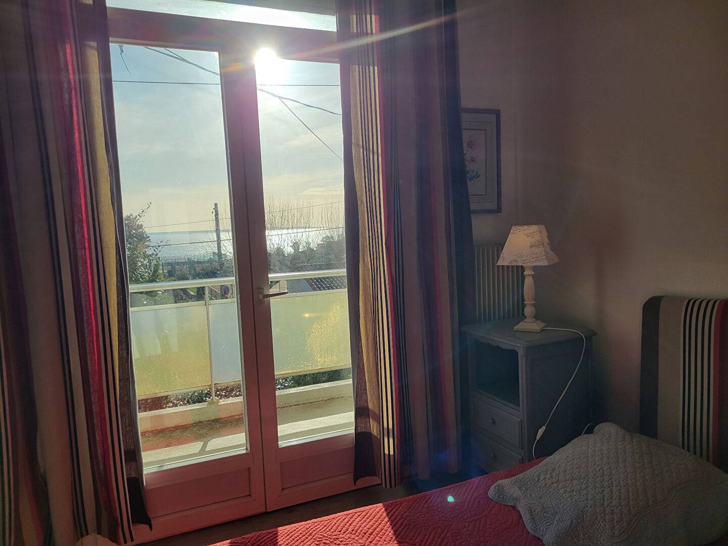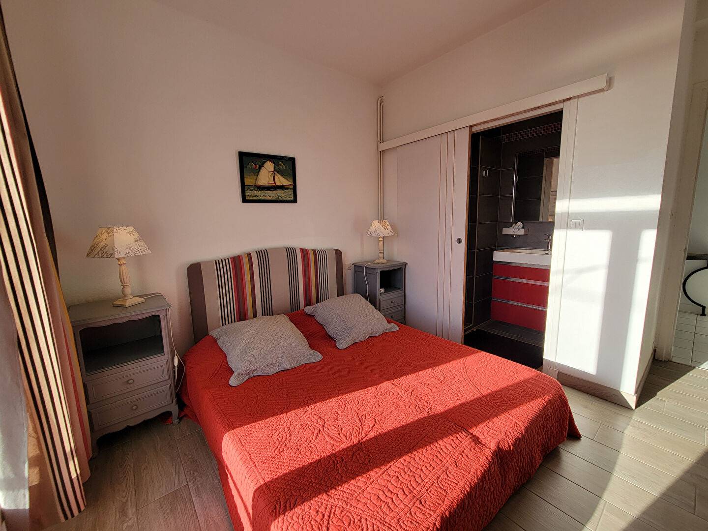 Une première chambre, ouverte sur le balcon, avec sa salle d'eau.