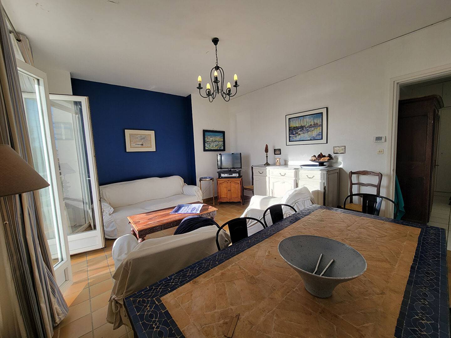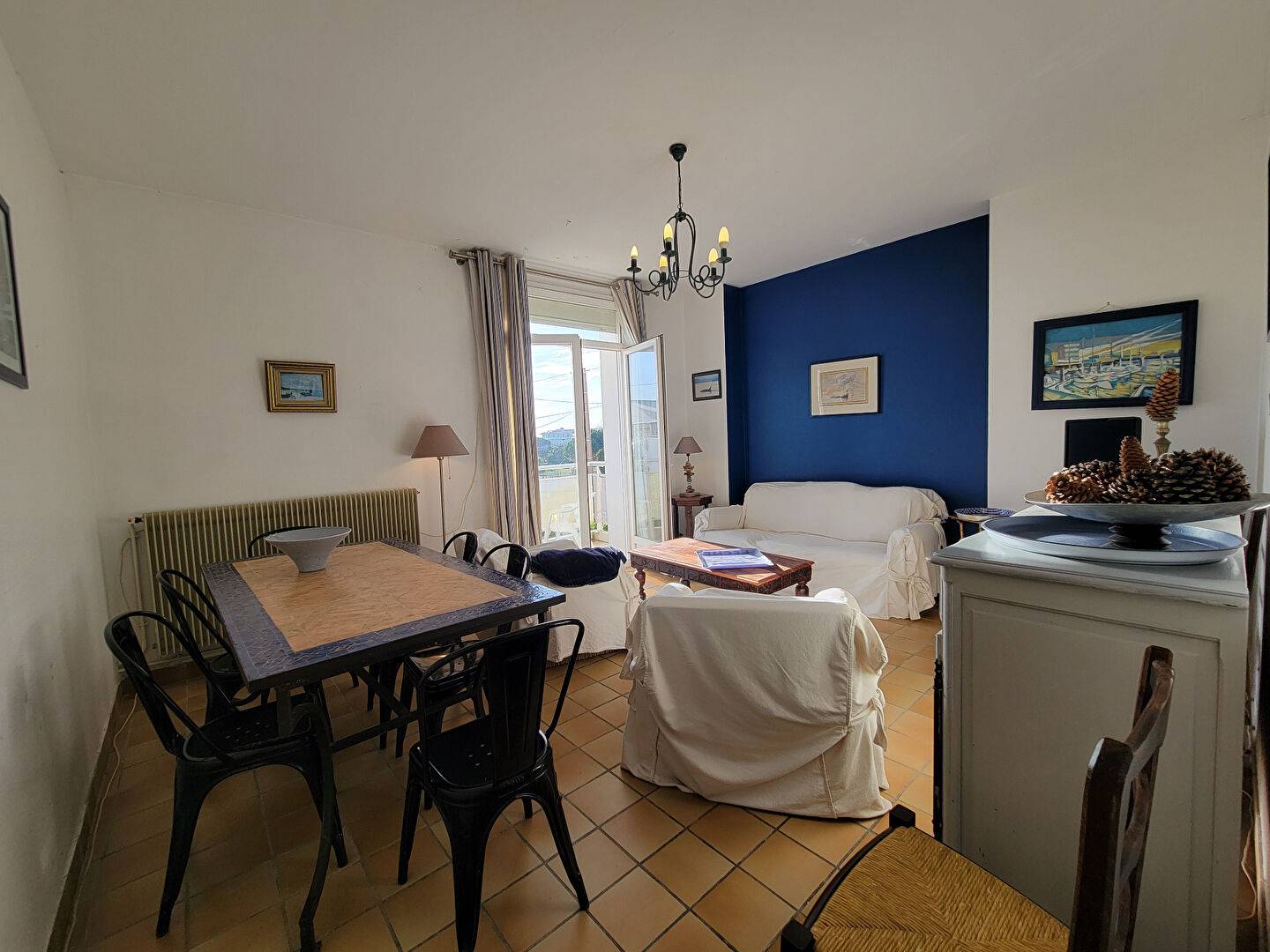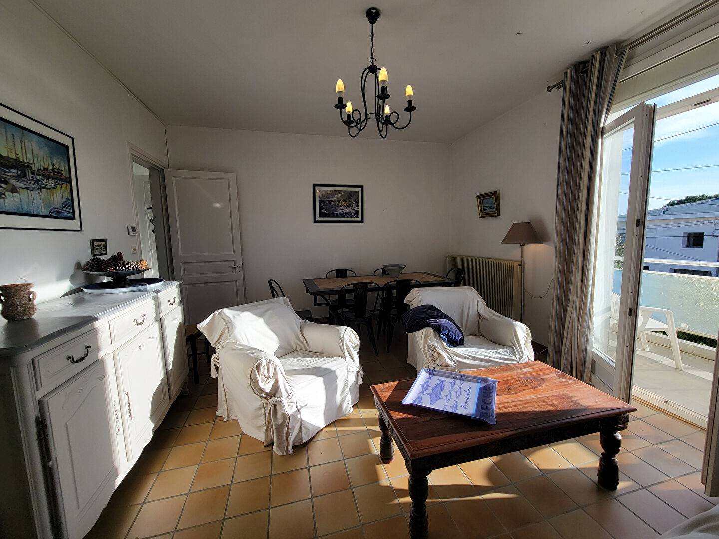 Hall d'entrée, pièce de vie avec coin repas et salon (canapé clic-clac) ouvert sur beau balcon ensoleillé avec vue mer, cuisine indépendant avec également un coin repas.