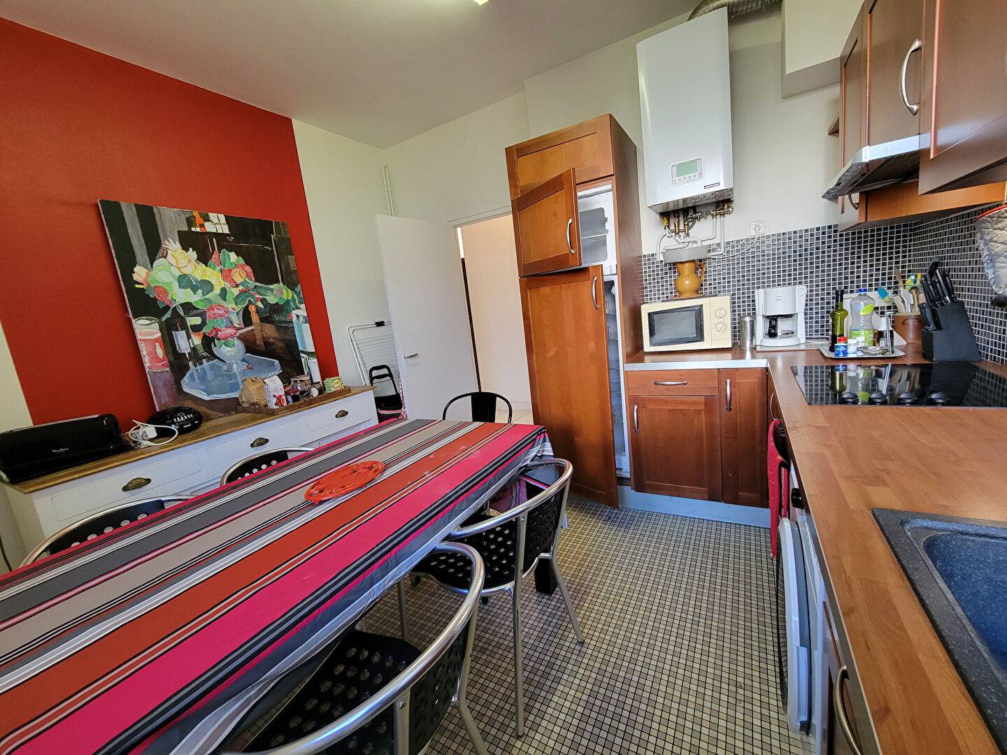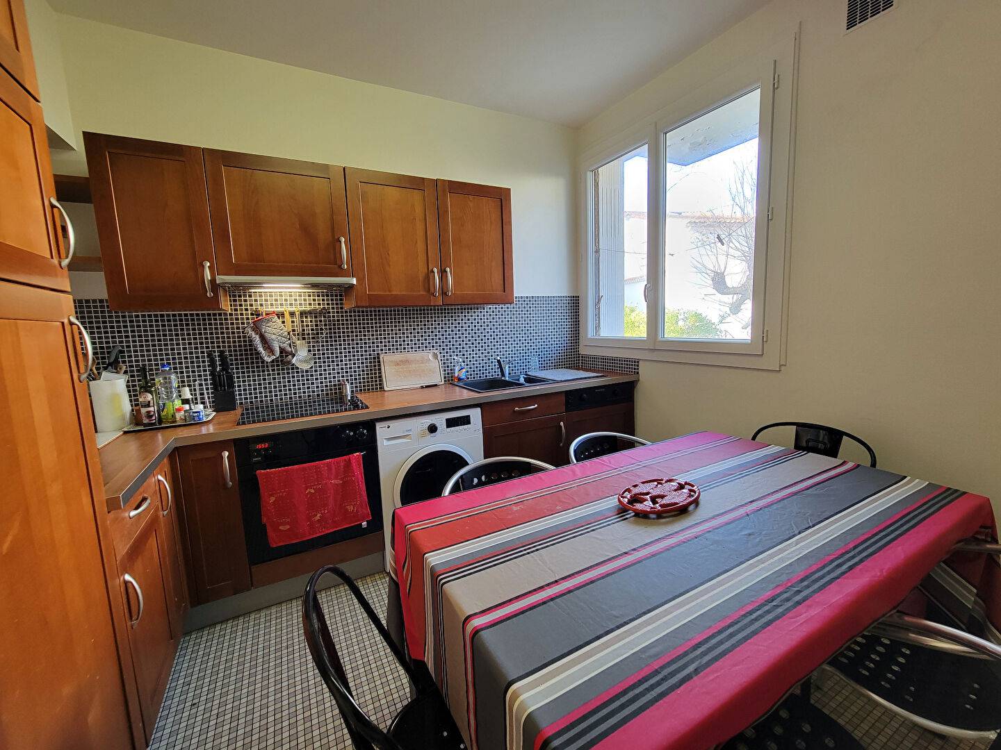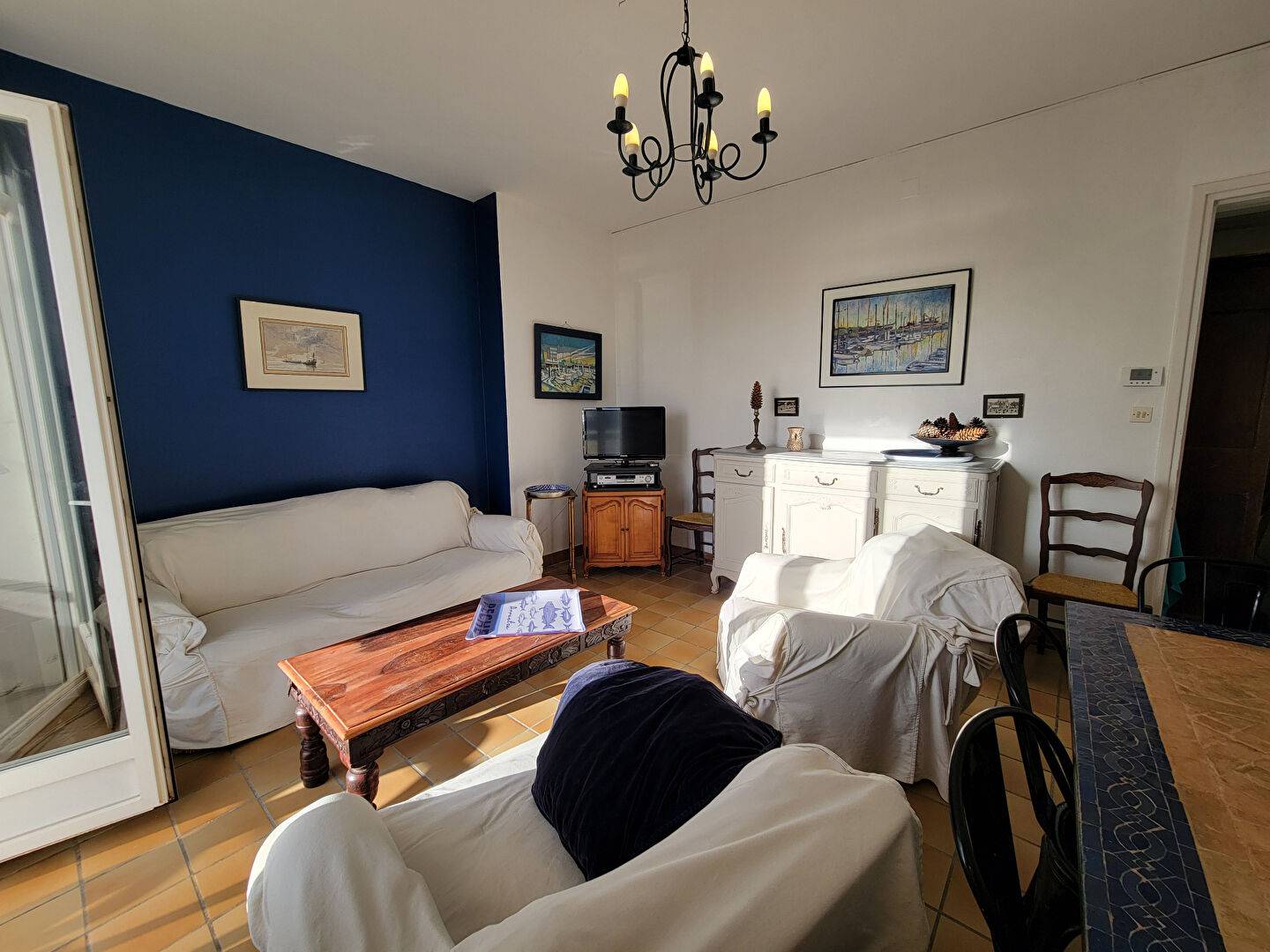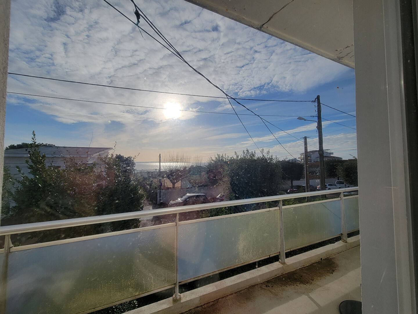 Hall d'entrée, pièce de vie avec coin repas et salon (canapé clic-clac) ouvert sur beau balcon ensoleillé avec vue mer, cuisine indépendant avec également un coin repas.