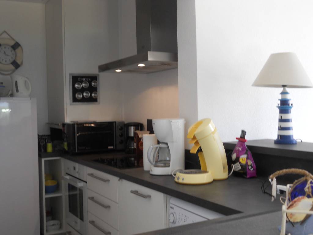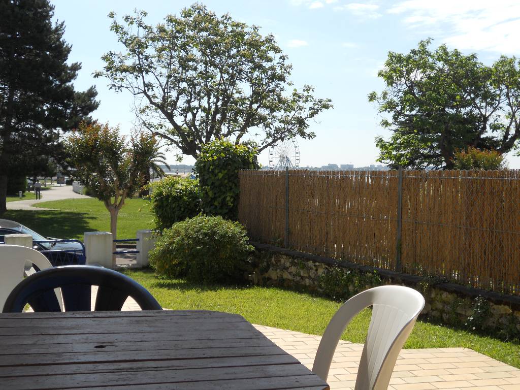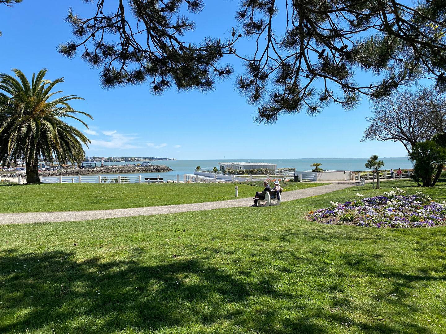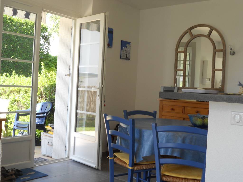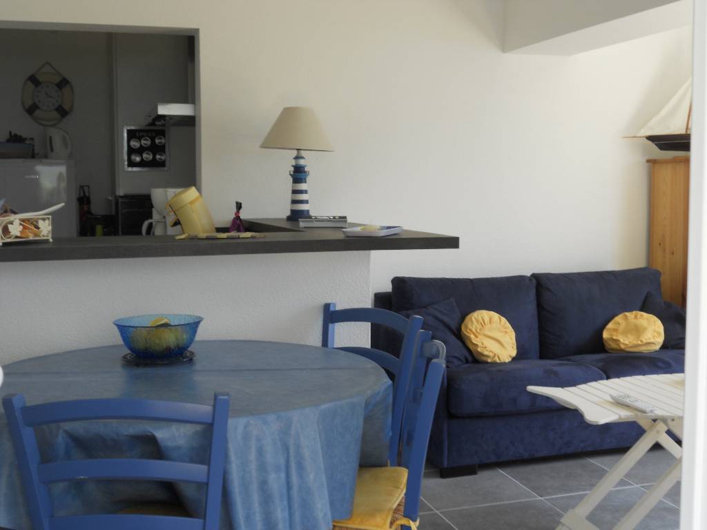 Entrée sur pièce de vie avec cuisine, le tout ouvrant sur une première terrasse avec bel vue sur mer et port de Royan.
