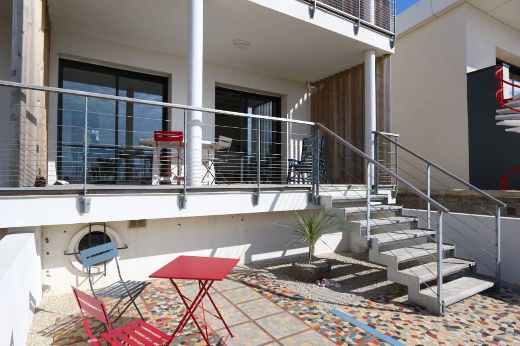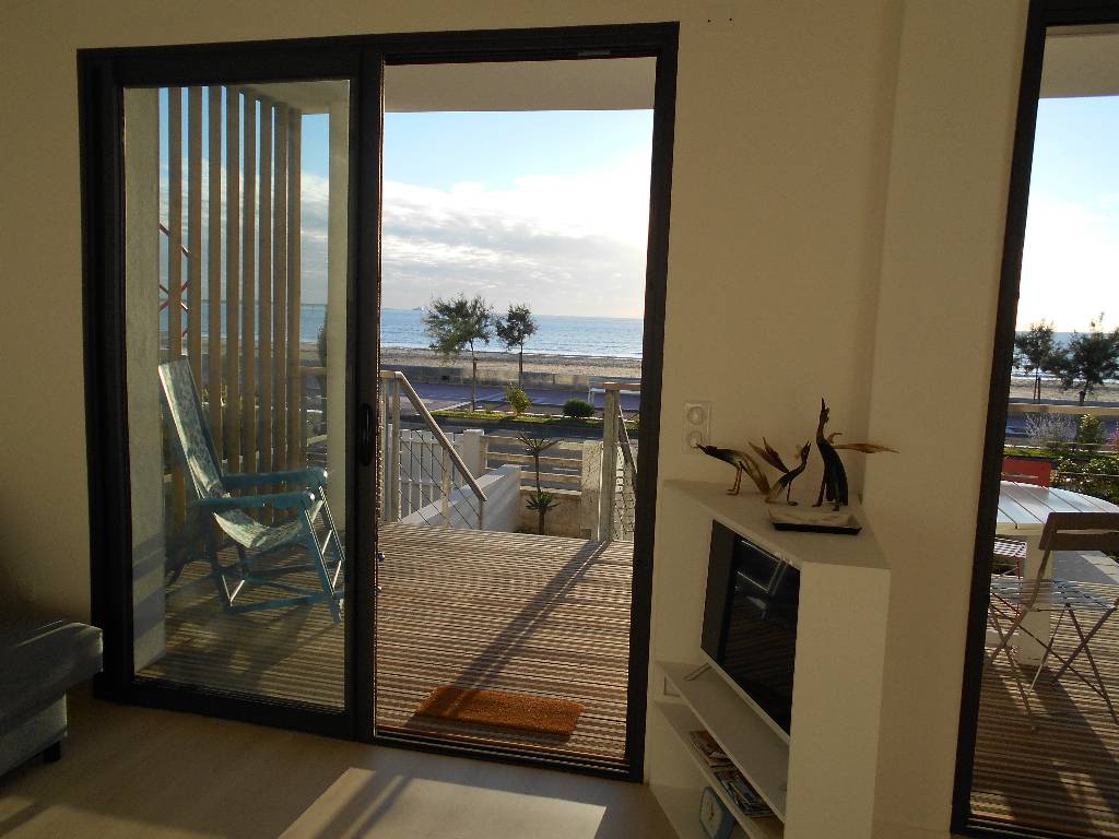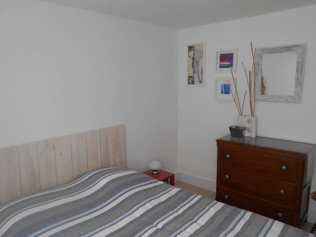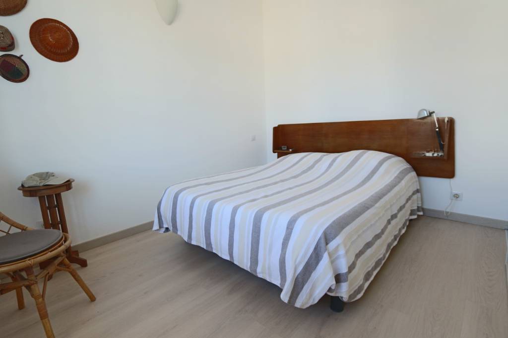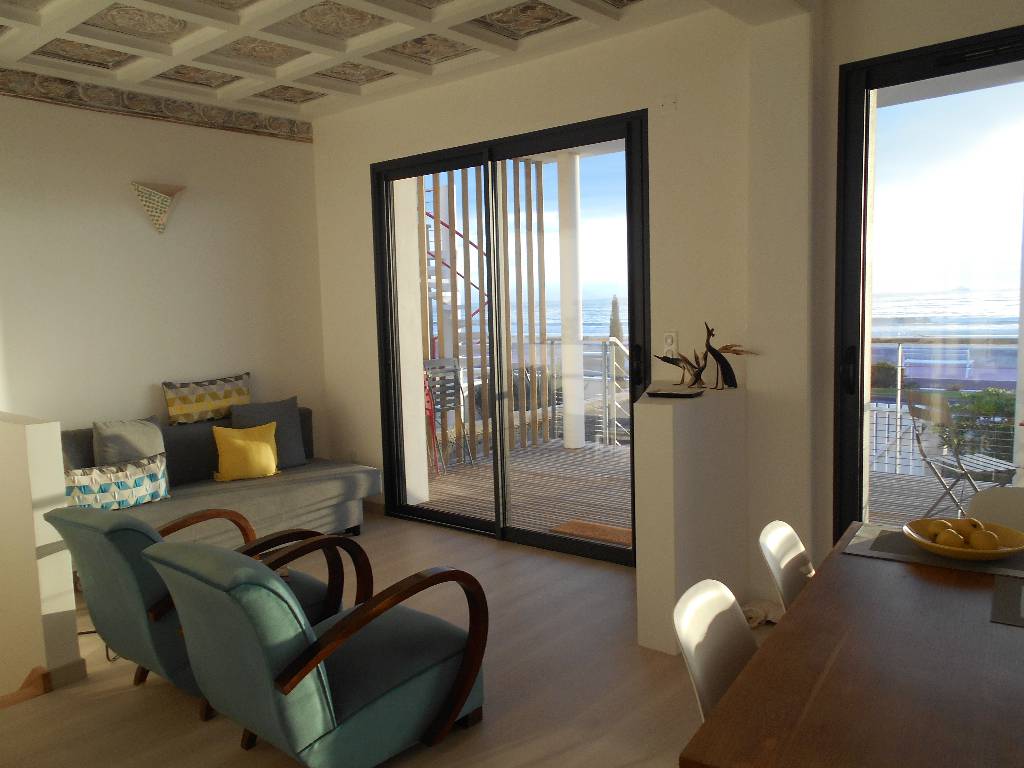 Un grand salon séjour très lumineux donnant sur grande terrasse en sud ouest et vue mer, une cuisine équipée, une chambre (lit 140).