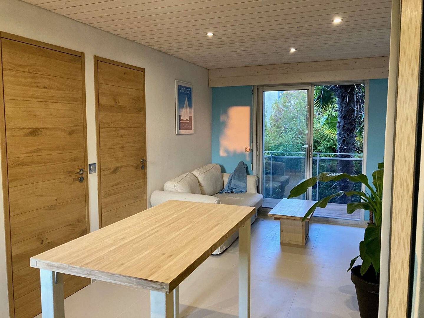 Balcon de 7 m2 en bois exotique et gazon avec jolie vue sur palmiers et végétation.