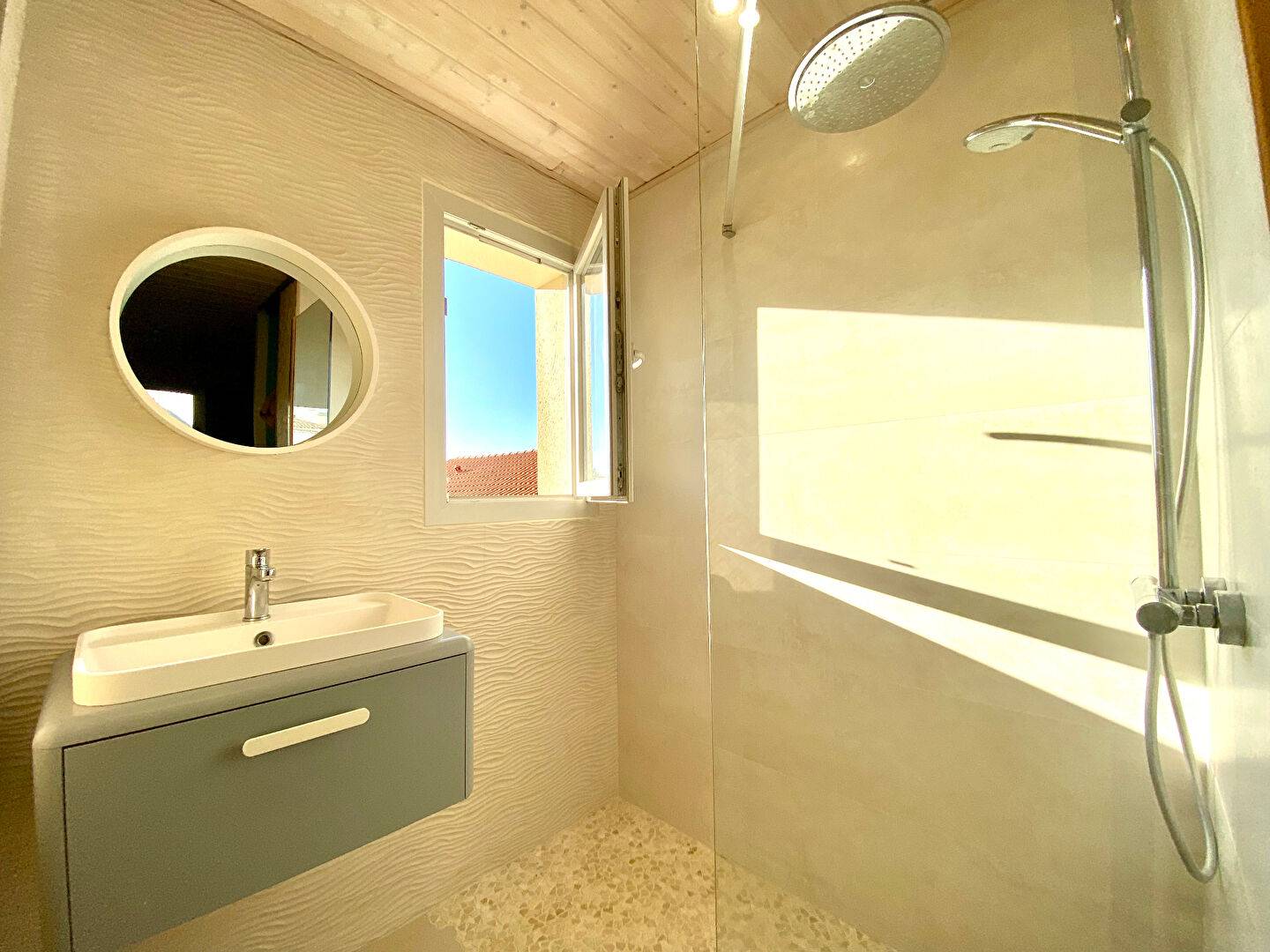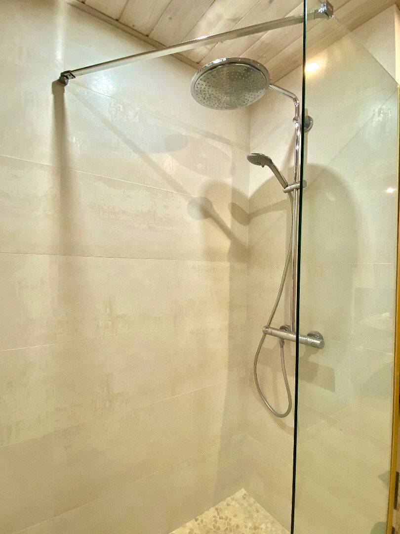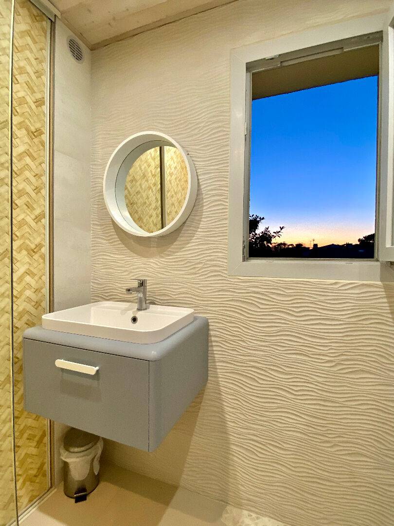 Salle de bain : meuble suspendu avec miroir rond, placard, douche à l'italienne avec sol en mosaïque, colonne de douche, sèche serviette.