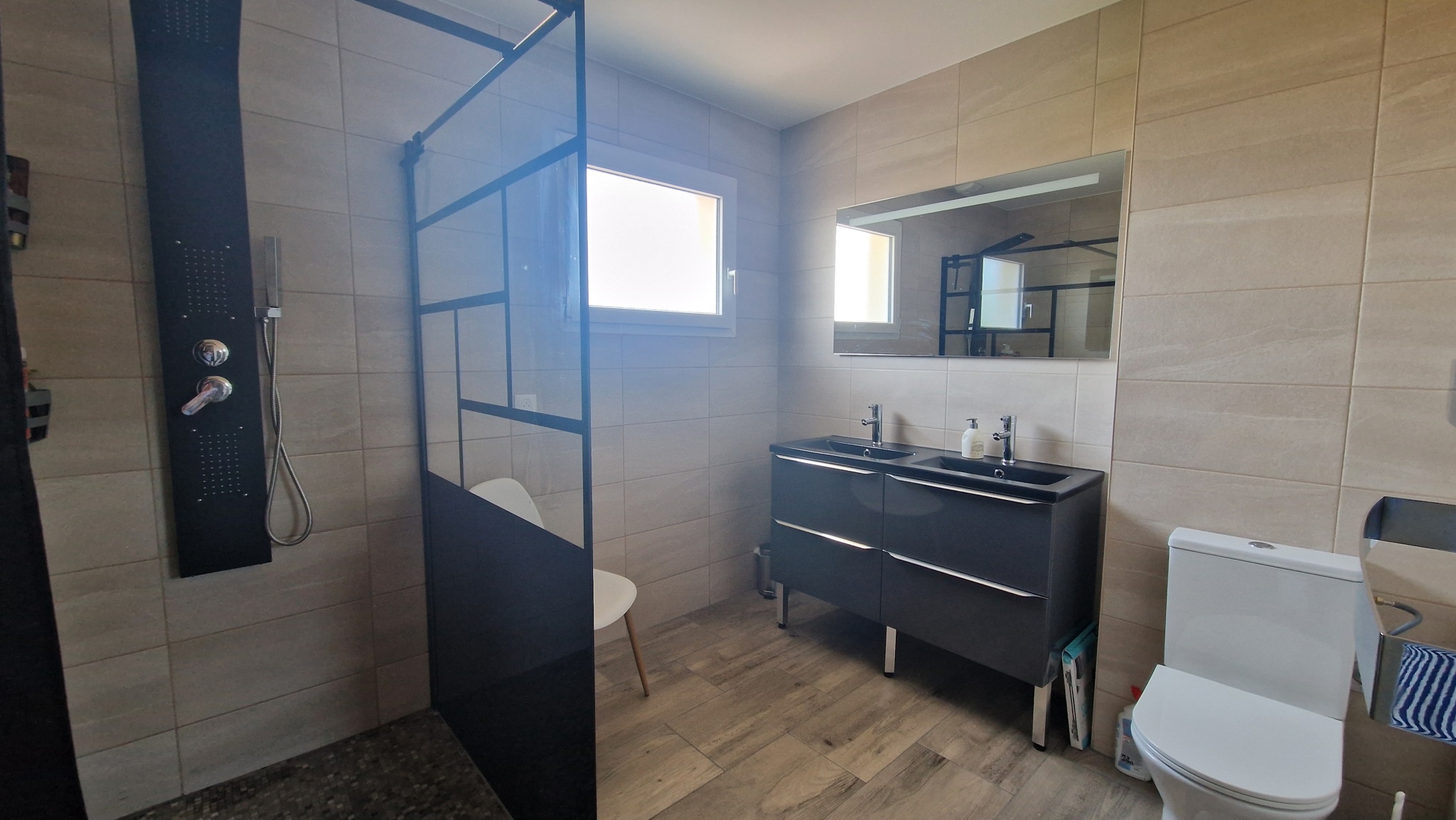 À l’étage, 3 chambres, une avec un lit de 140, une autre avec un lit de 160 et une troisième chambre avec des lits superposés et un lit de 140, TV dans toutes les chambres, salle d’eau avec colonne de douche, double vasque et wc, garage.