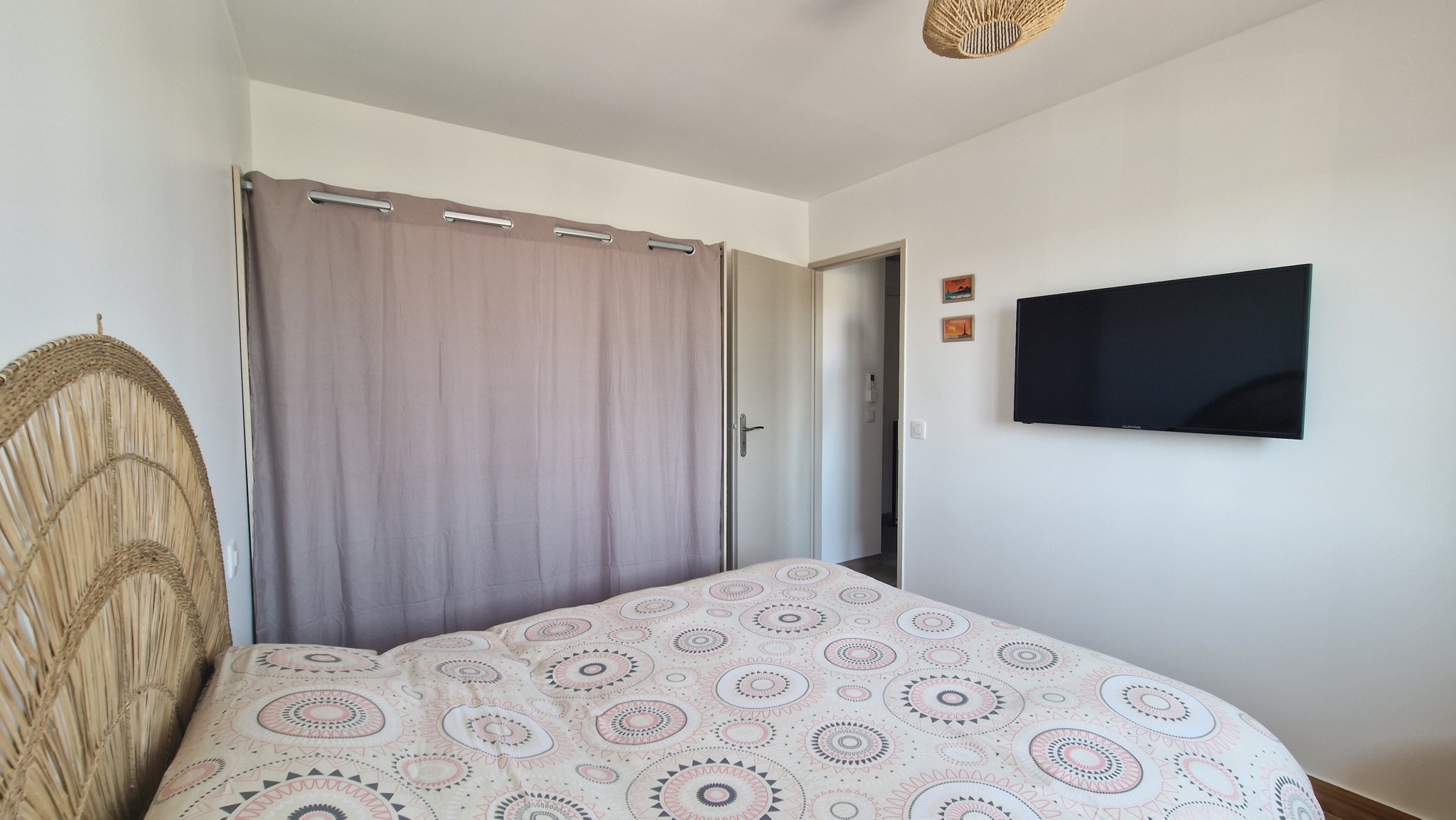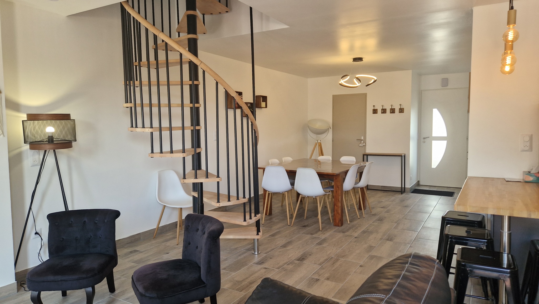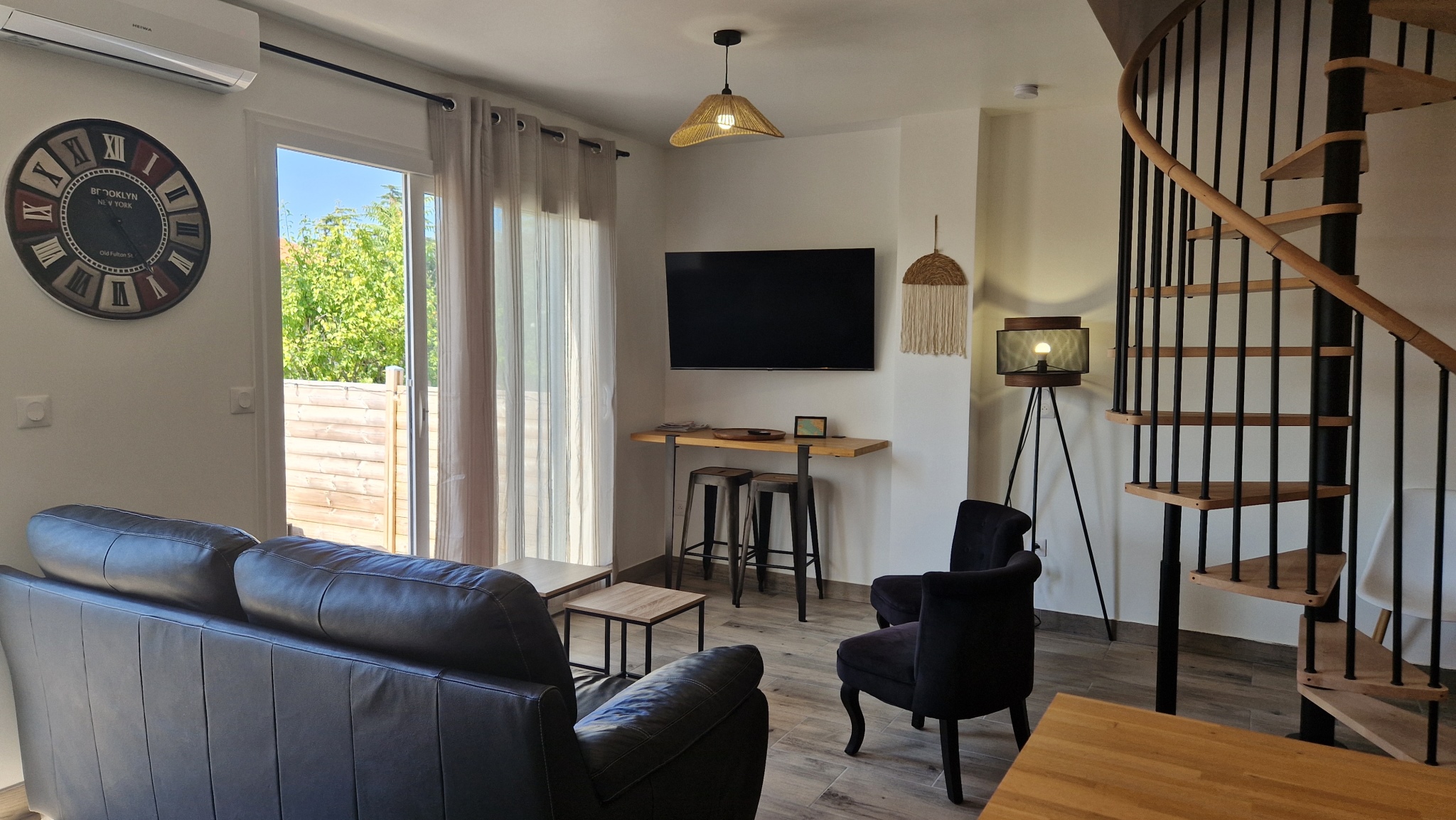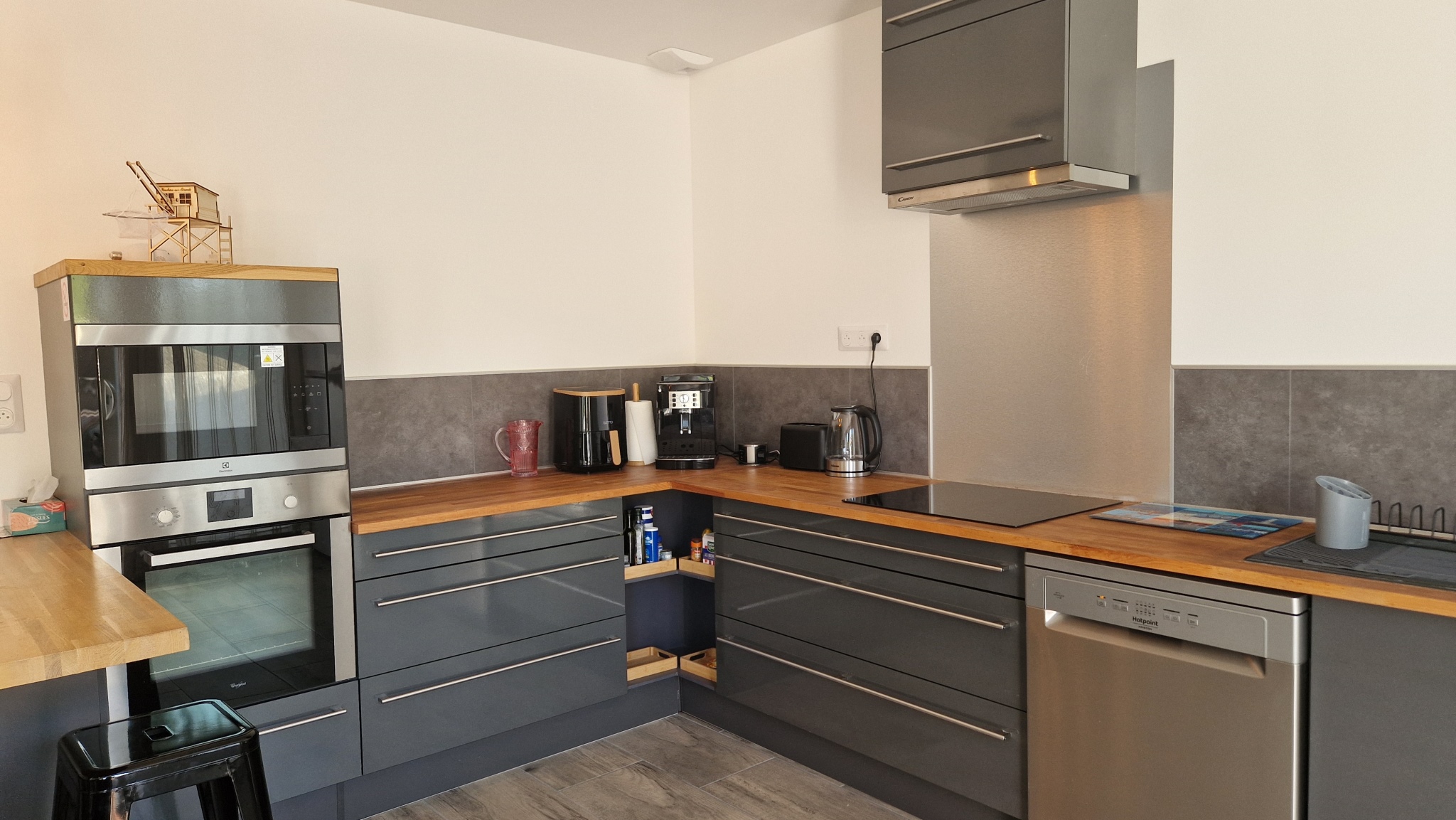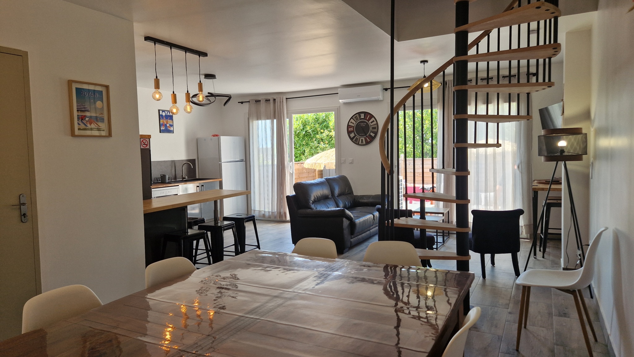 Une entrée, wc, séjour, cuisine équipée et aménagée (four, micro-ondes, lave-vaisselle, lave-linge, plaque induction, réfrigérateur avec congélateur, cafetière, bouilloire, grille-pain...) donnant accès à une belle terrasse de 56 m² avec salon de jardin, parasol et plancha.