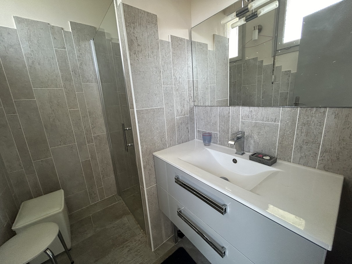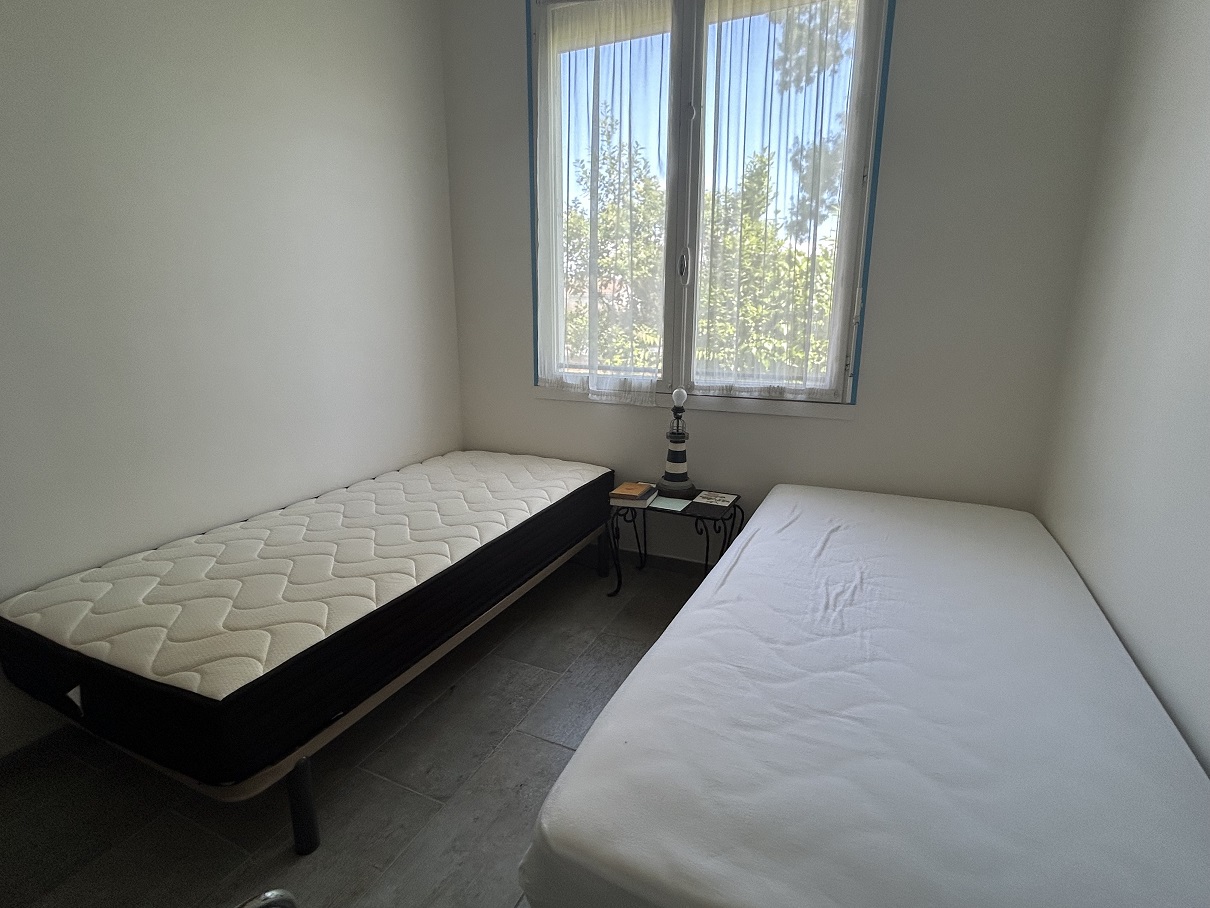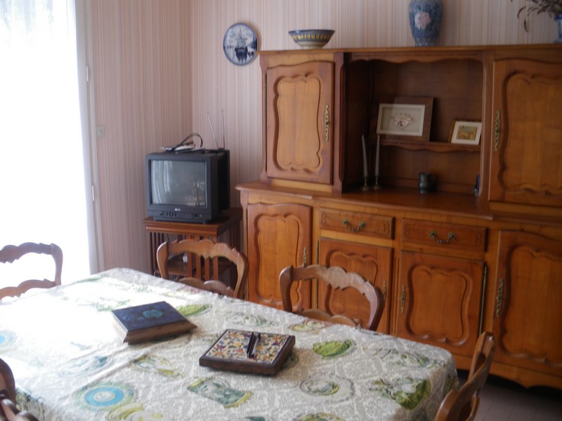 Maison en rez-de-chaussée mitoyenne à l'arrière, grand jardin clos, terrasse, parking partagé à l'avant du terrain. Séjour (TV), cuisine rénovée (lave-vaisselle, micro-ondes, four, 4 plaques), 2 chambres lits de 140, salle-d'eau rénovée/douche italienne, WC séparé. Cellier (lave-linge, réfrigérateur-freezer) 550m plage du bureau et centre