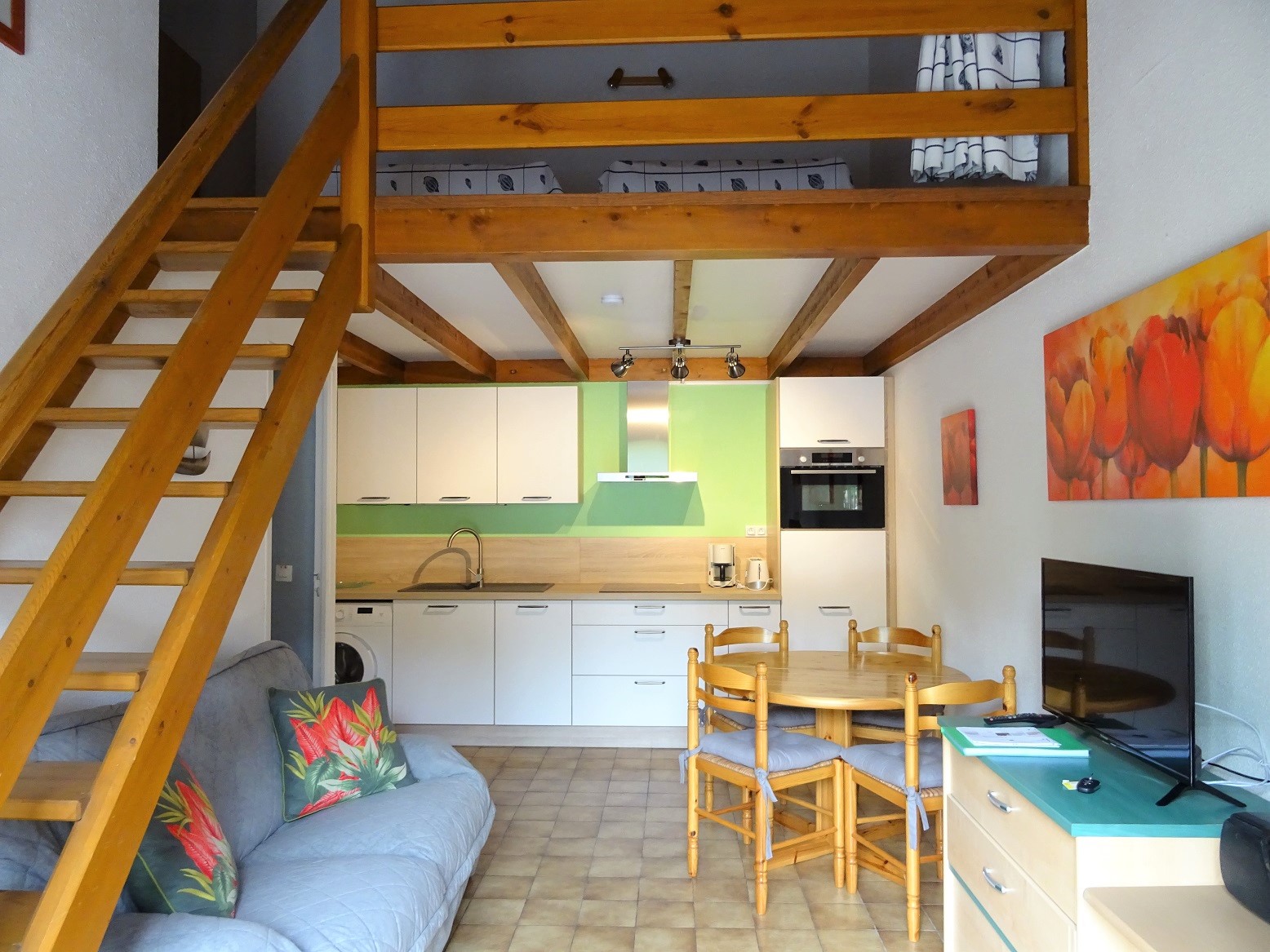 avec séjour(TV)/cuisine neuve (lave-vaisselle, lave-linge, plaques induction, combi four/micro-ondes, réfrigérateur/ congélateur), salle-d'eau/WC, 1 chambre lit 140.