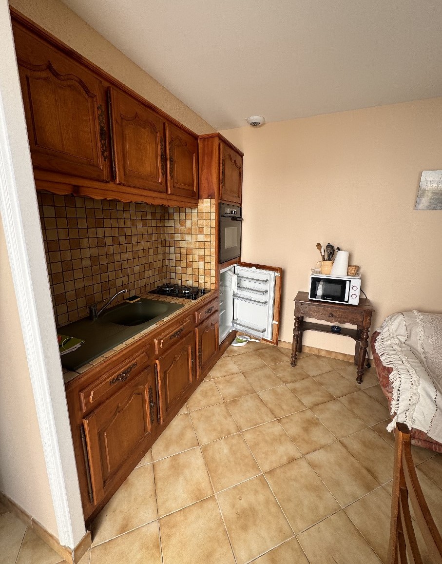 séjour(TV)/kitchenette (plaques gaz 2 feux, four et micro-ondes, frigo-top),