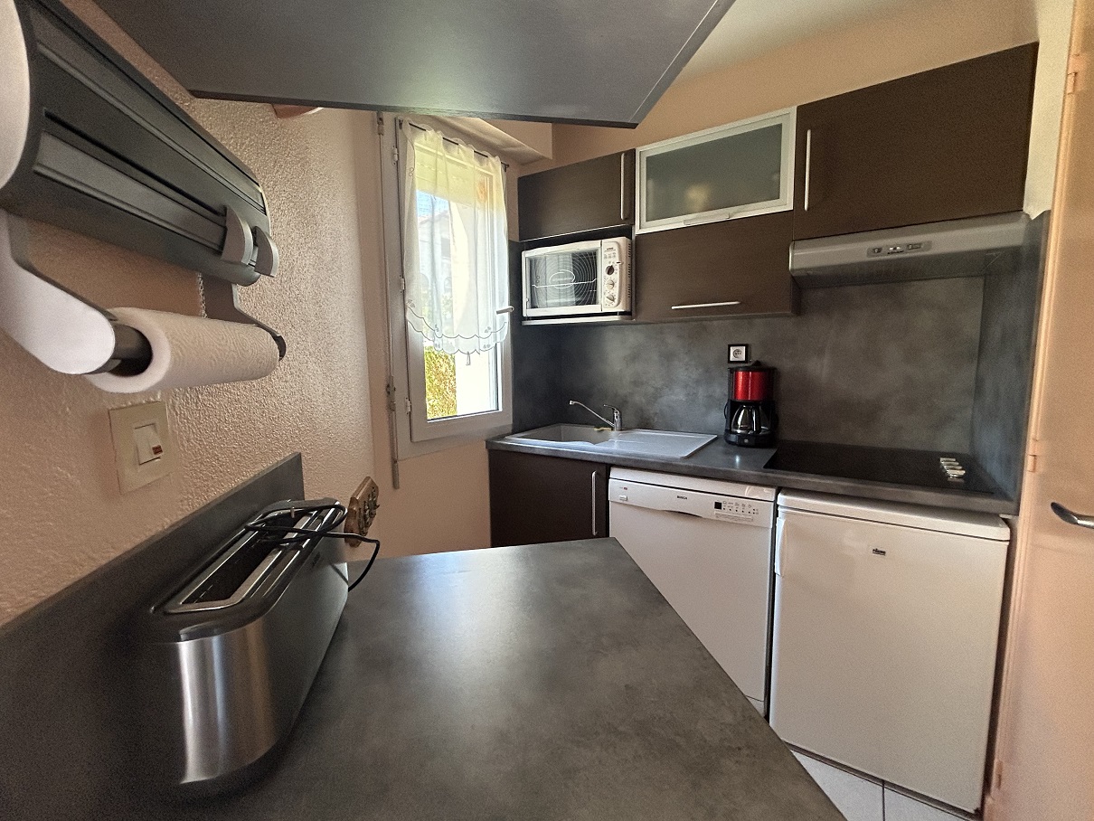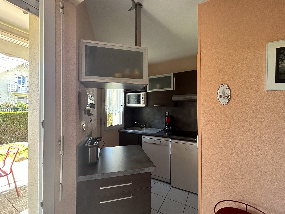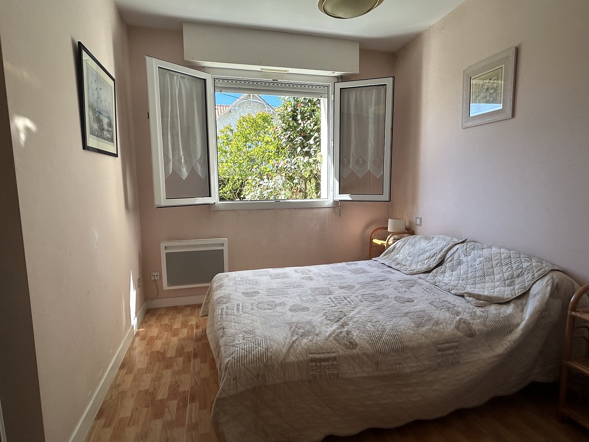Bel appartement rez-de-chaussée avec terrasse et jardinet. Petite résidence avec piscine collective. Proche plage du bureau (300m) et du centre. Comprenant: 1 chambre lit 140 et chauffeuse 80, salle-d'eau refaite, lave-linge dans placard, WC séparé, séjour (TV + canapé convertible 140) / kitchenette (réfrigérateur-top, lave-vaisselle, micro-ondes, four, plaques vitro-céramique).