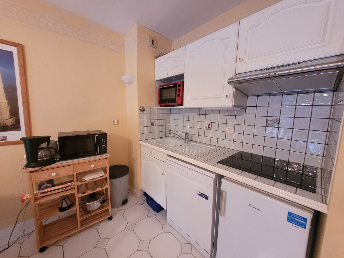 Appartement rez-de-jardin avec 2 terrasses et jardinet non clos. Petite résidence avec piscine collective. Proche plage du bureau (300m) et du centre. Comprenant: 1 chambre lit 140 et petite terrasse, salle-de-bains, lave-linge dans placard, WC séparé, séjour (TV + canapé convertible 140) / kitchenette (frigo-top, lave-vaisselle, micro-ondes, petit four, 3 plaques vitro-céramique + hotte neuves, grille-pain, cafetière).