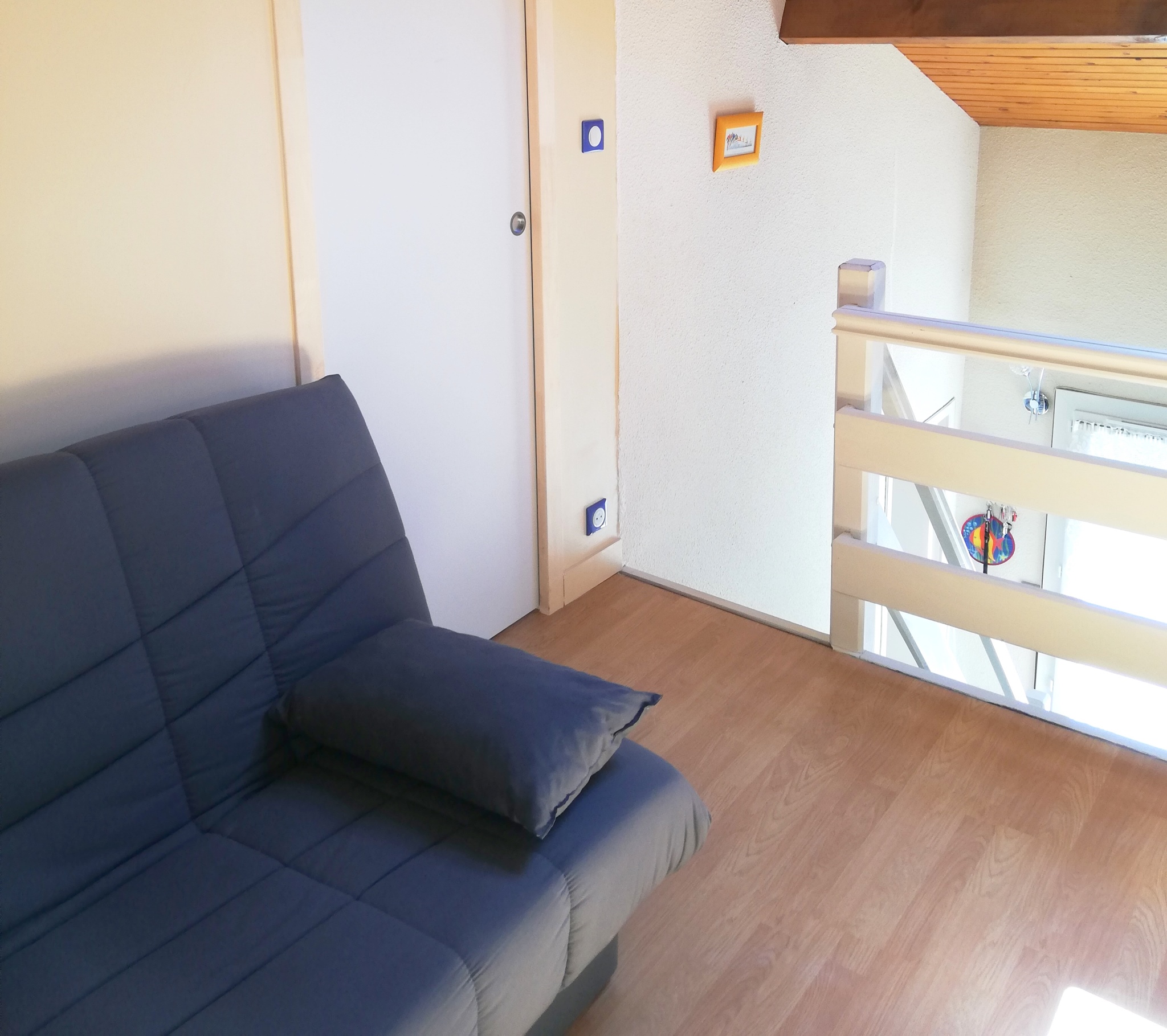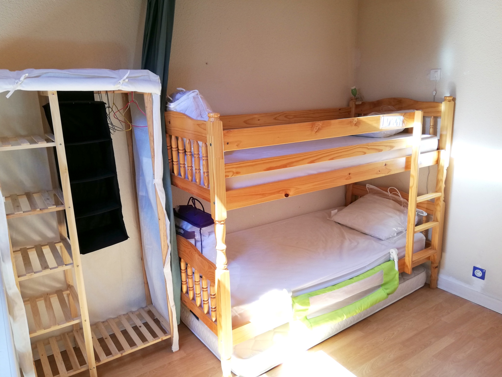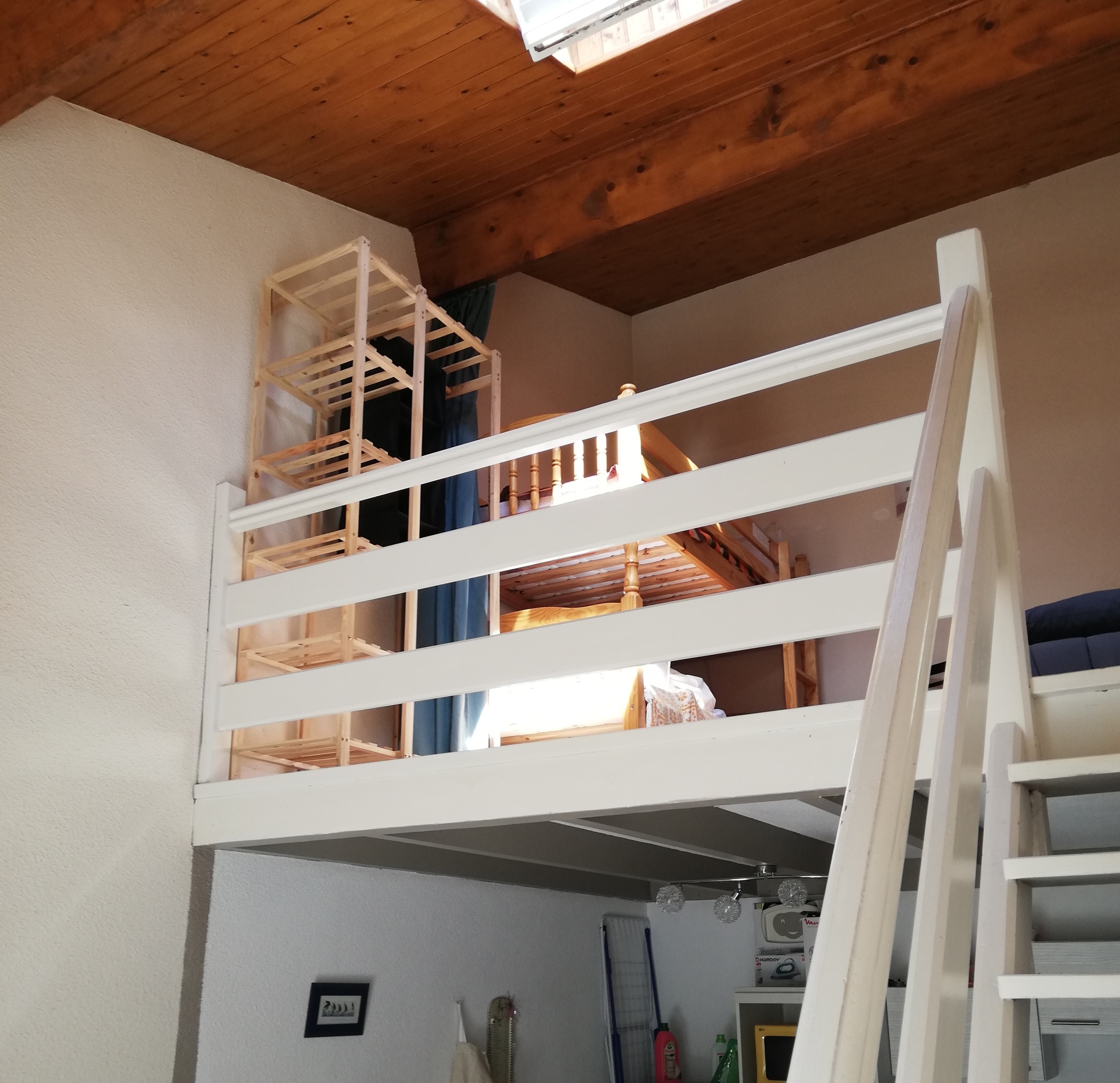 A l'étage : 1 chambre avec 1 lit 140 (2 pers) + une penderie, une mezzanine avec un coin nuit, d'un côté 2 lits 90 superposés (2 pers) et de l'autre 1 clic-clac (1 pers)+ rangements. Jardin, cabanon.