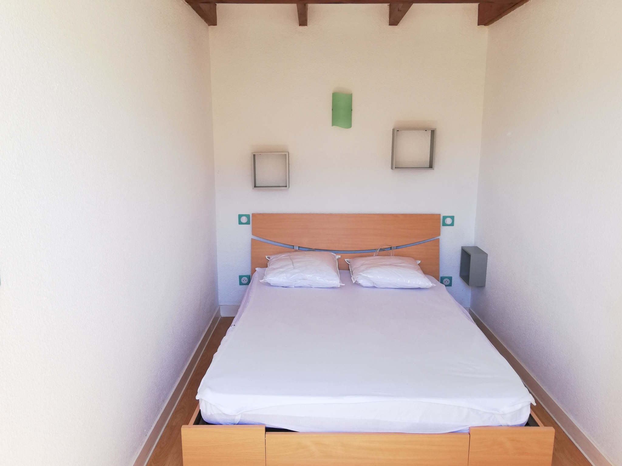Au rdc : un séjour/salon avec canapé + TV et une cuisine équipée (lave linge, four, micro-onde, cafetière) ouvrant sur terrasse/jardinet, une chambre avec 1 lit 140 (2 pers), une salle d'eau avec WC.