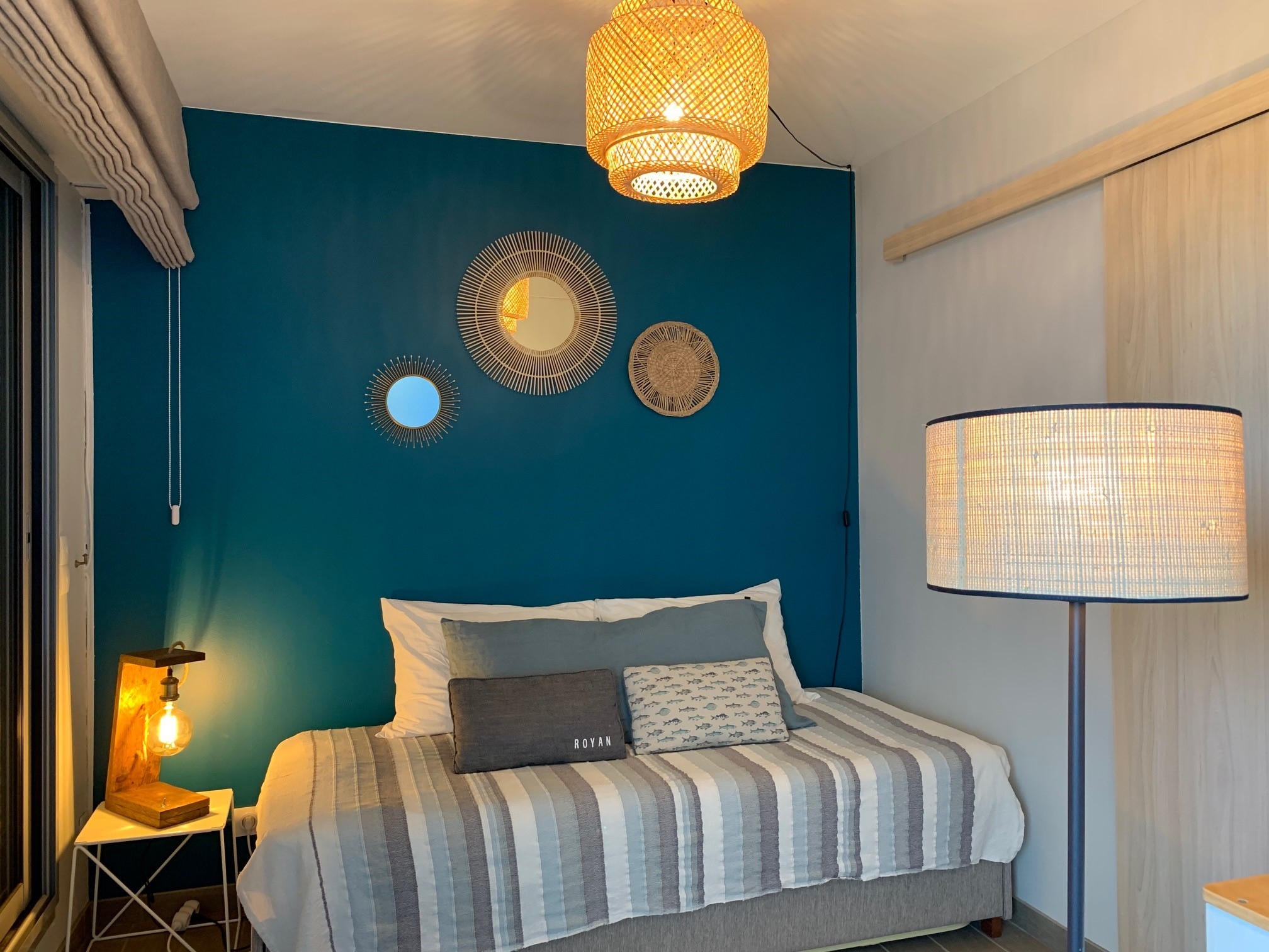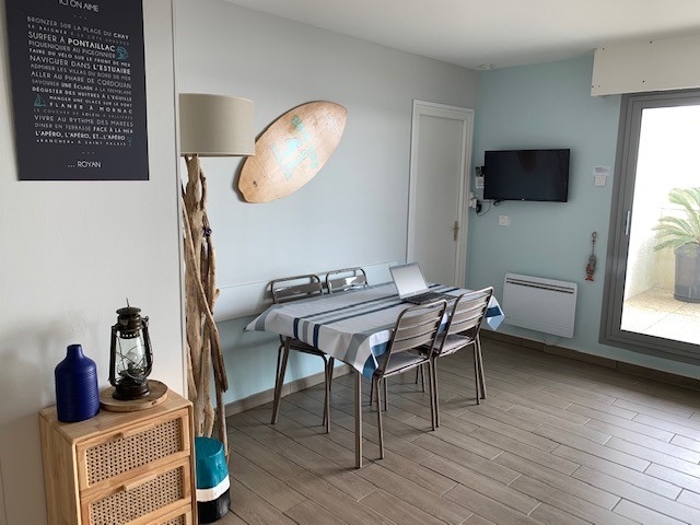A 50 m de la plage du Chay et du Centre de Thalassothérapie de ROYAN, très bel appartement tout confort 3 pièces VUE MER rénové avec goût comprenant : cuisine américaine équipée (four, MO, plaque, hotte, LV, frigo/congel), séjour/salon (table, canapé, TV), ouvrant sur une grande terrasse avec vue mer (store, mobilier de terrasse), une suite parentale (lit 160, commode) avec sa salle d'eau et son wc, (lave-linge, sèche-linge, placard), chambre 2 avec 1 lit gigogne (2 lits 1 pers. 90) + salle d'eau avec placard. WC séparé avec lave-mains. Prestations de qualité. WIFI. Parking commun. Animaux non admis