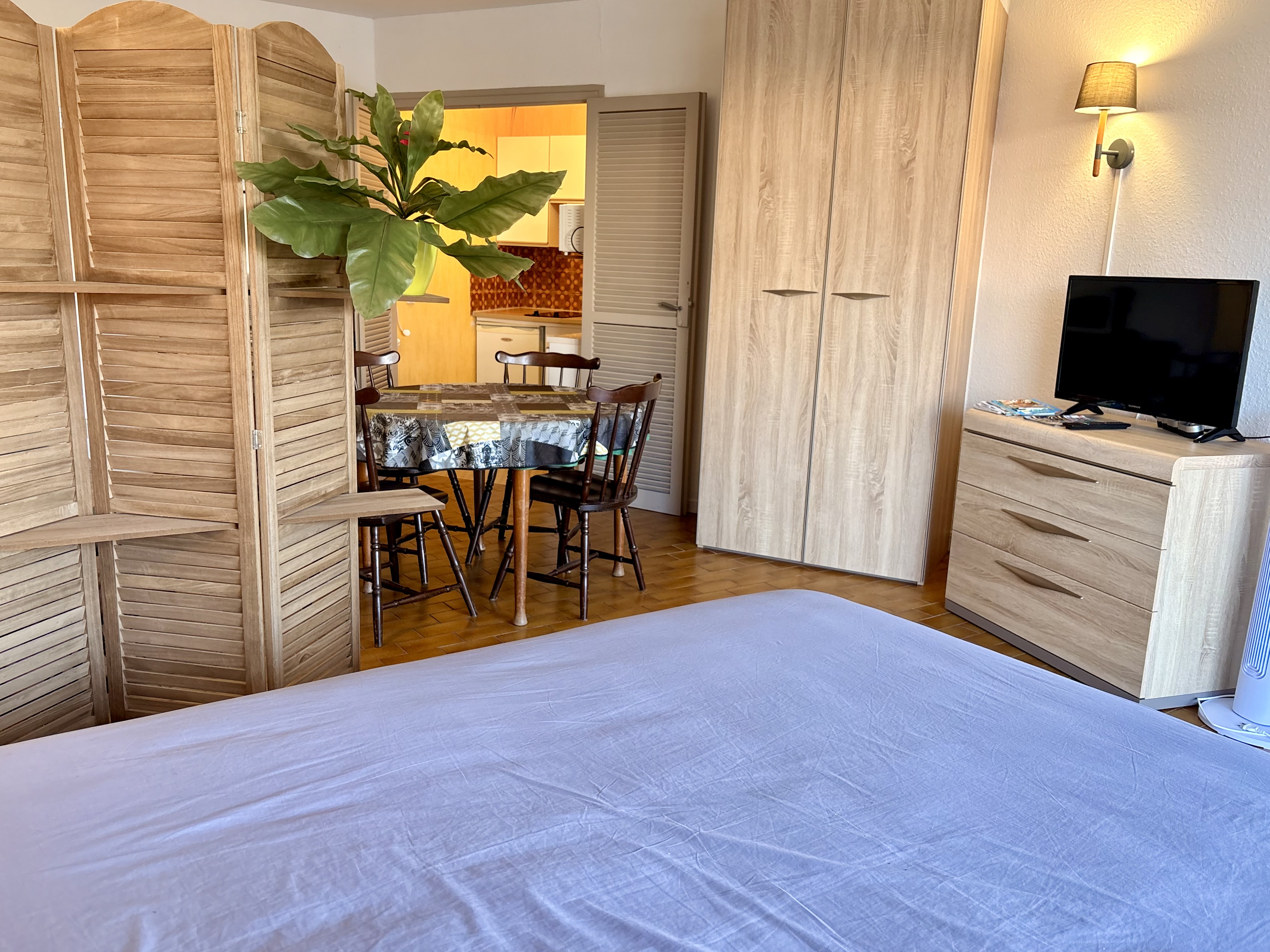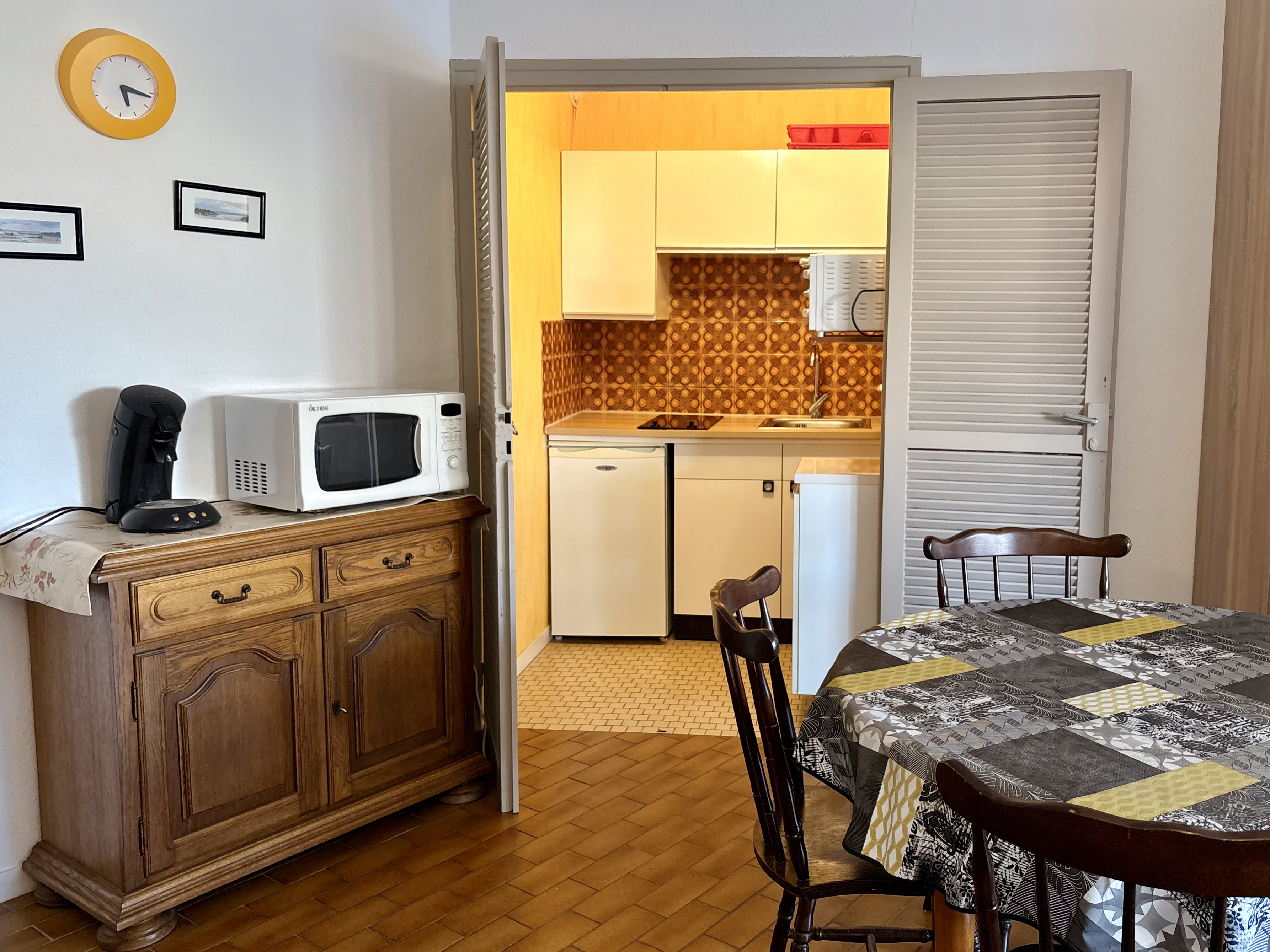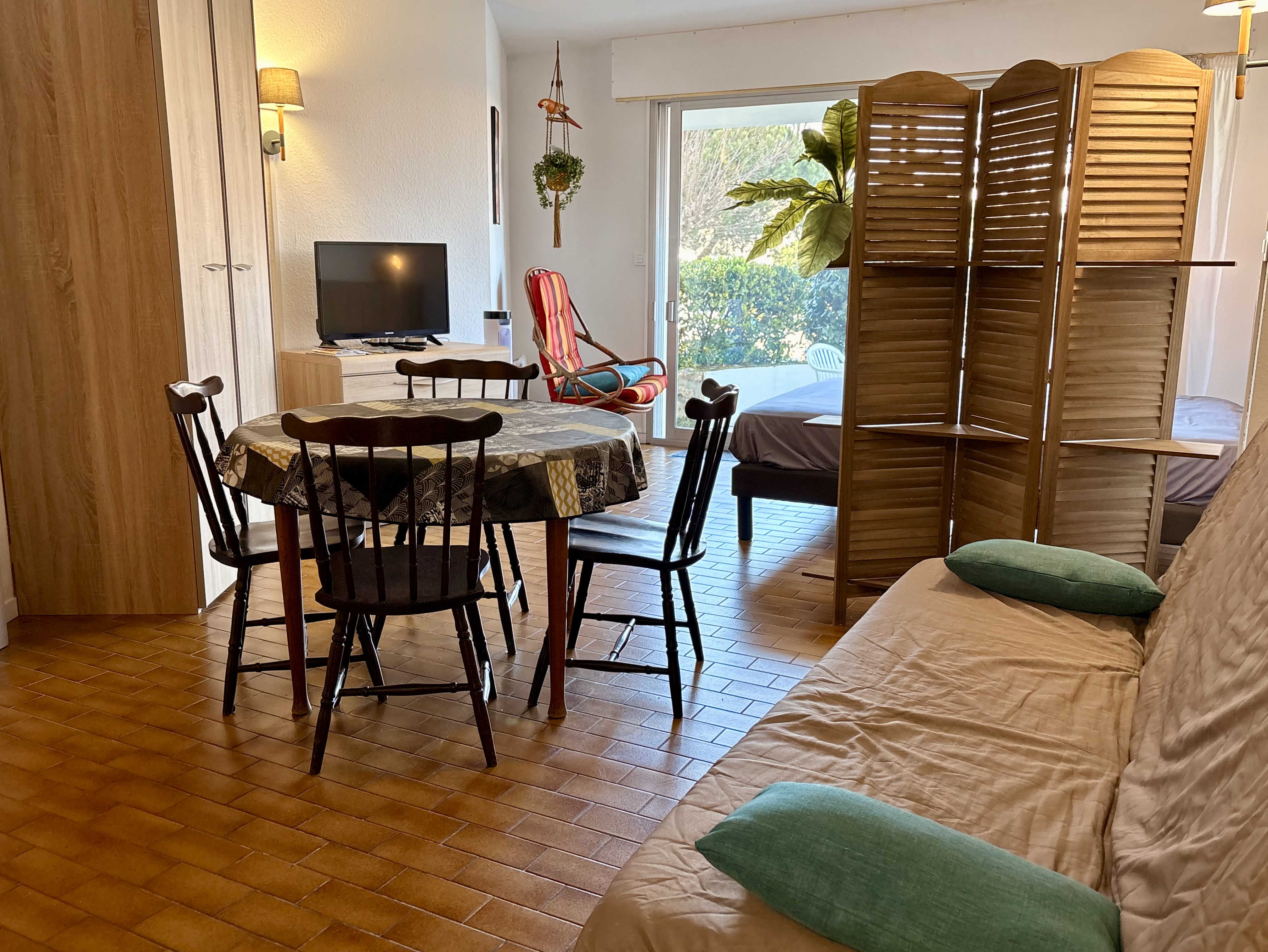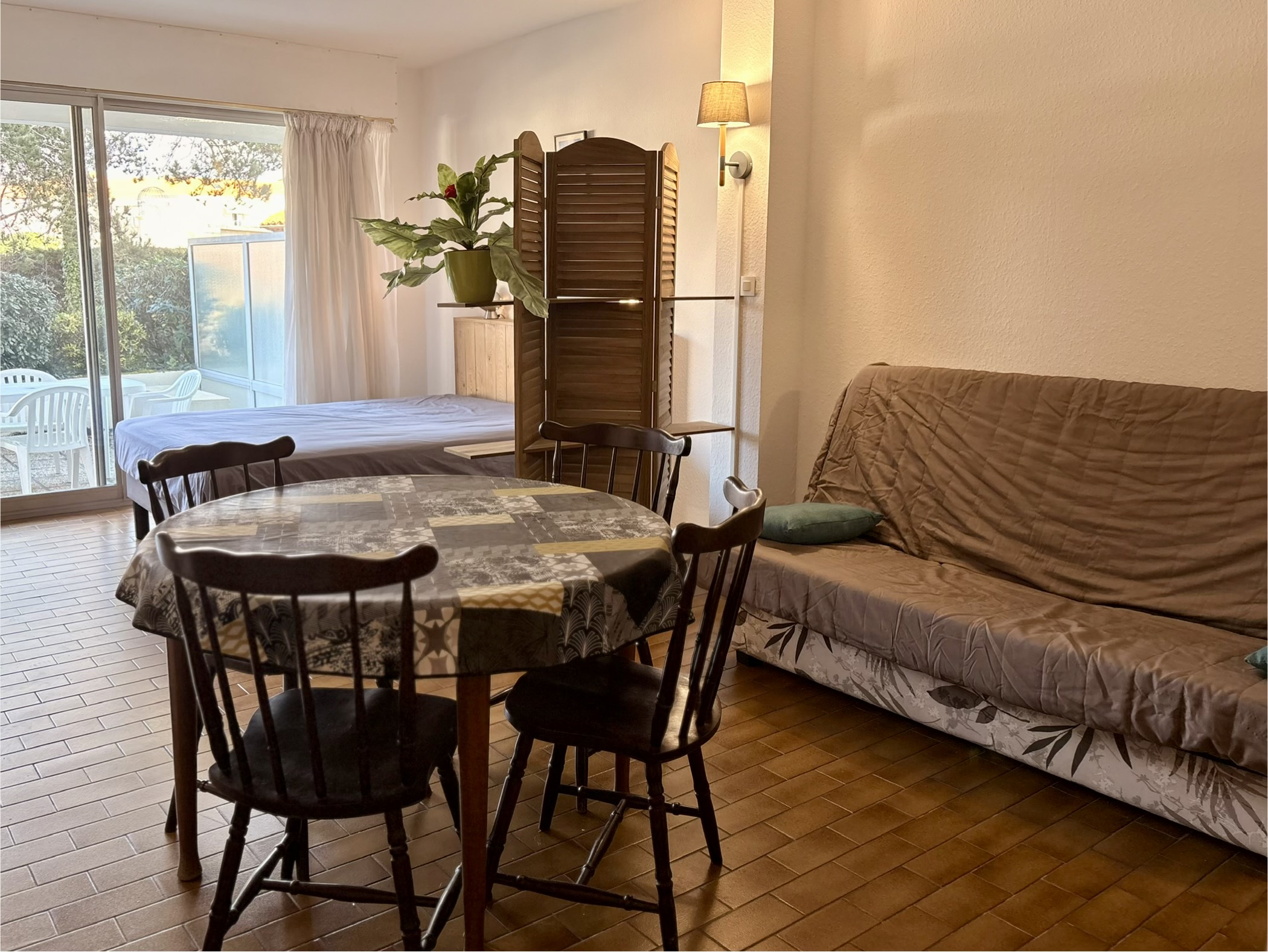 VAUX SUR MER. Dans résidence sécurisée de bord de mer, à 200 m de la plage, du casino et des commerces de ROYAN Pontaillac, Grand studio en RDC comprenant : entrée, WC séparé, salle de bain, placard, une pièce de vie avec coin séjour , (une table + 4 chaises, un clic-clac) ainsi qu'un coin cuisine (micro-onde, frigo top, mini-four, cafetière...) un espace nuit (lit 140, armoire...) ouvrant sur une belle terrasse (salon de jardin, accès extérieur). Volet roulant électrique.