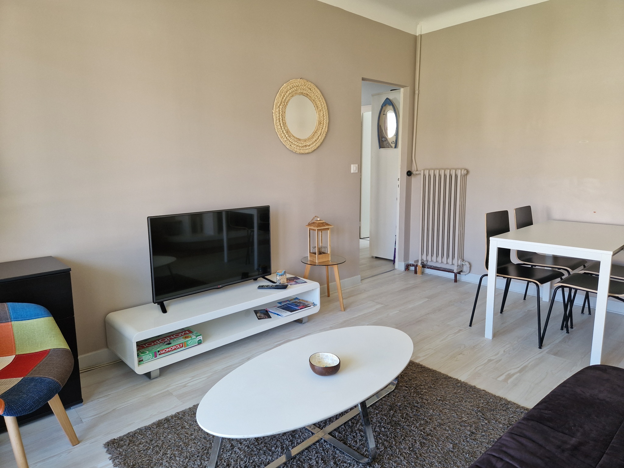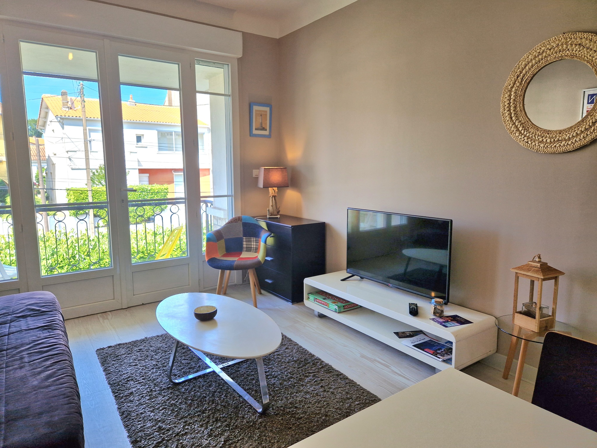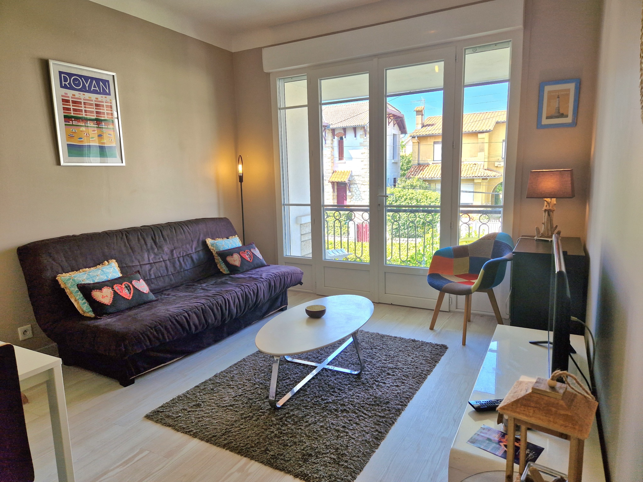 ROYAN, à 300m de la plage et 600 m des commerces, T2 de 56m² comprenant : entrée, wc séparé, placard, une pièce de vie lumineuse avec séjour salon et balcon (canapé convertible, table et chaises, TV) une cuisine équipée et indépendante (micro onde multifonction, frigo, hotte aspirante, évier/mitigeur) avec aperçu mer,1 chambre spacieuse (lit de 140). salle de bain (baignoire, bidet, meuble et vasque, lave linge).