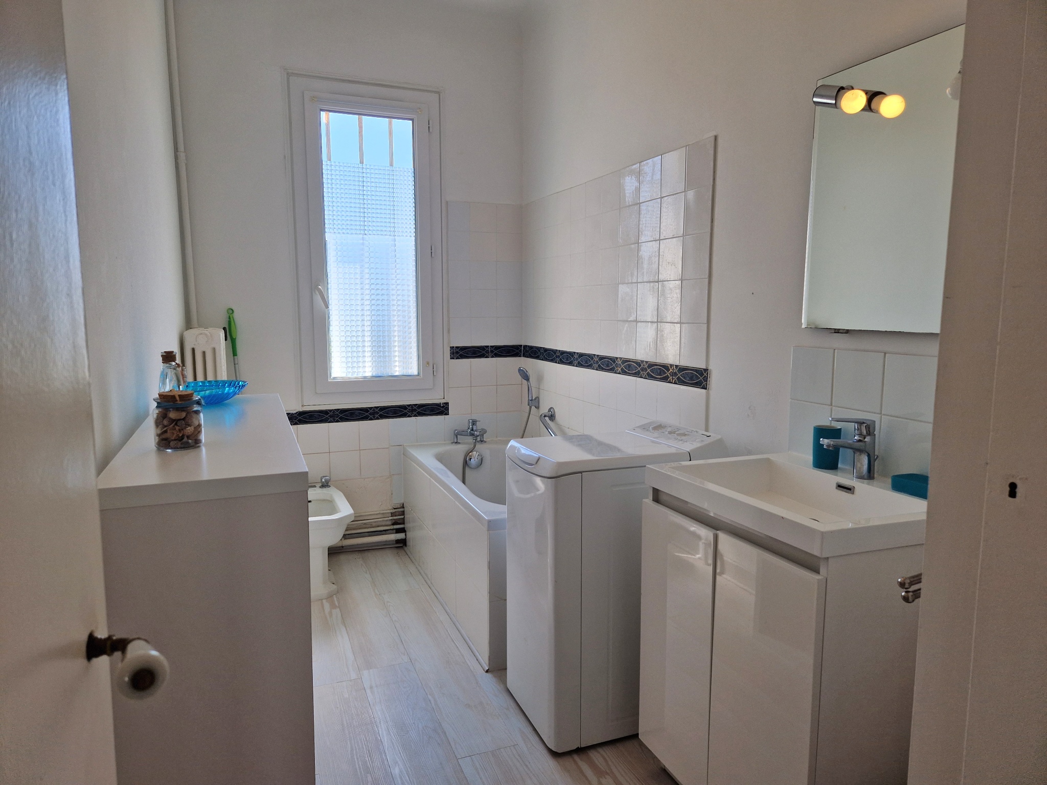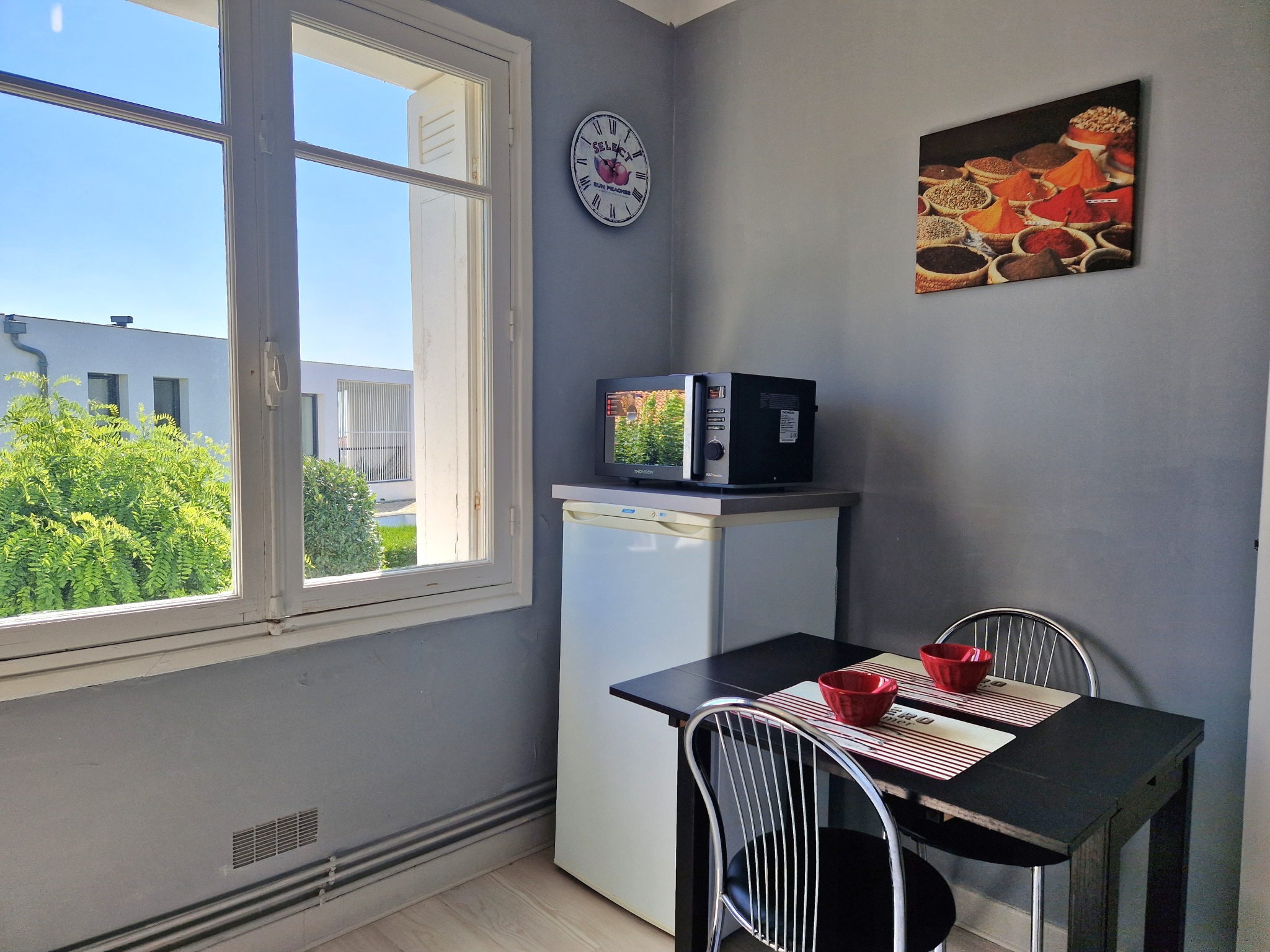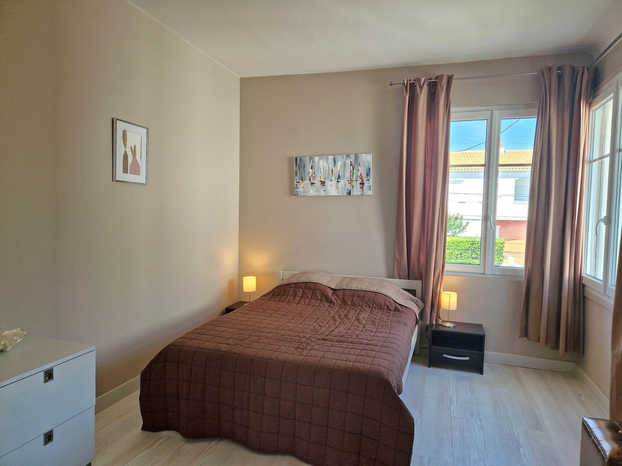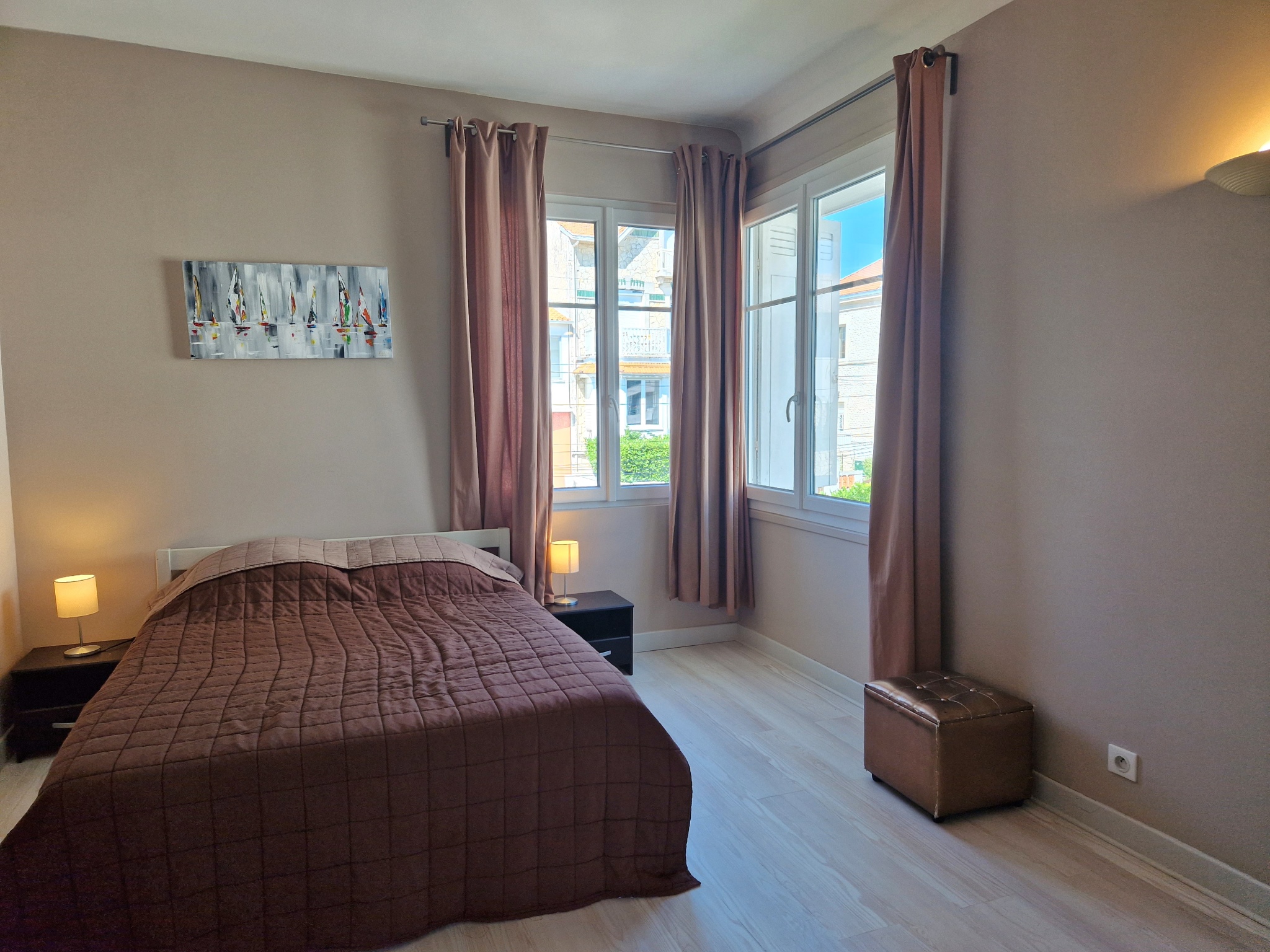 ROYAN, à 300m de la plage et 600 m des commerces, T2 de 56m² comprenant : entrée, wc séparé, placard, une pièce de vie lumineuse avec séjour salon et balcon (canapé convertible, table et chaises, TV) une cuisine équipée et indépendante (micro onde multifonction, frigo, hotte aspirante, évier/mitigeur) avec aperçu mer,1 chambre spacieuse (lit de 140). salle de bain (baignoire, bidet, meuble et vasque, lave linge).