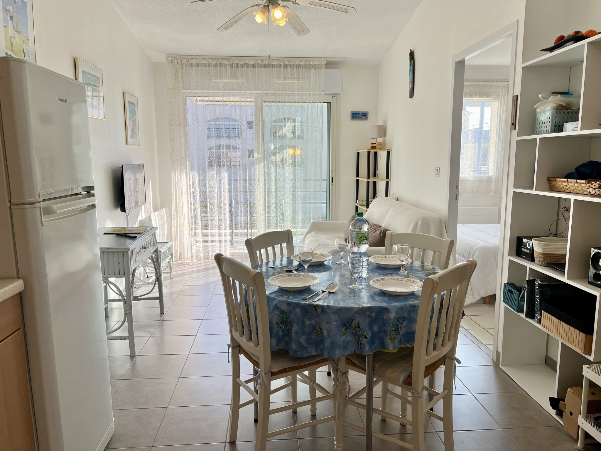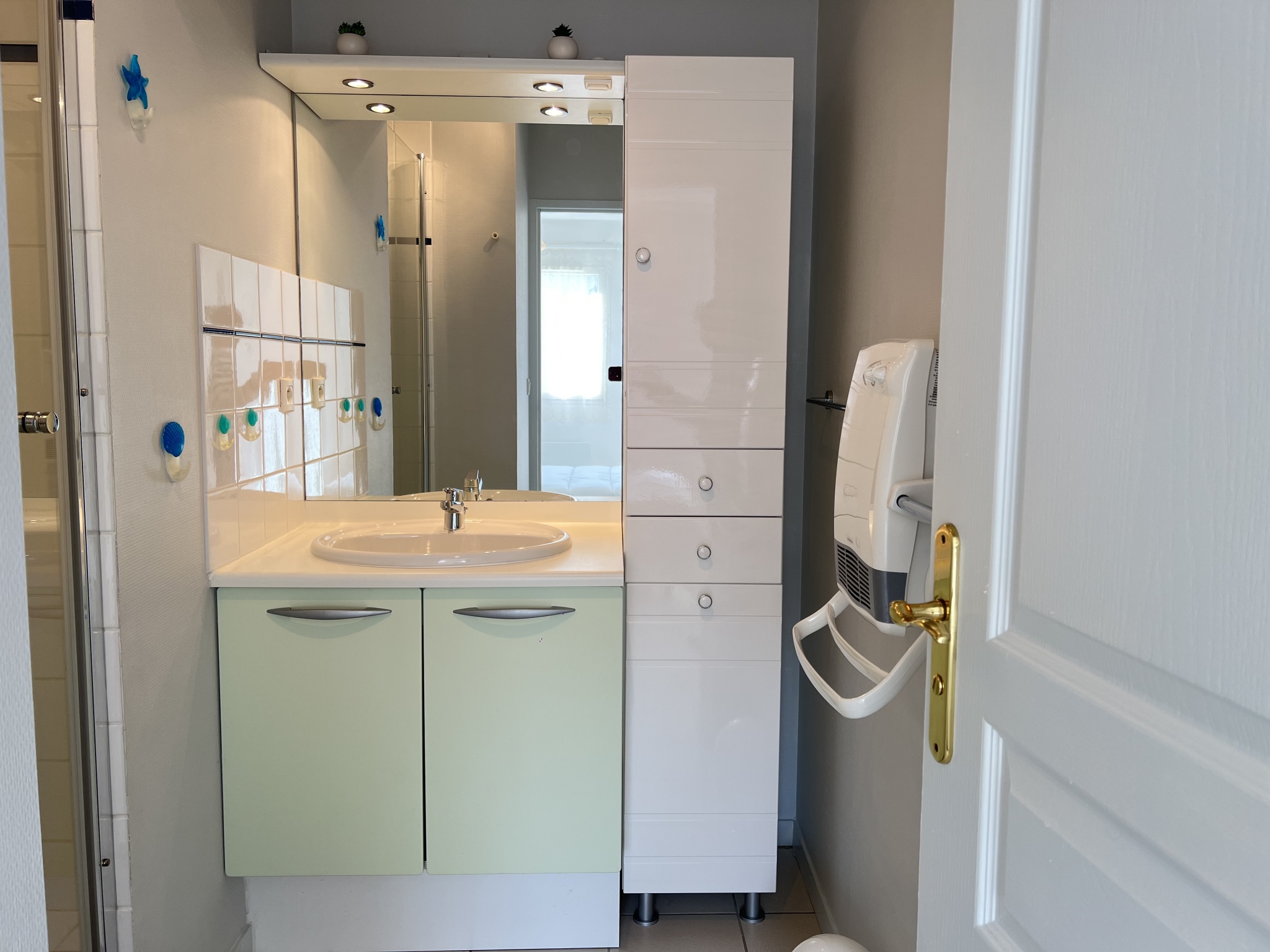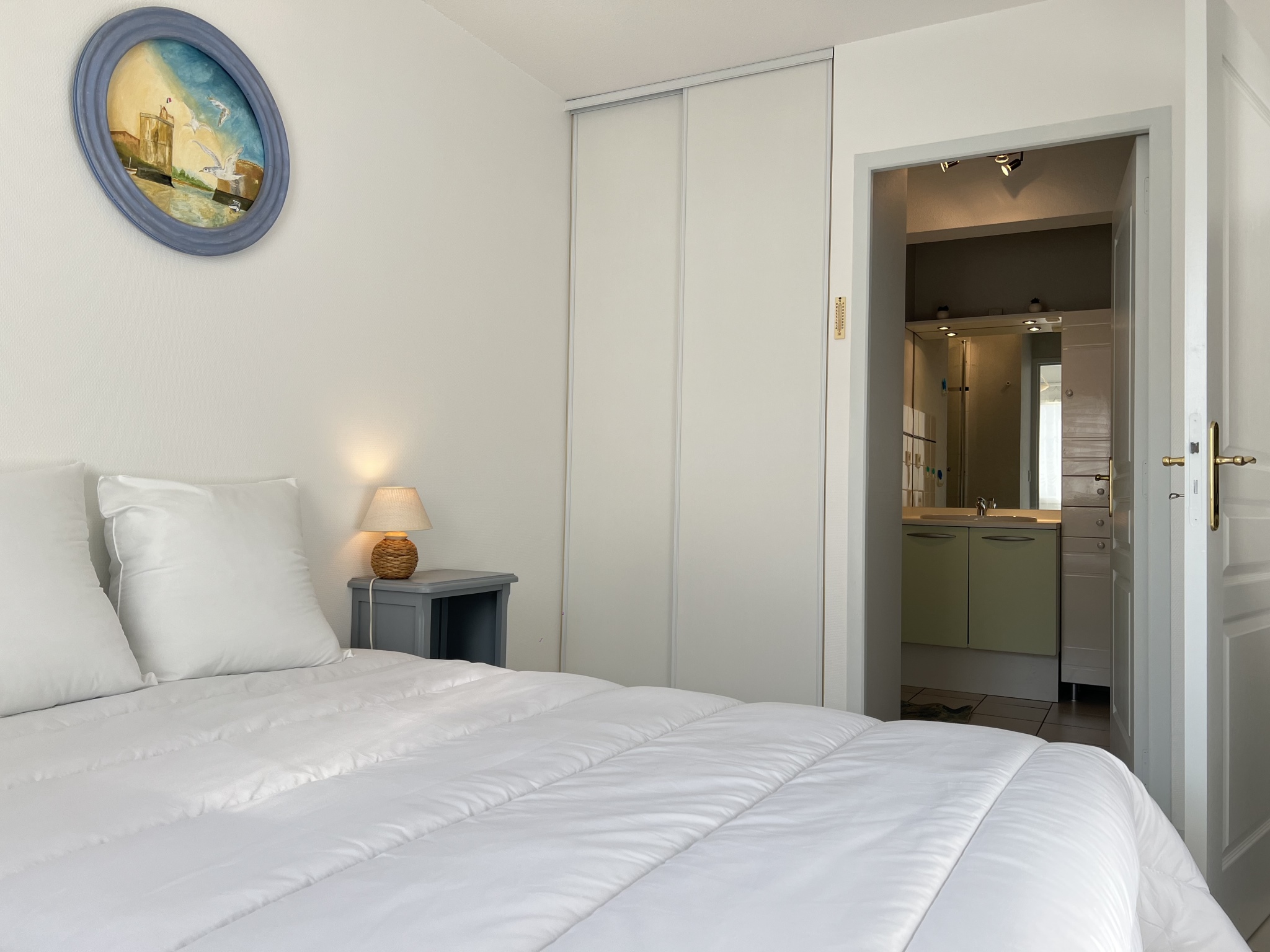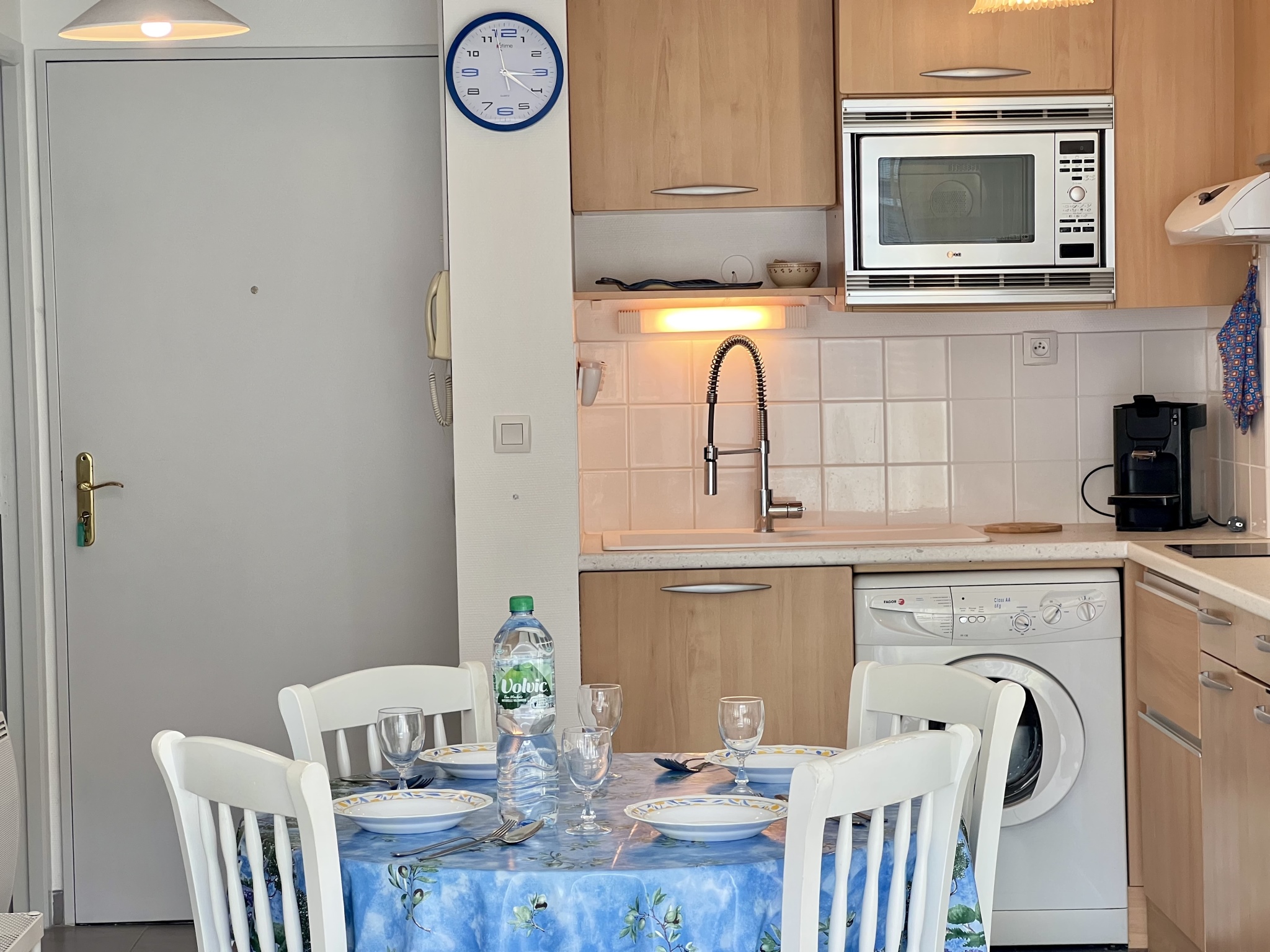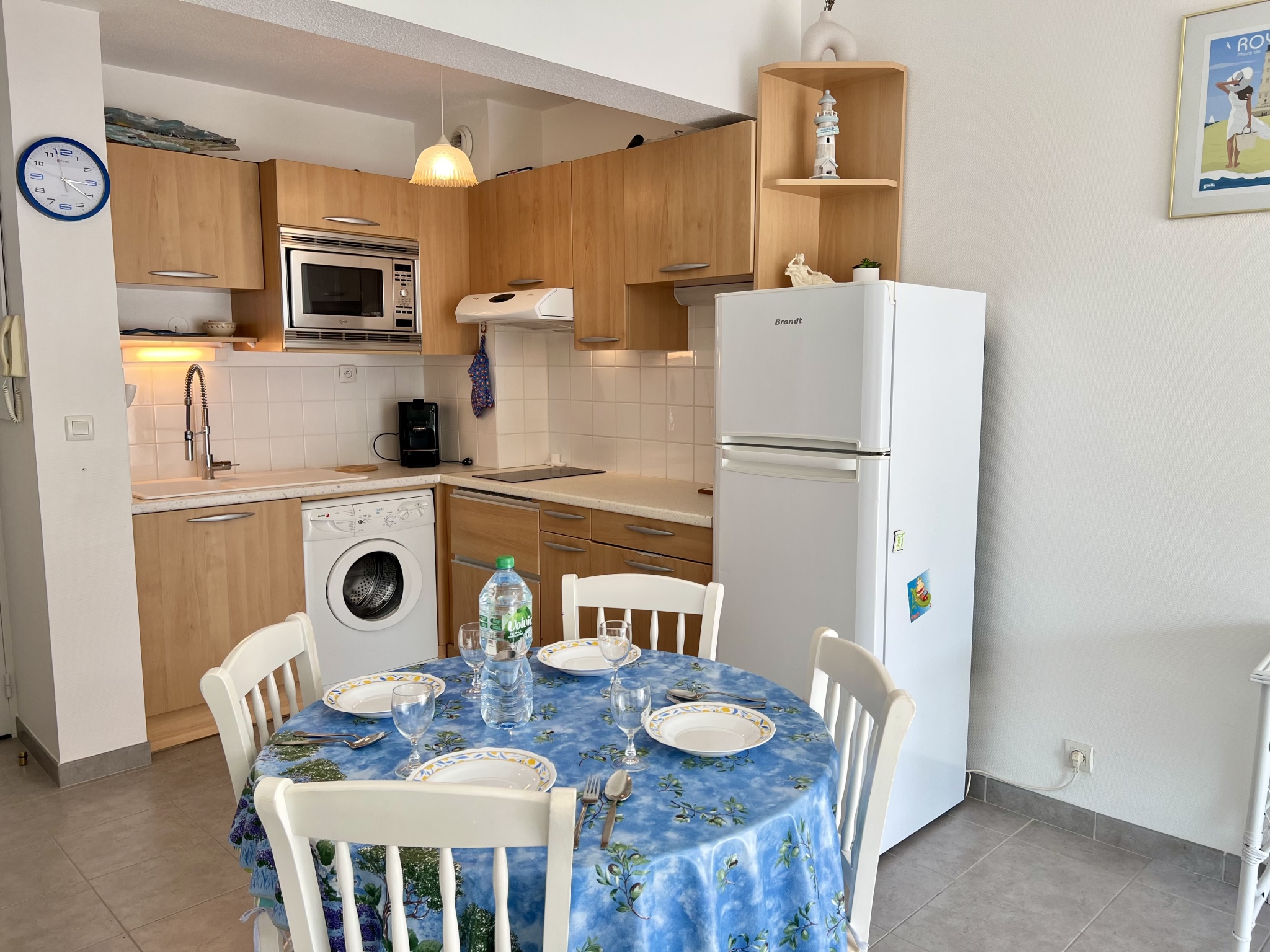 Cuisine toute équipée avec bouilloire, cafetière, plaque induction, micro onde multifonction, grand frigo avec freezer et lave linge. Coin séjour, avec un canapé convertible et une TV écran plat. Séjour donnant sur la terrasse, abritée et ensoleillée. Pour l'espace nuit, la chambre est équipée d'un lit de 140, et d'un placard. Elle donne accès à la salle d'eau, douche, meuble vasque et miroir. Les WC sont séparés.