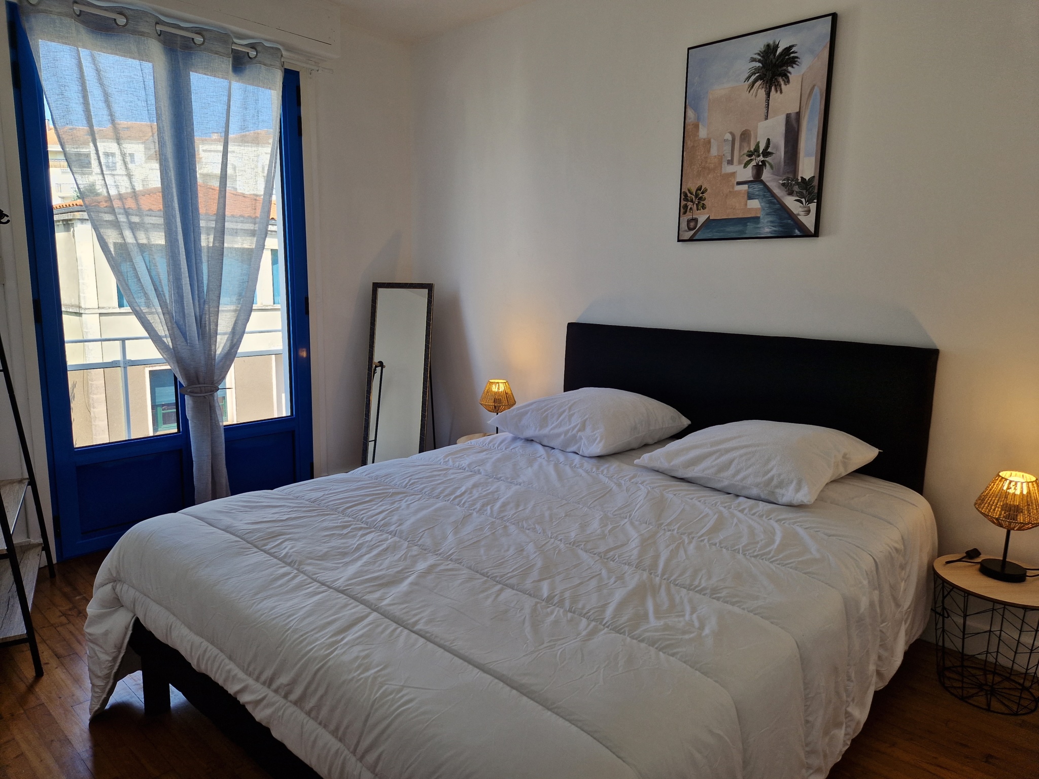 à l'étage, 3 chambres : une première chambre avec un lit de 160, une autre avec un accès terrasse, un lit de 160 et une clim, une dernière chambre donnant également accès à la terrasse, deux lits de 140 et un bz pouvant servir de couchage supplémentaire. Terrasse avec des bains de soleil. Salle de bain, avec wc.