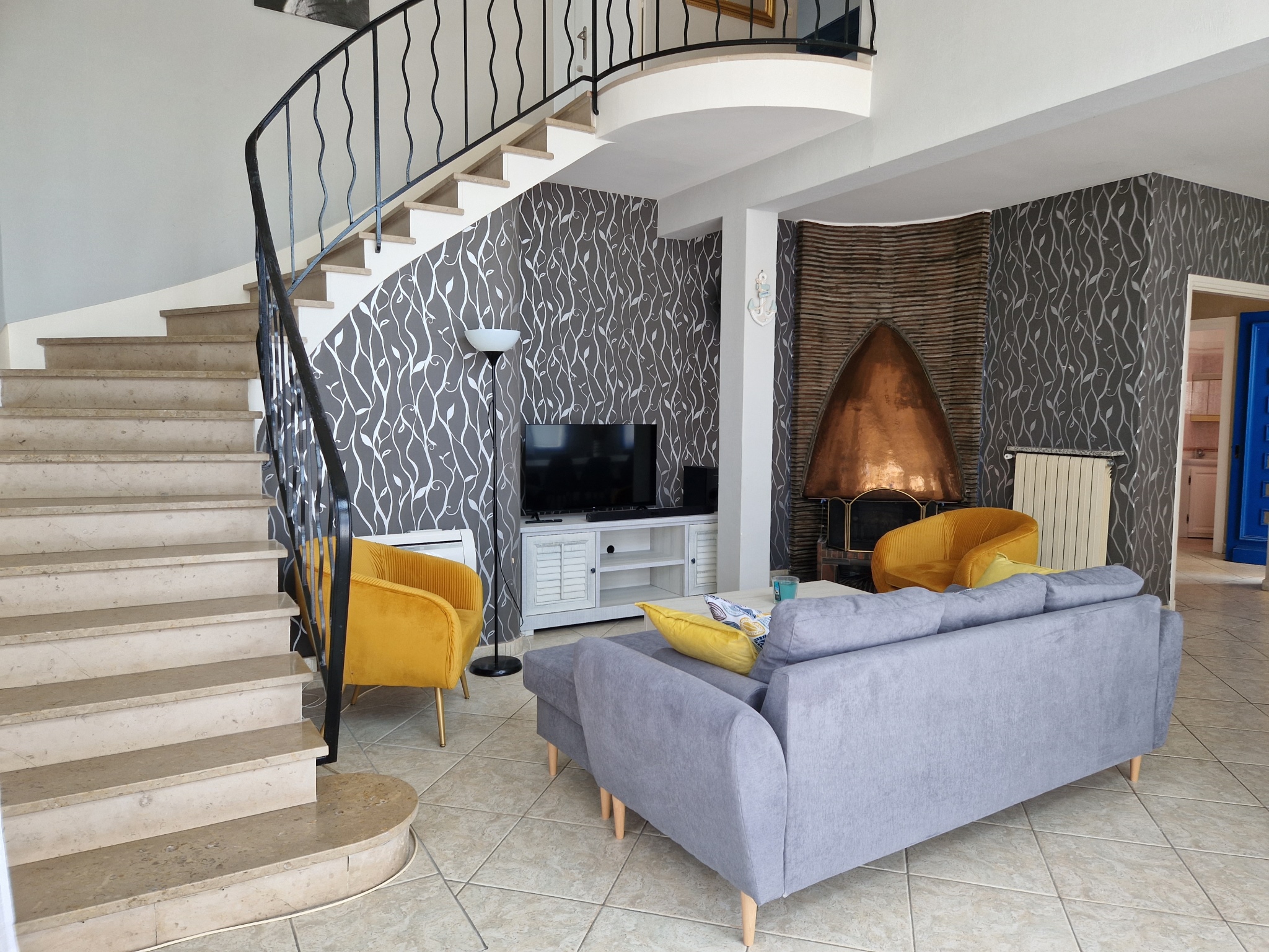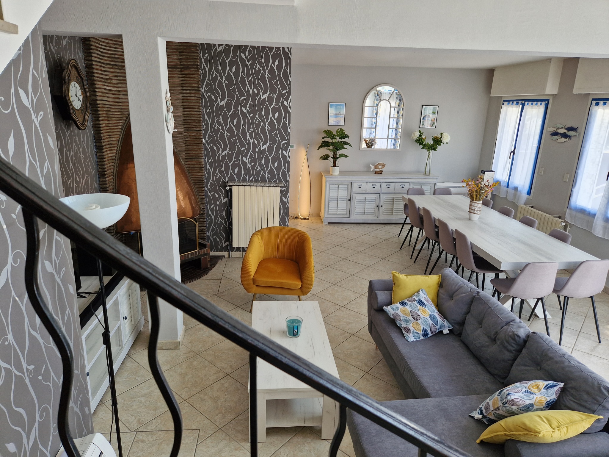Maison avec un étage, offrant au rdc : un bel espace salon/séjour, canapé, tv, cheminée décorative, et table à manger. Pièce climatisée. Cuisine tout équipée, gazinière, four, micro-onde, lave-vaisselle, cafetière, bouilloire, réfrigérateur. Salle d'eau avec wc.
