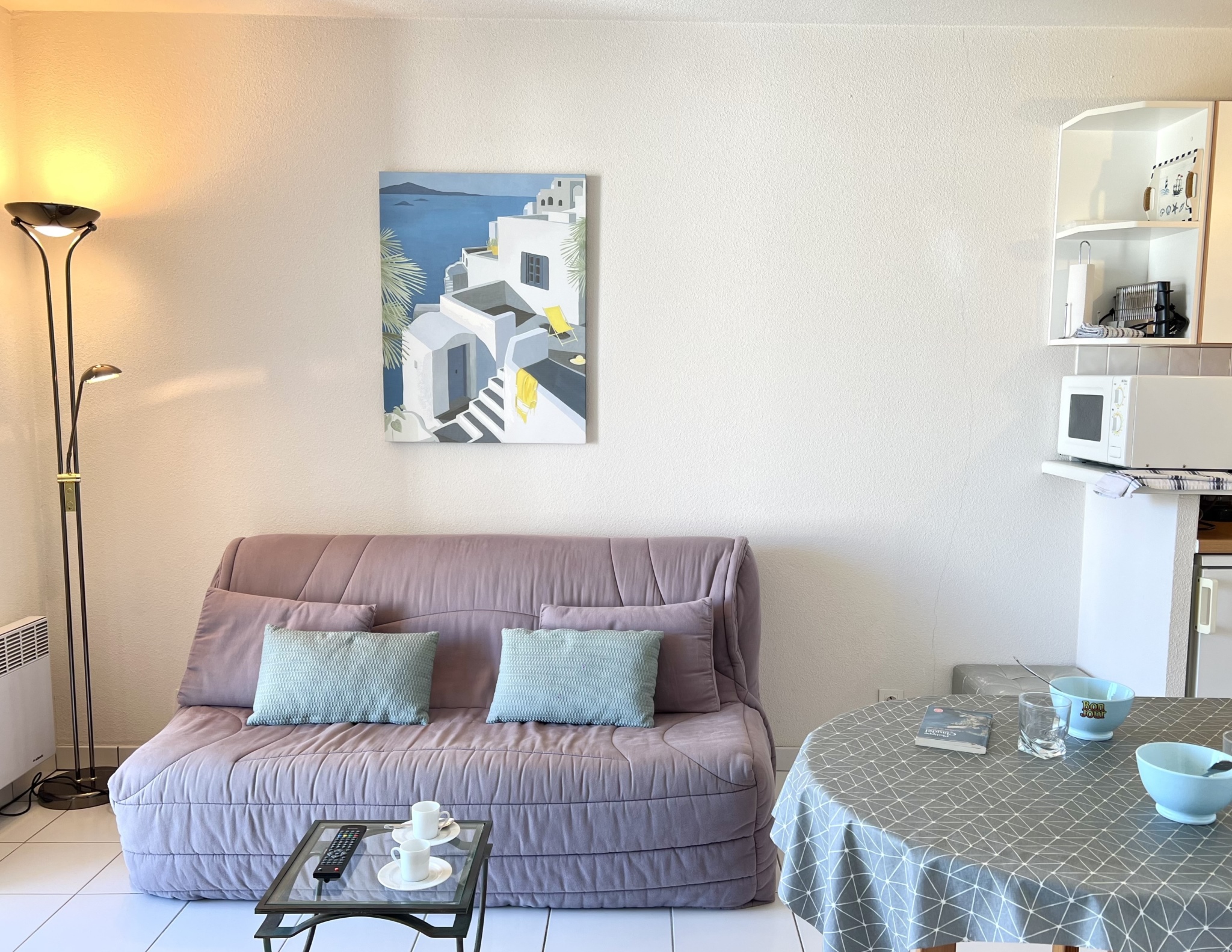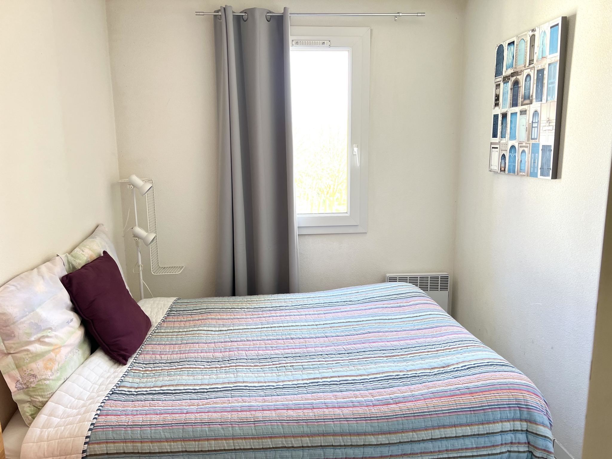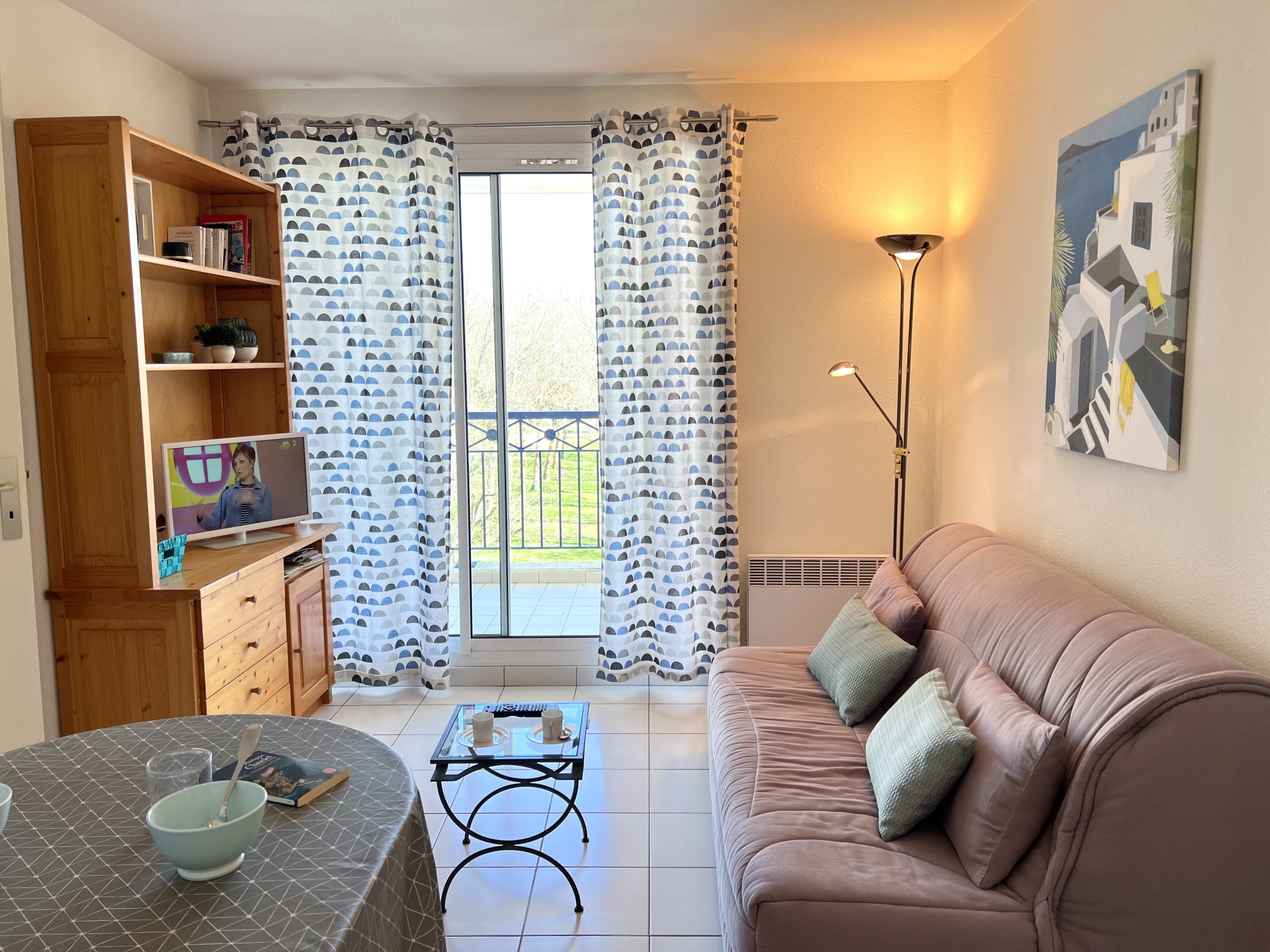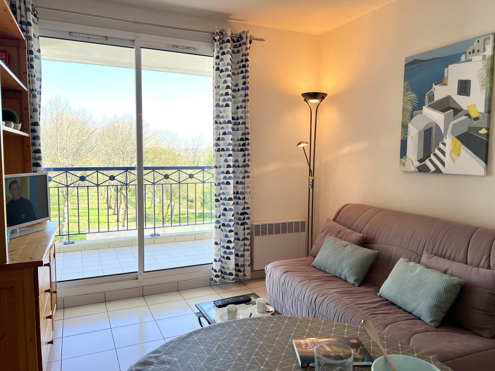 Appartement 2 pièces confortable situé au 2ème étage comprenant : une entrée, wc séparé, salle d'eau, séjour (avec canapé BZ 160*200 + TV) et coin cuisine équipé (LV, MO, mini-four, frigo-top) ouvrant sur terrasse couverte offrant une vue dégagée sur la piscine et le parc, 1 chambre avec 1 lit 140 + placard. Garage privatif. Piscine collective ouverte Juillet et Août.