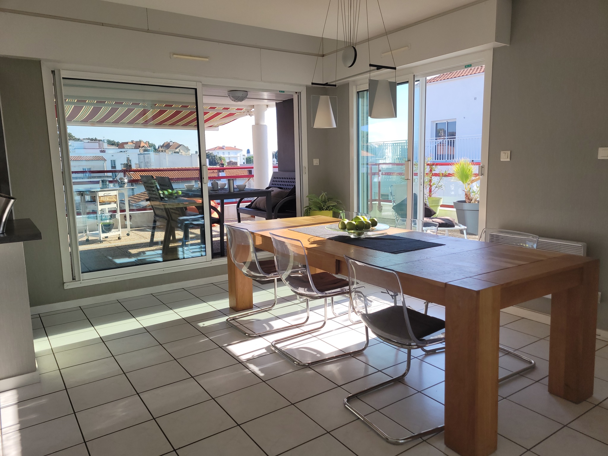 Dans résidence de standing sécurisée avec ascenseur à 50 m de la plage du casino et des commerces de ROYAN Pontaillac, Superbe appartement vue mer penthouse comprenant : entrée/dégagement avec placards, grande et lumineuse pièce à vivre de 62.82 m², ouvrant sur terrasse à 180° de 145 m², cuisine équipée (LL,LV), chambre 1 avec lit 140 et placard, chambre 2 avec 2 lits jumeaux, armoire + salle d'eau et wc, chambre 3 avec 2 lits jumeaux + placard. salle de bain, WC avec lave mains. Place de parking. Animaux non-admis.