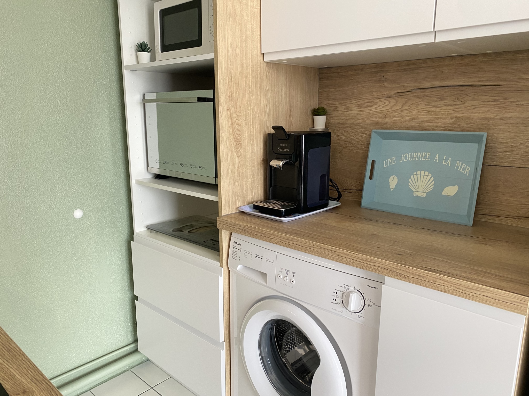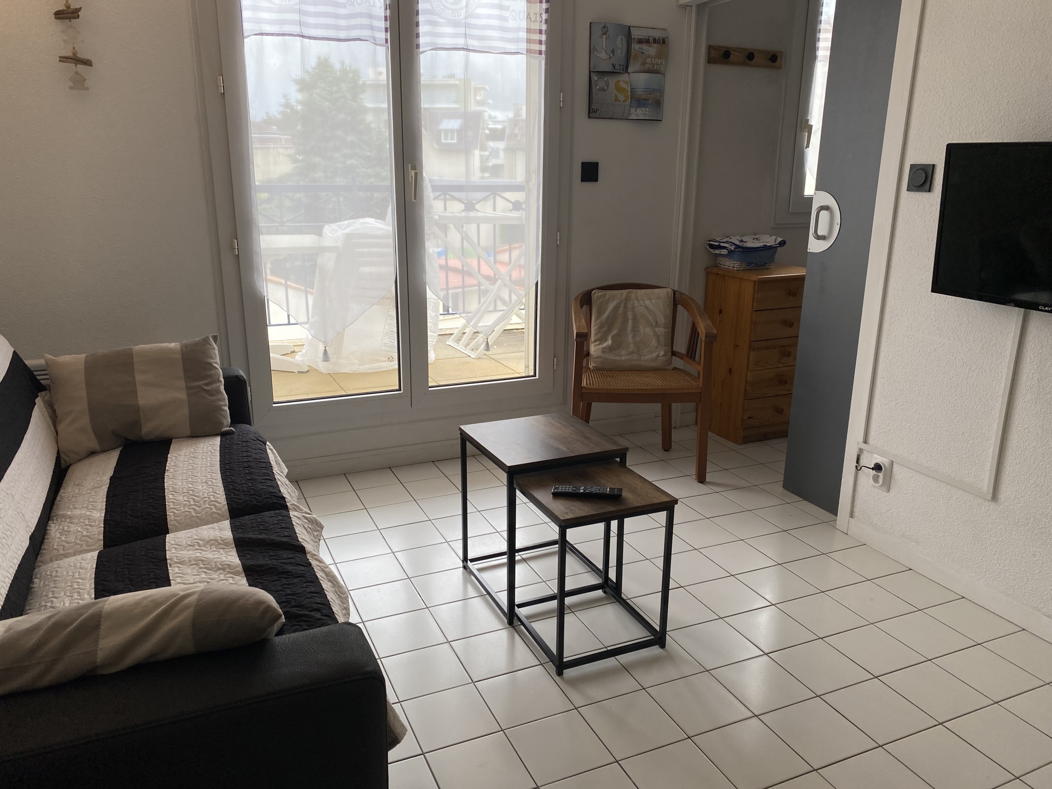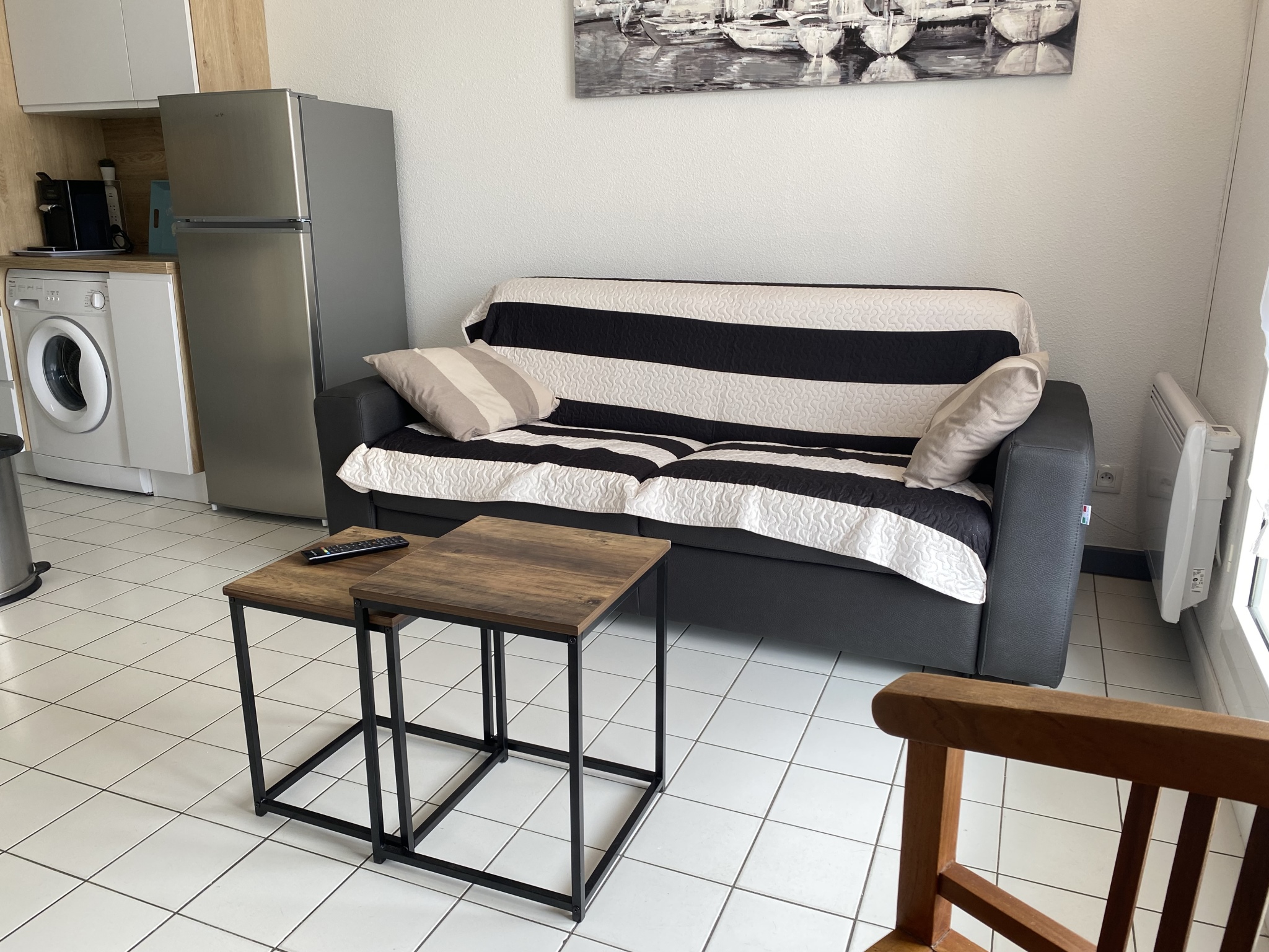 Appartement 2 pièces comprenant : entrée, salle de bains, WC, séjour/salon avec TV + canapé convertible 2 personnes et coin cuisine (lave linge, frigo congélateur, micro onde et four) ouvrant sur belle loggia et son mobilier de terrasse, chambre avec lit mezzanine 140 (+ 90 en hauteur) et placard.