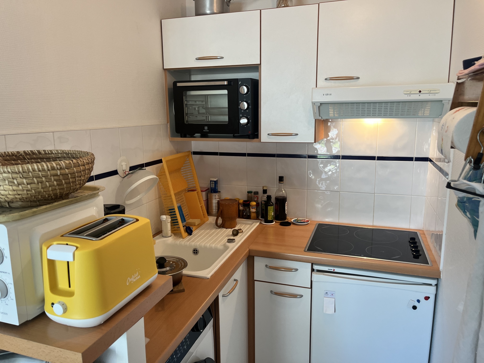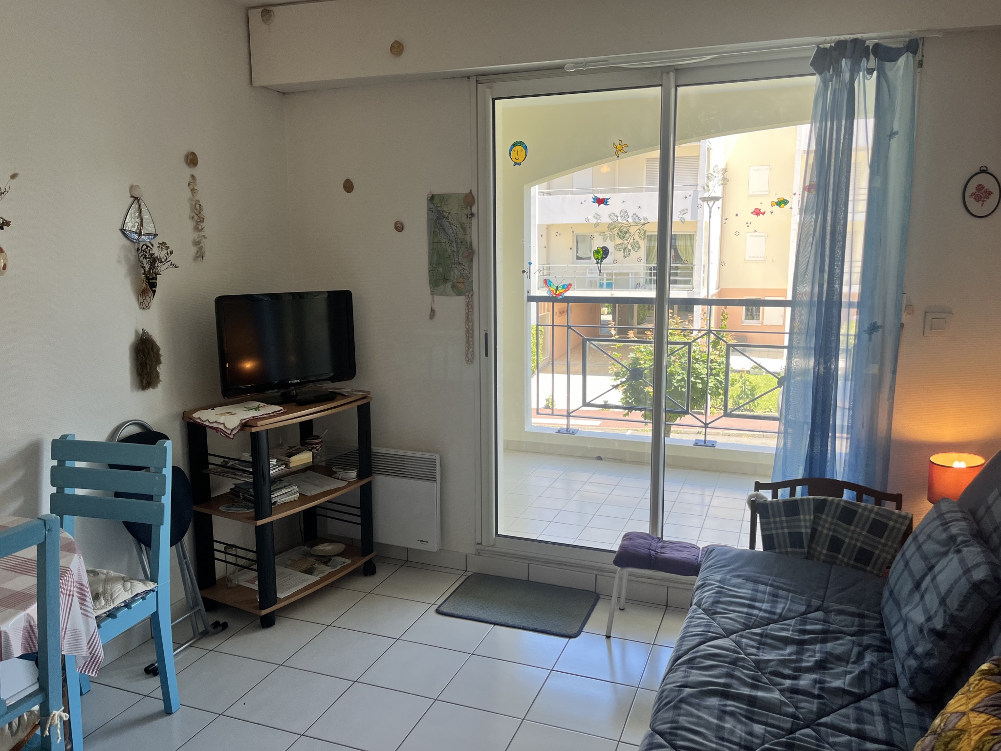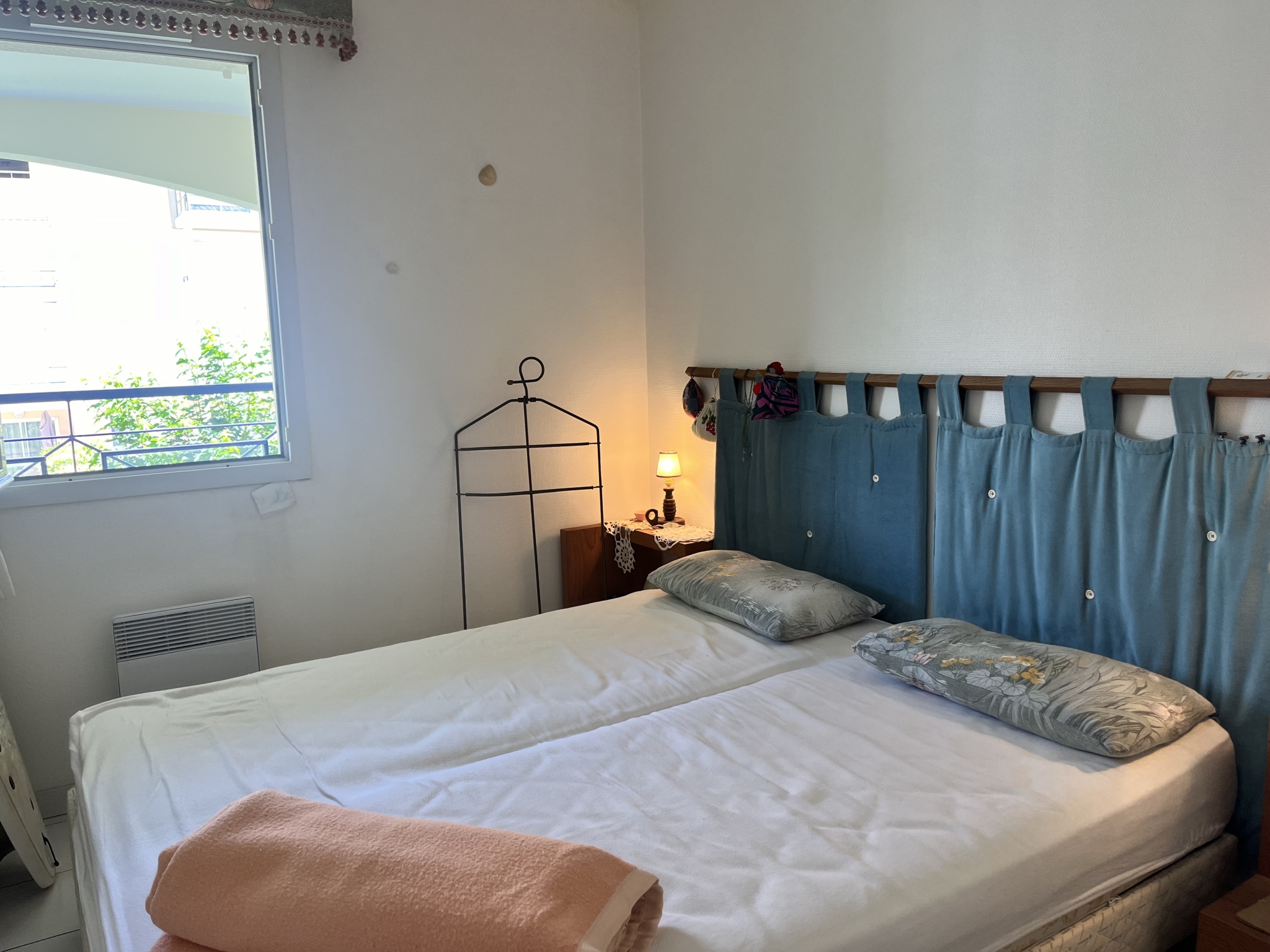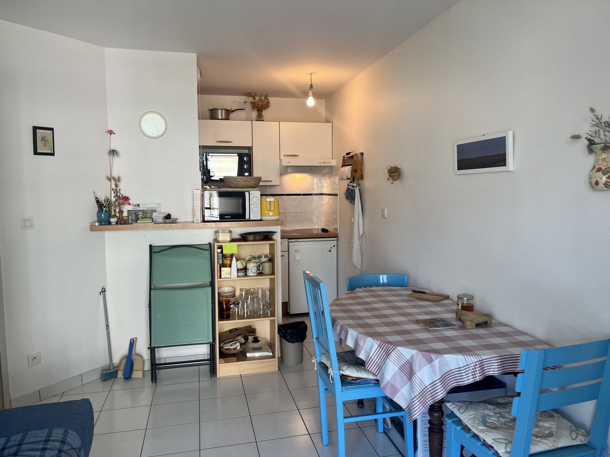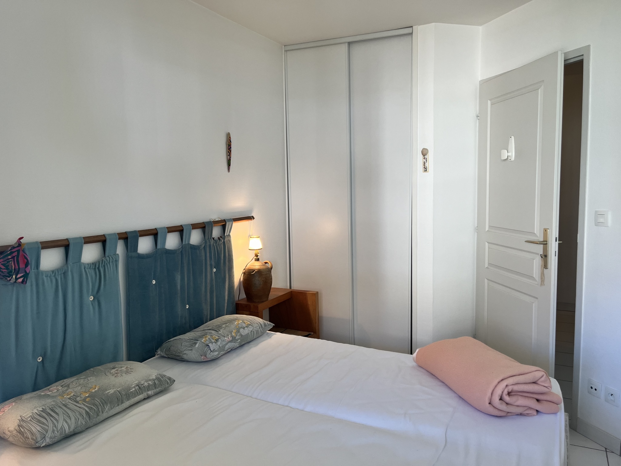 Appartement 2 pièces comprenant : une entrée, séjour avec canapé convertible (2 personnes), TV et kitchenette équipée (lave linge, bouilloire, grille-pain, cafetière, d'un four à micro-onde, plaque, petit frigo) ouvrant sur une belle terrasse. Chambre avec 2 lits 90 et placard, salle de bain (sèche cheveux), WC séparé.