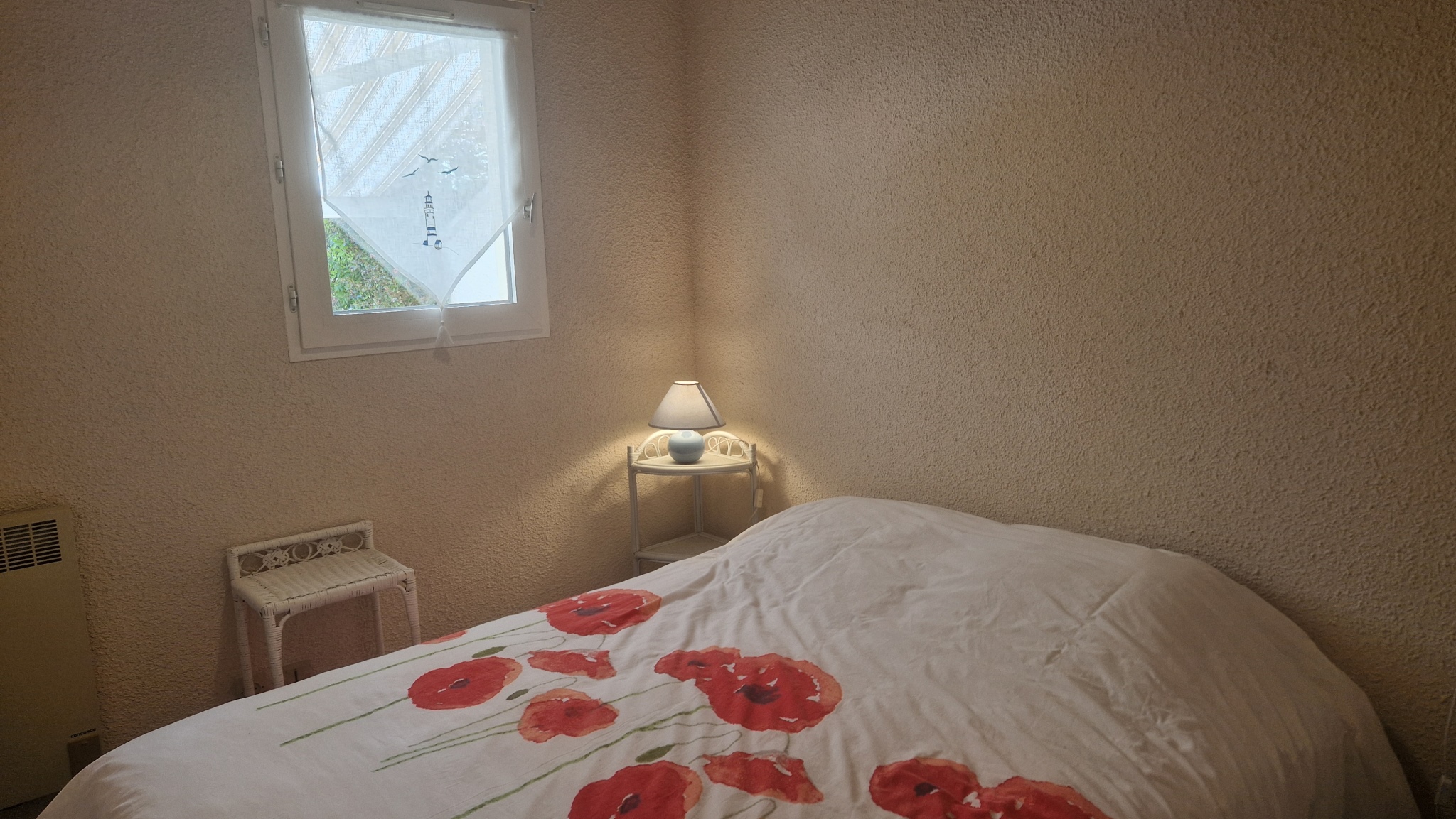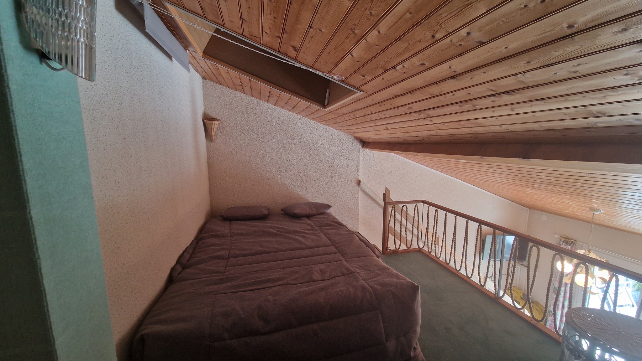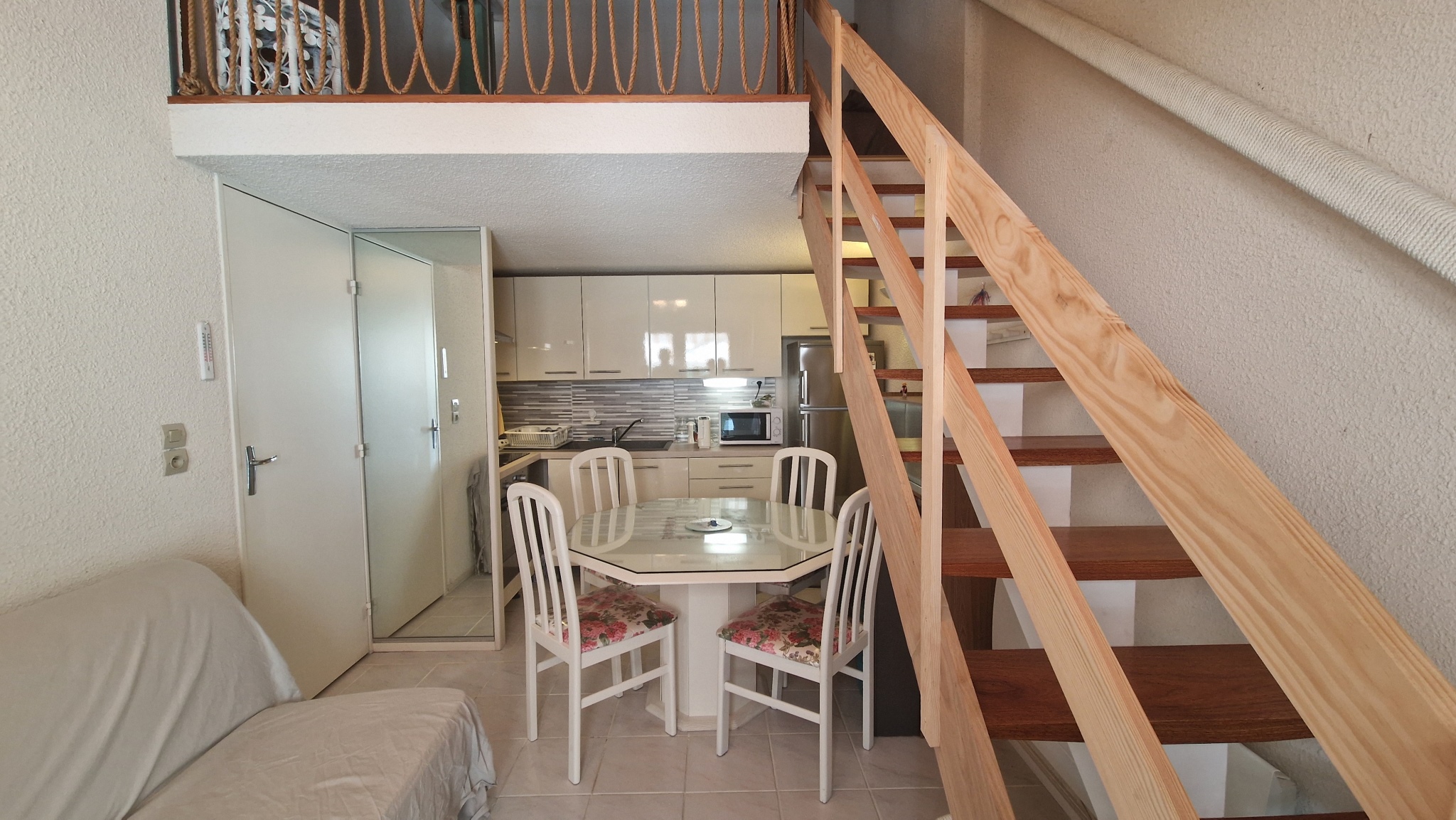 Elle se compose d’un séjour (tv, canapé) d’une cuisine équipée (plaques vitrocéramiques, hotte, lave-linge, micro-ondes et grand réfrigérateur-congélateur), d’une chambre avec un lit double 140, d’une salle d’eau, de WC séparés, ainsi que d’une mezzanine avec un lit double 140