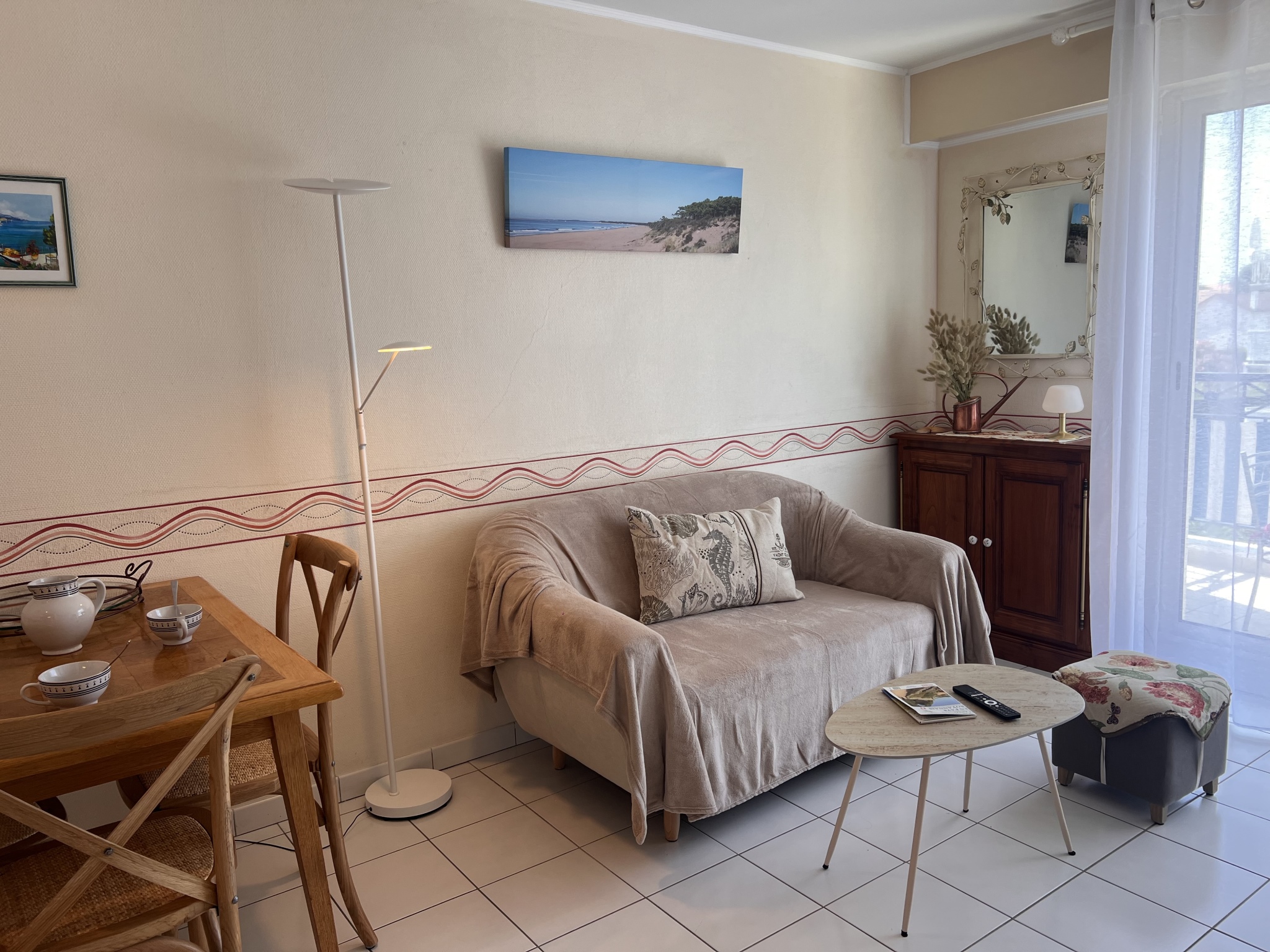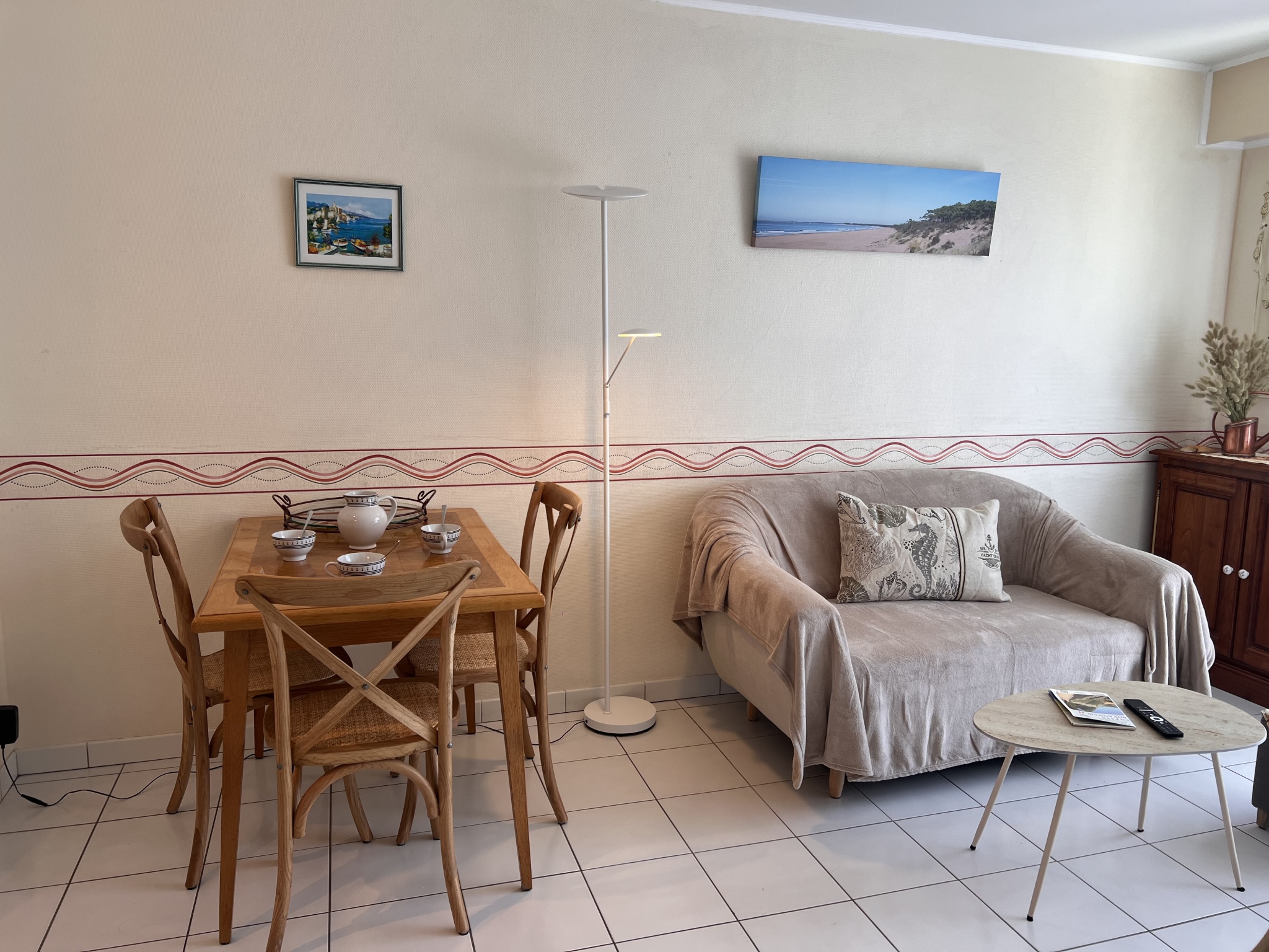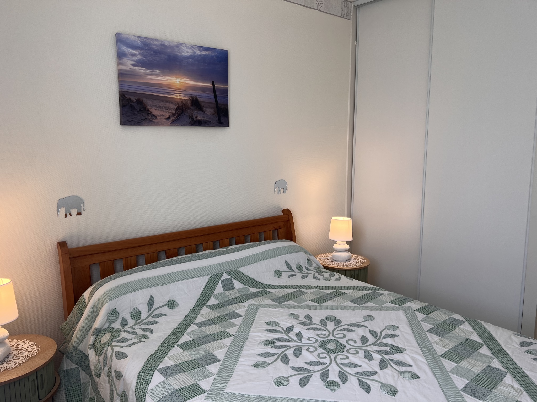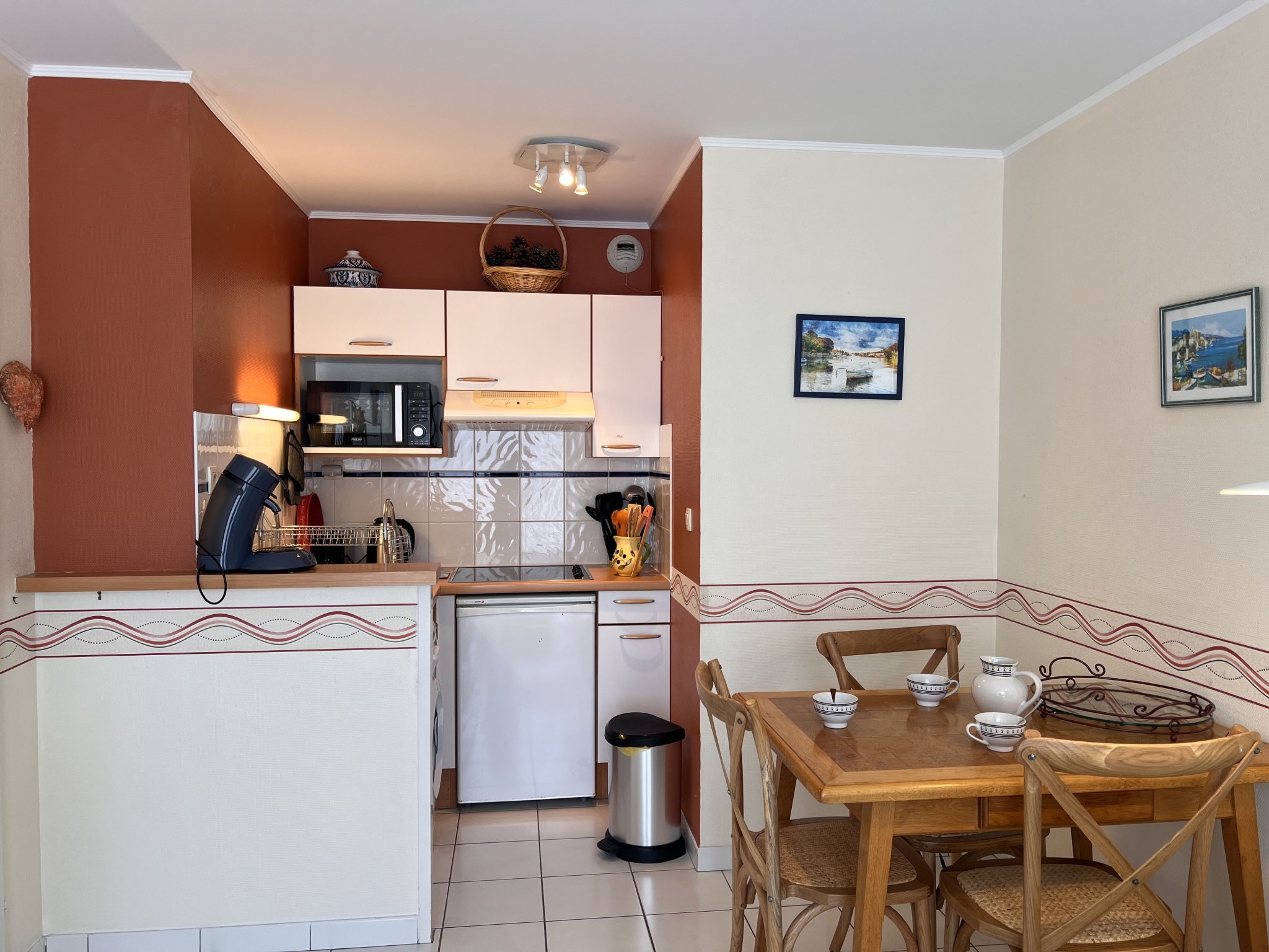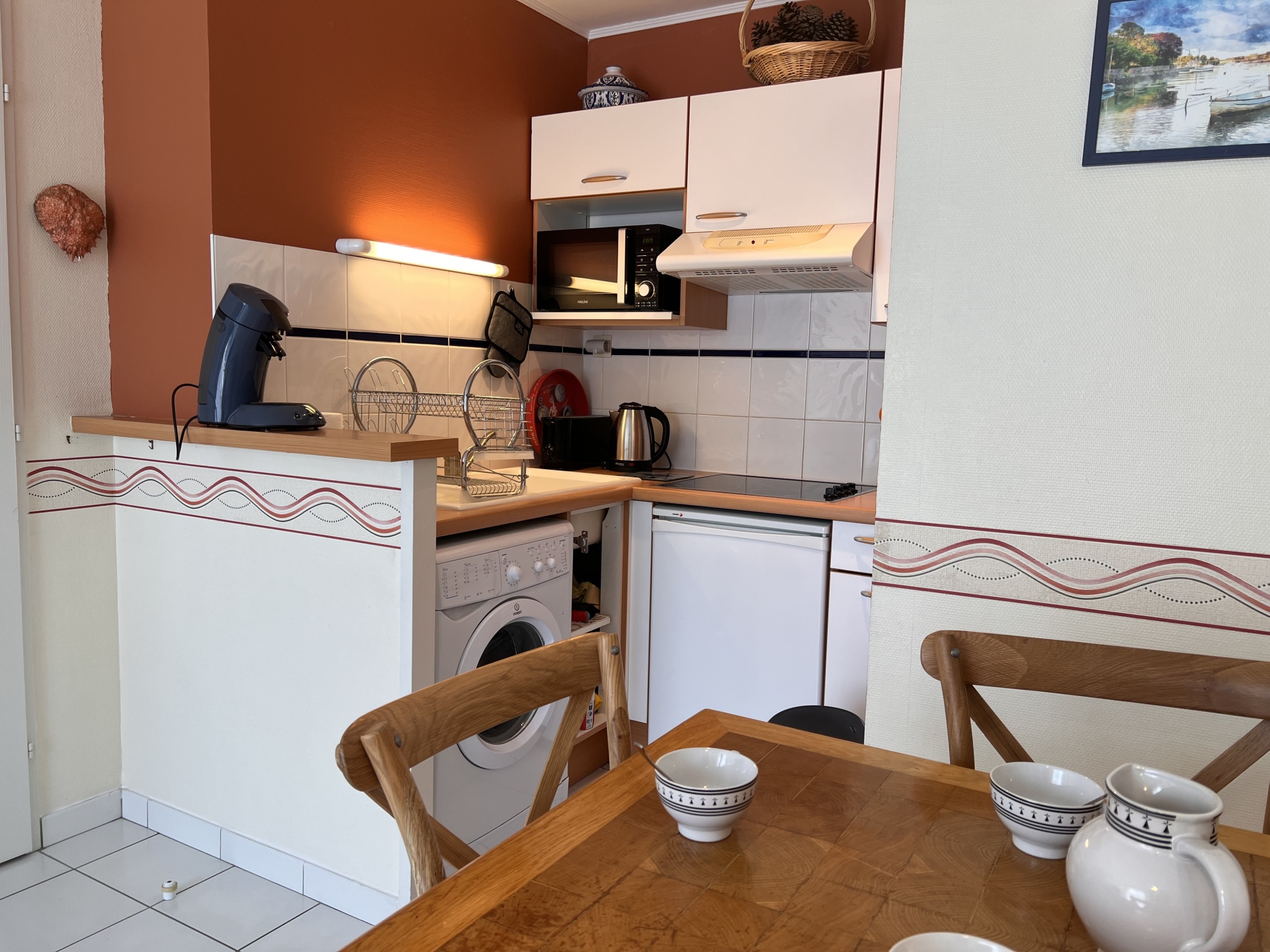 Appartement 2 pièces comprenant : une entrée, WC séparé, placard avec lave-linge, séjour très lumineux avec un espace salle à manger et espace salon avec un canapé avec un accès au balcon plein Ouest.. Cuisine équipée (mini-four, frigo-freezer, plaque, cafetière, bouilloire, grille-pain..) SDE avec meuble vasque et une douche cabine. La chambre possède un lit de 140 et un grand placard. Balcon avec store banne .