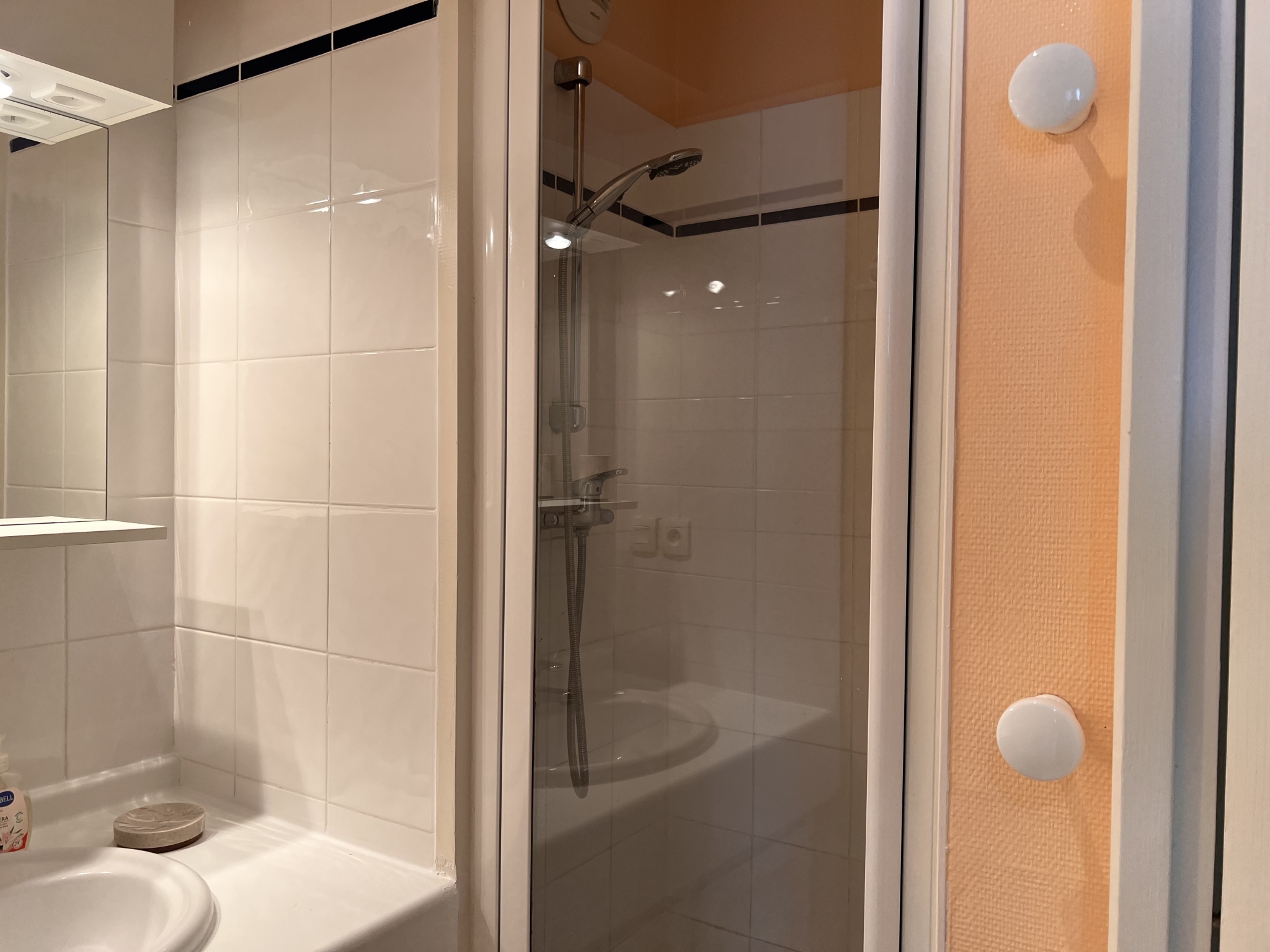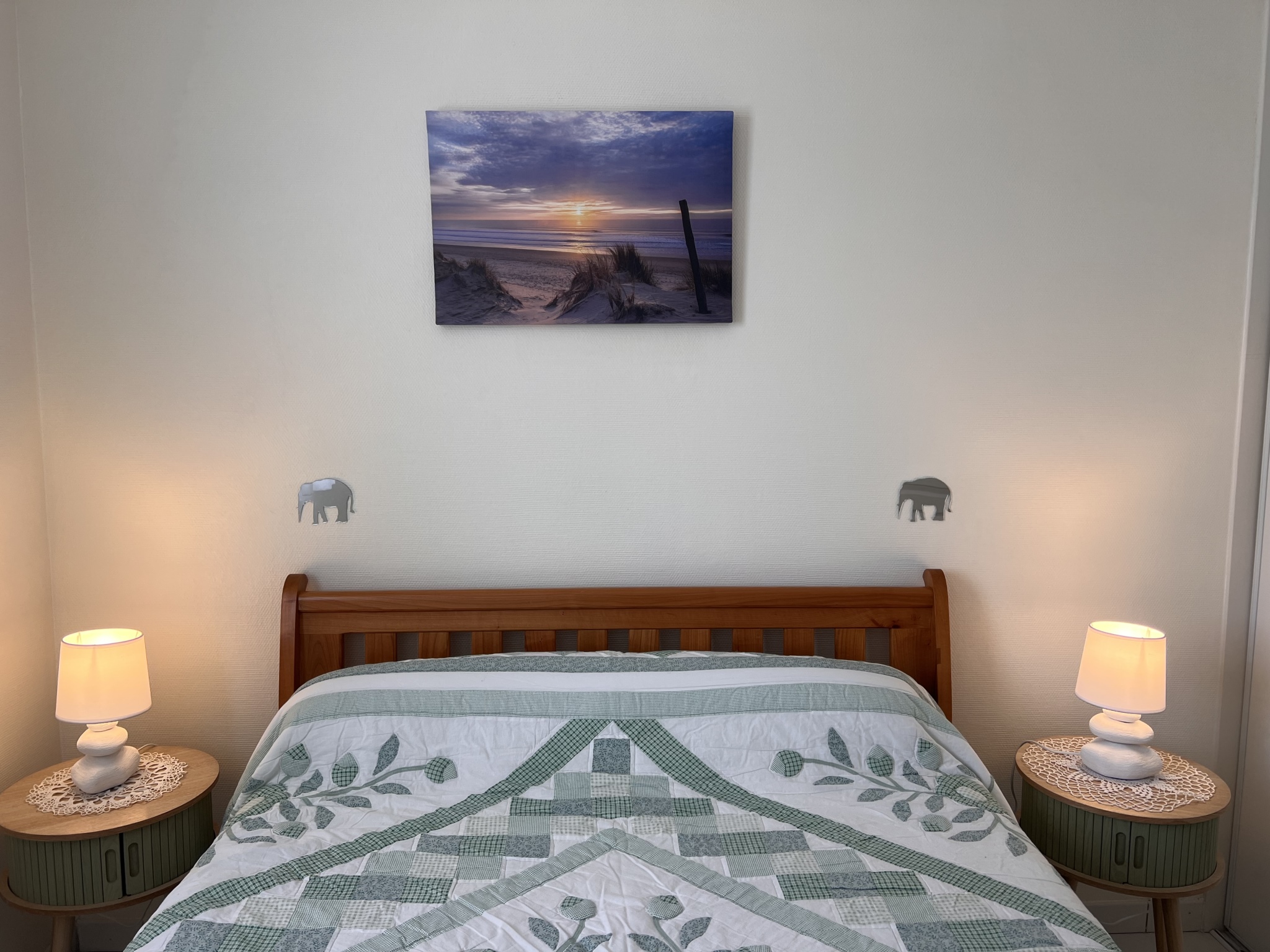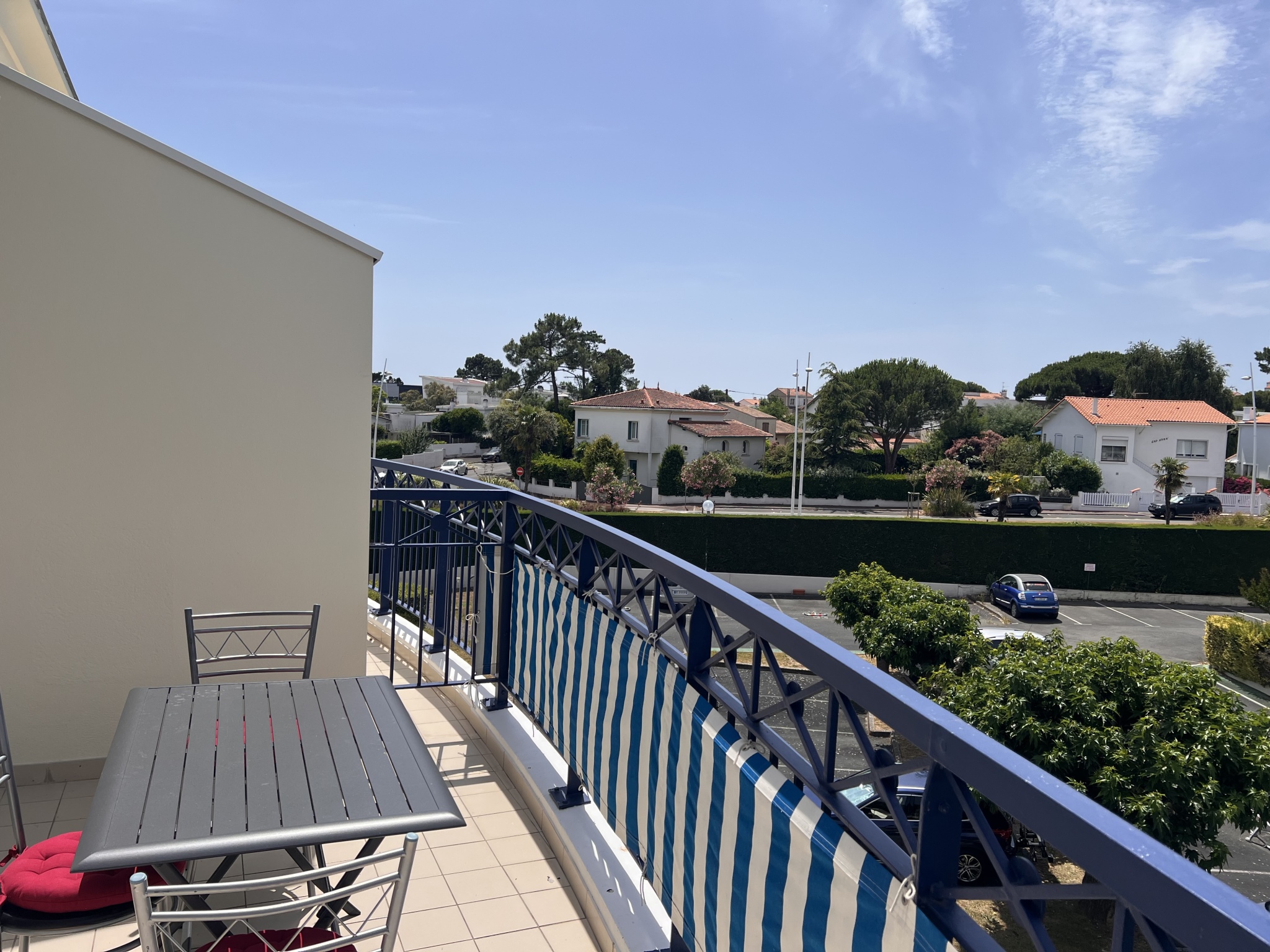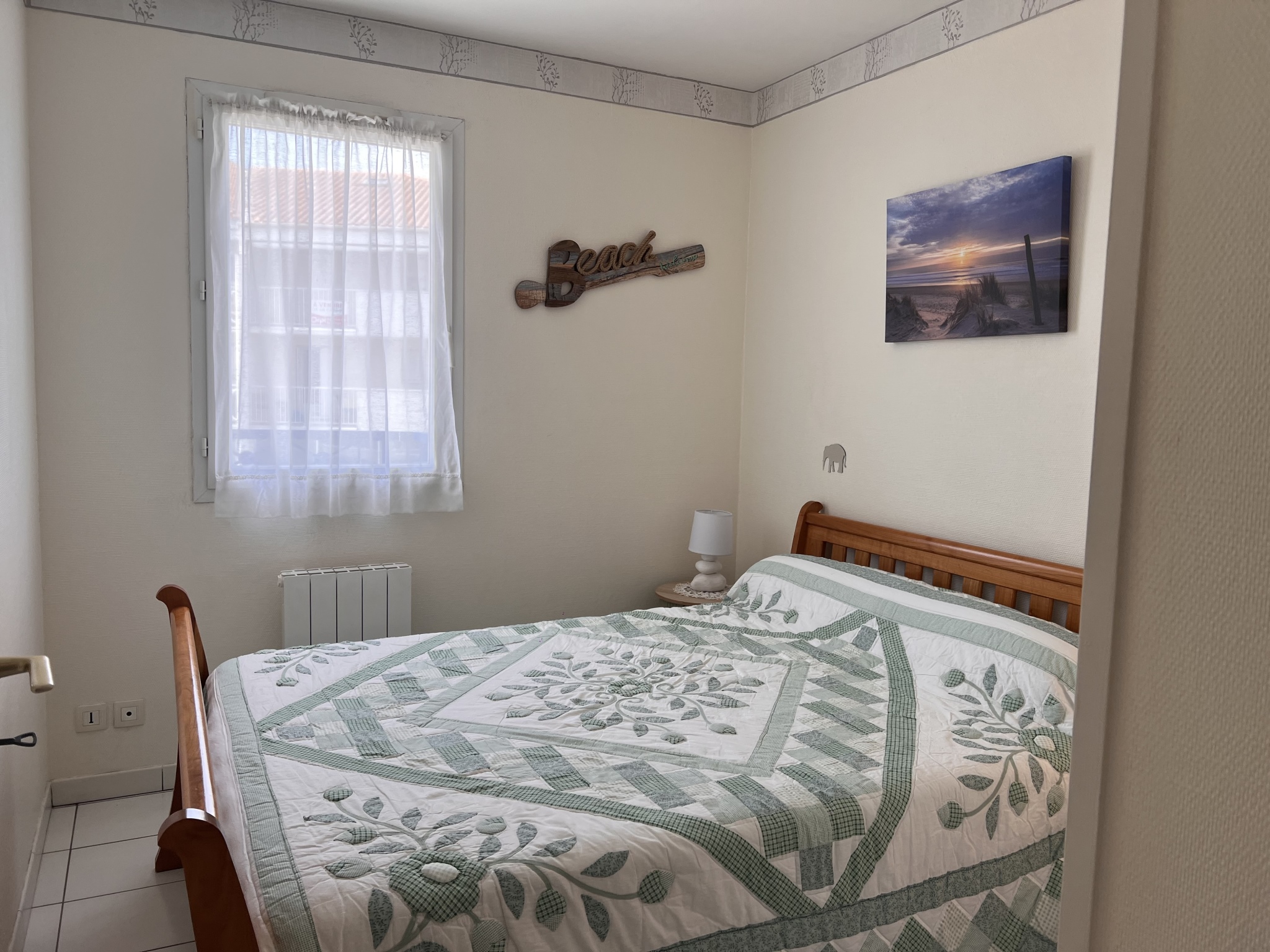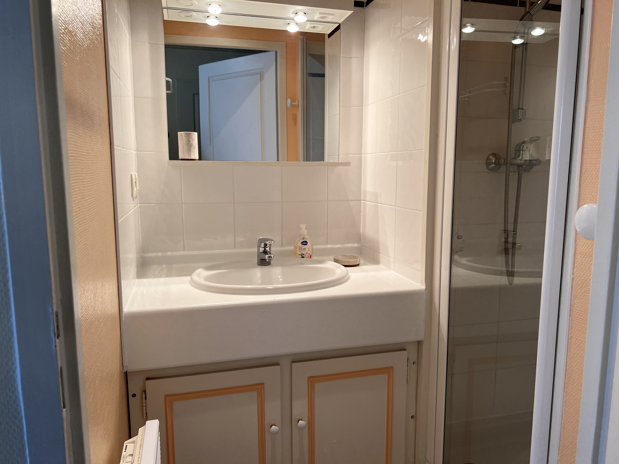 Appartement 2 pièces comprenant : une entrée, WC séparé, placard avec lave-linge, séjour très lumineux avec un espace salle à manger et espace salon avec un canapé avec un accès au balcon plein Ouest.. Cuisine équipée (mini-four, frigo-freezer, plaque, cafetière, bouilloire, grille-pain..) SDE avec meuble vasque et une douche cabine. La chambre possède un lit de 140 et un grand placard. Balcon avec store banne .
