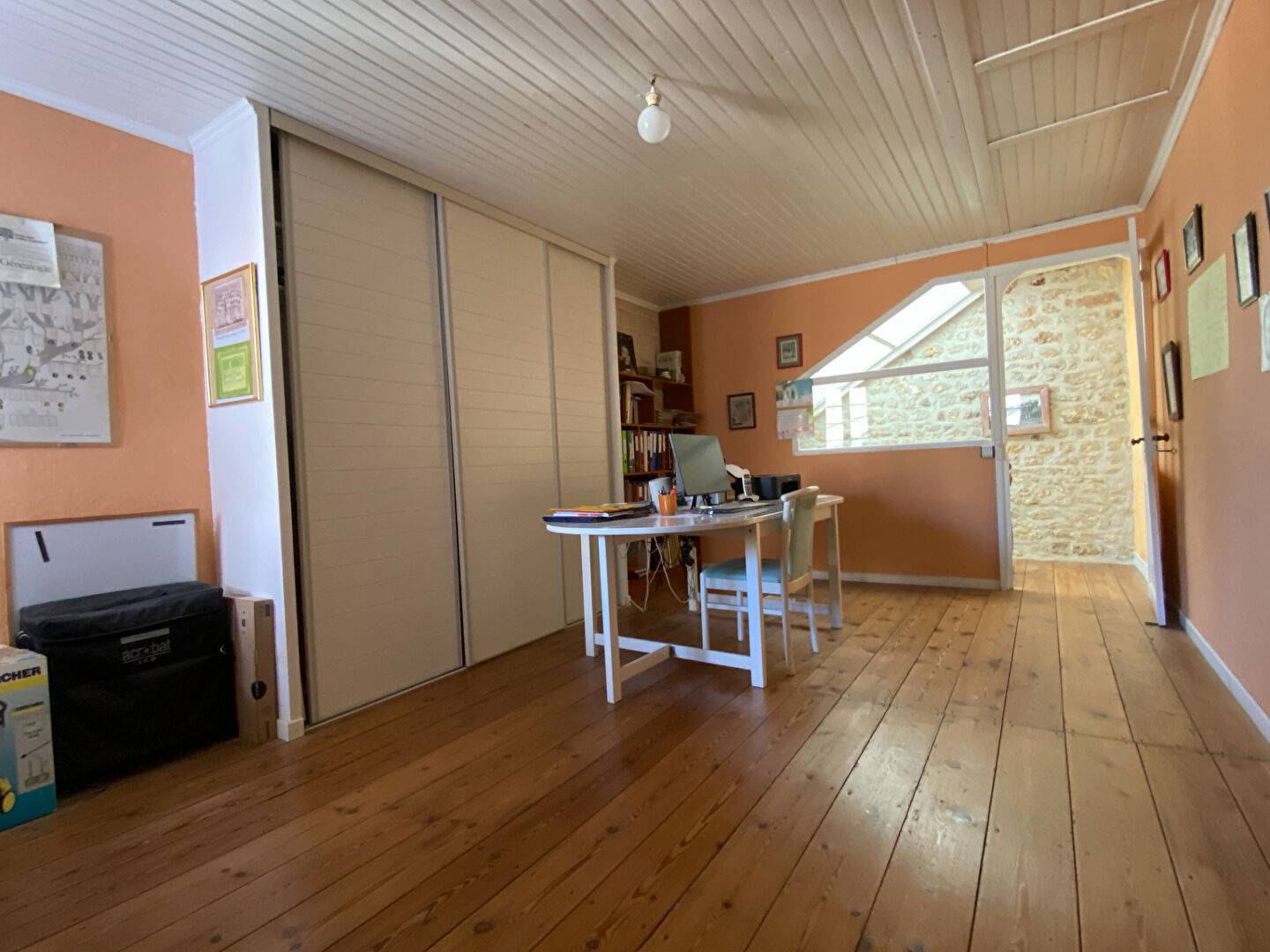 A l'étage, un palier dessert un bureau/chambre de 20 m² avec placard, deux grandes chambres, dont une avec salle d'eau privative et cabinet de toilettes avec wc.