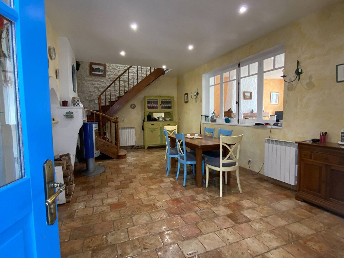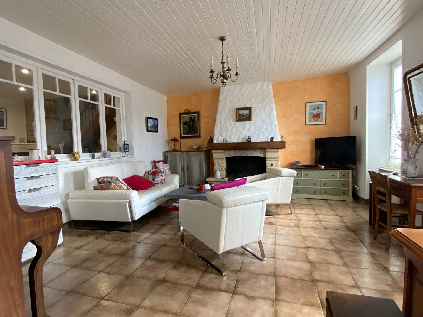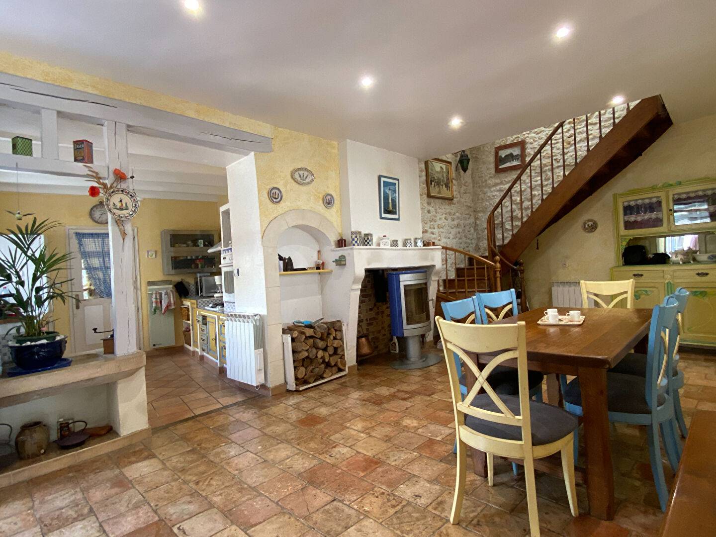 Le rez-de-chaussée se compose d'une entrée, un salon avec cheminée, une salle à manger avec poêle à bois, donnant sur jardin, une cuisine aménagée et équipée, une chambre, salle d'eau avec wc.