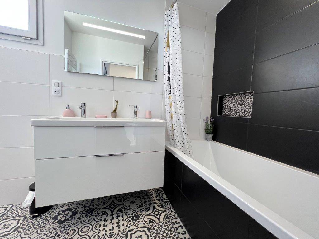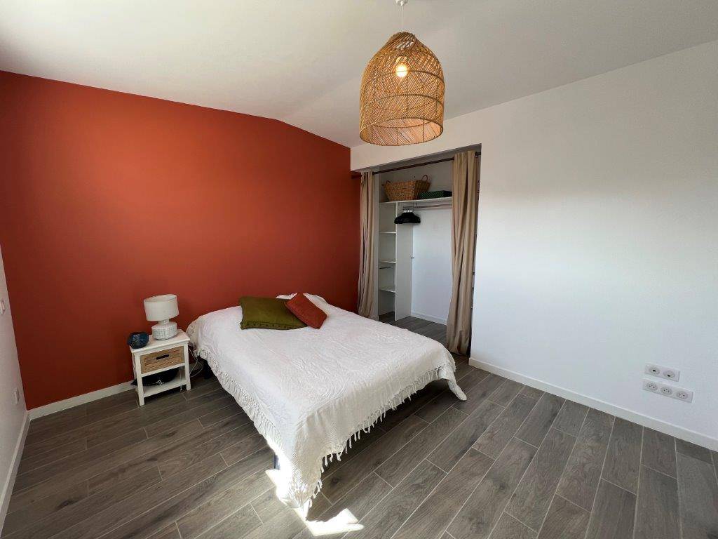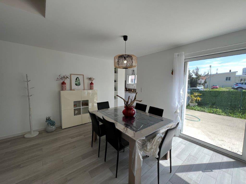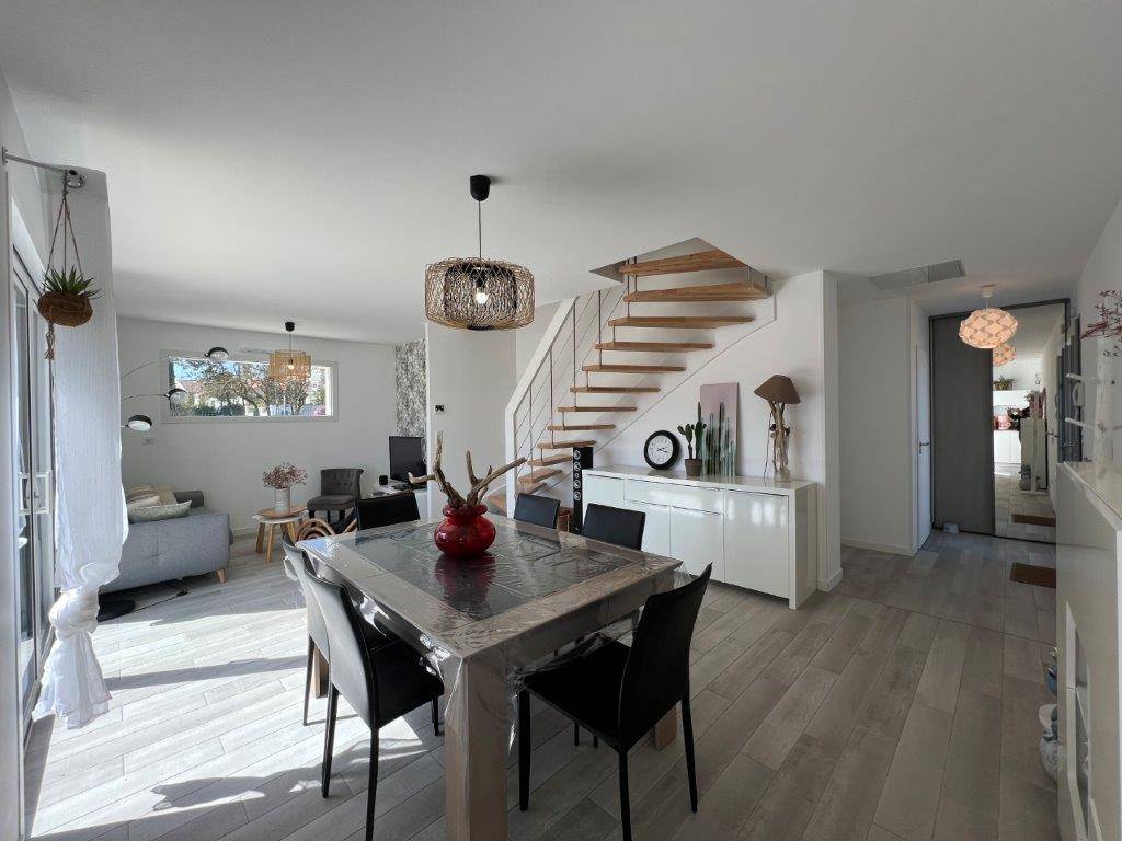 - Au rez-de-chaussée : Entrée avec placard, séjour-salon ouvrant sur terrasse et jardin, cuisine ouverte et aménagée, une chambre avec salle d'eau et wc, un second wc.
