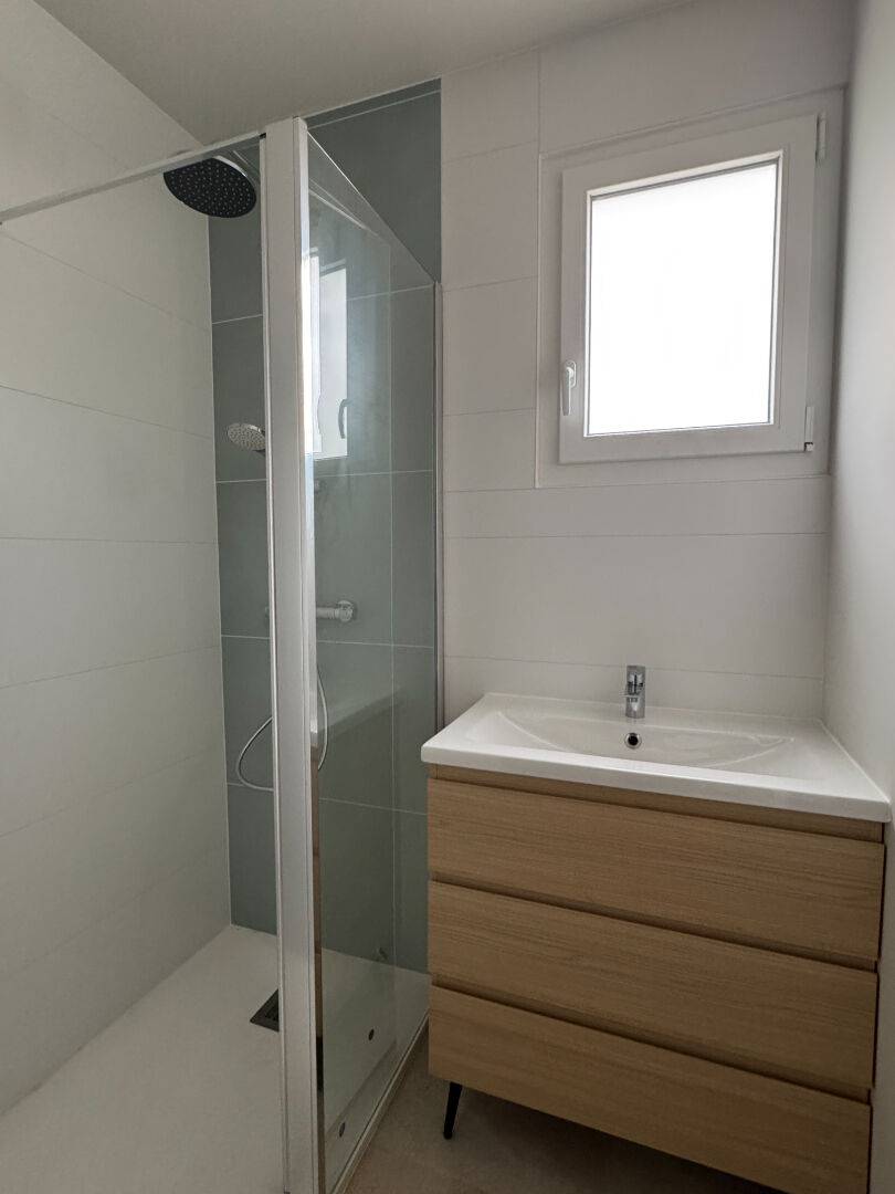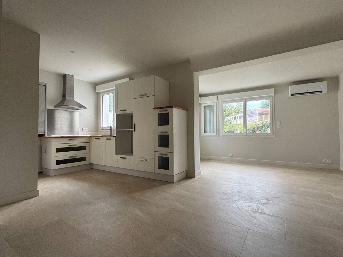 Une entrée avec placard desservant une grande pièce de vie avec cuisine ouverte, chambre 1 avec placard (17m²), chambre 2 avec placard (11m²) donnant sur balcon, salle d'eau et wc. A l'étage : une chambre.