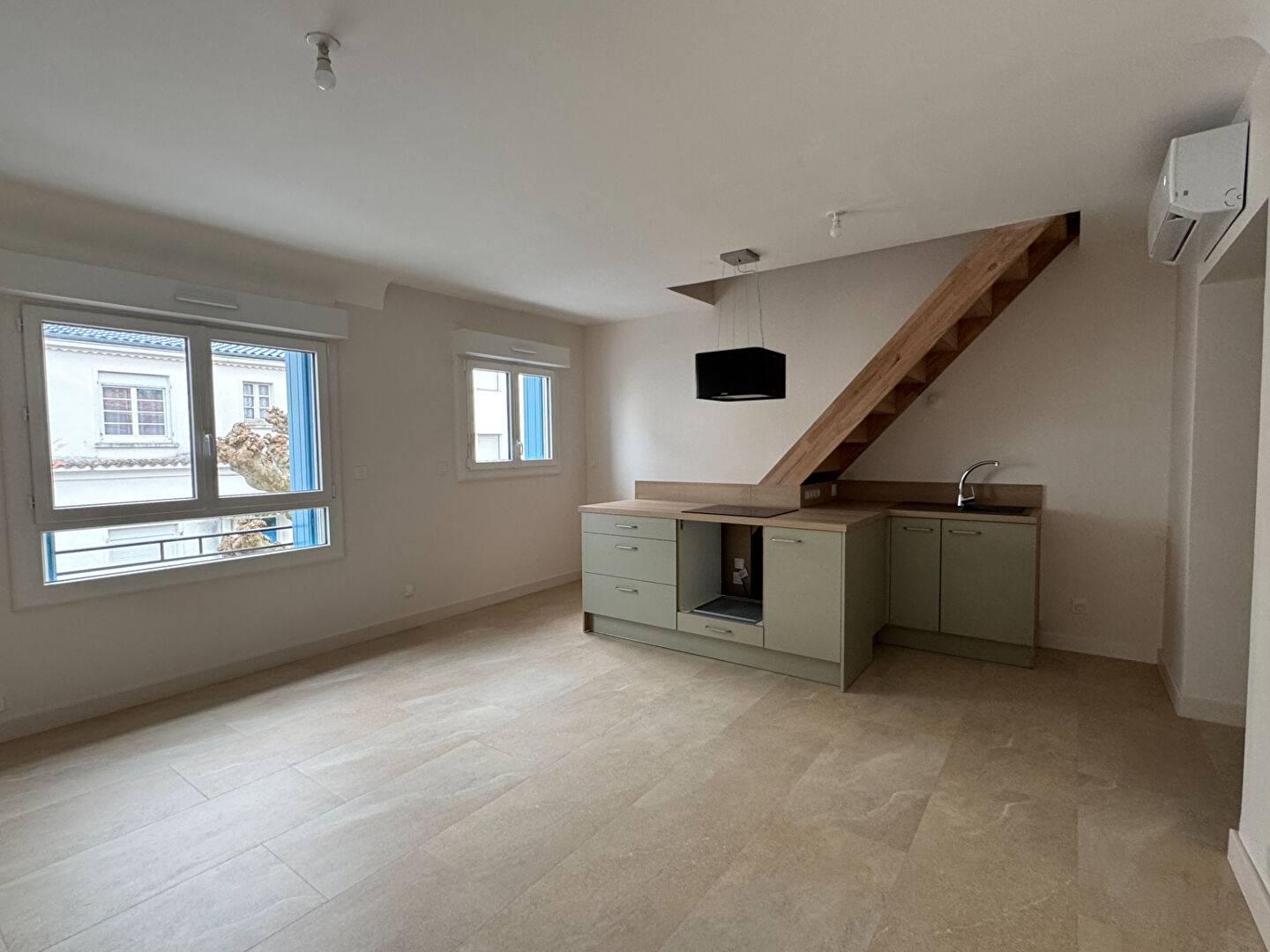 Entrée avec placard desservant une pièce de vie avec cuisine ouverte, salle d'eau et wc. A l'étage : une chambre. Chauffage climatisation réversible + électricité.