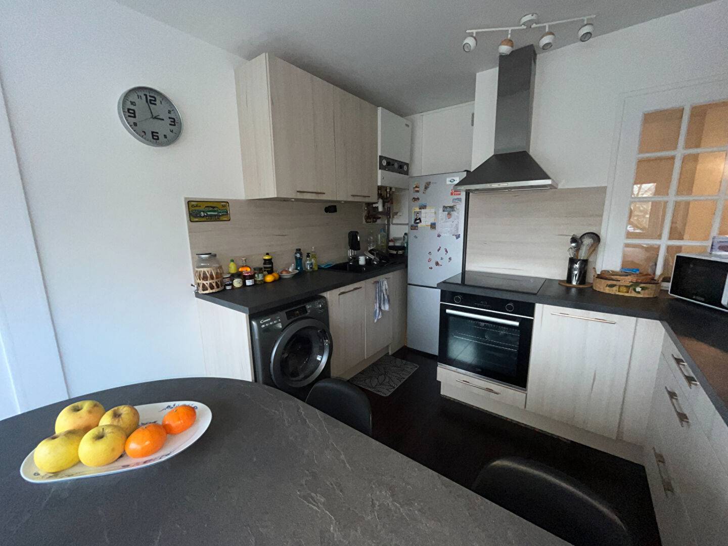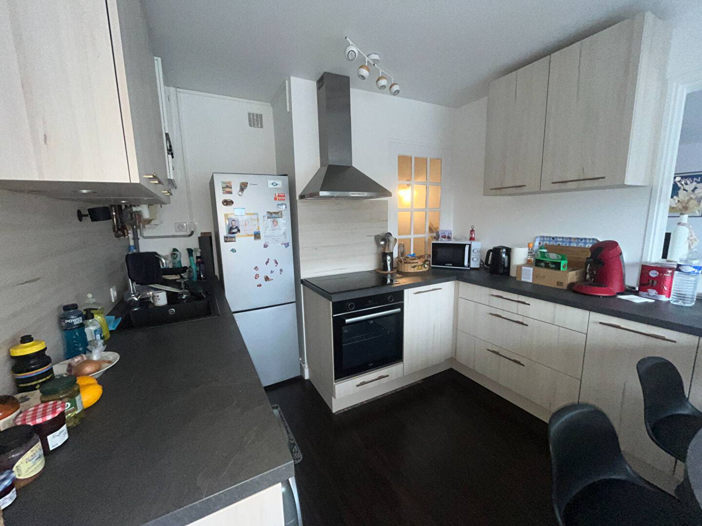 Entrée avec placard, beau séjour/salon lumineux, cuisine équipée, dégagement, deux chambres, salle d'eau, wc.