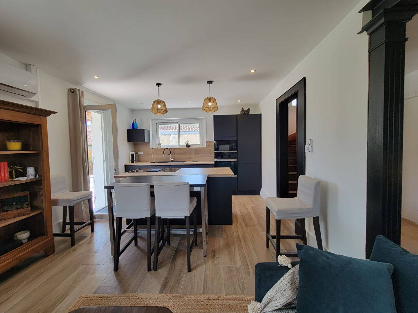 Entrée sur salon-séjour traversant et lumineux avec cuisine ouverte aménagée et équipée, donnant sur jardin, terrasse et Piscine.