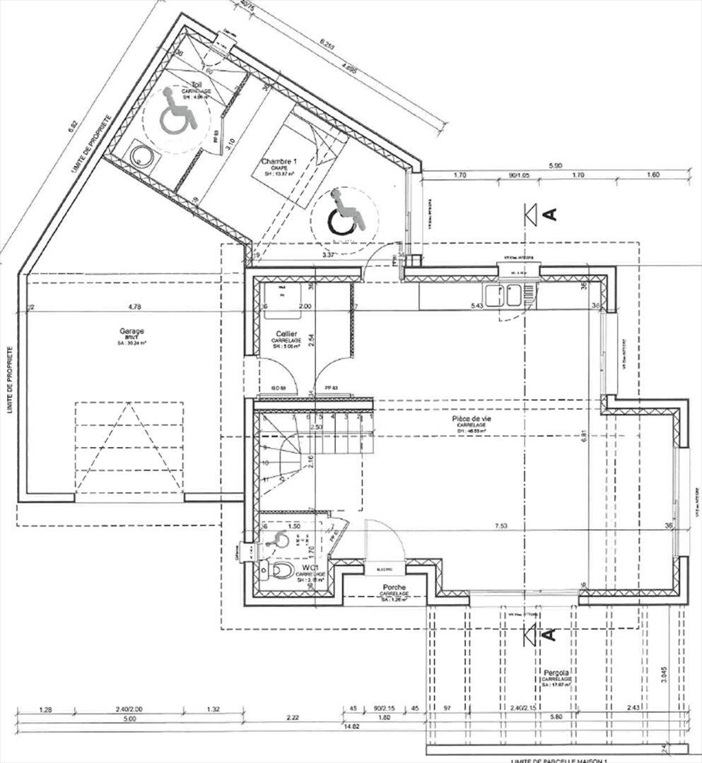 Pièce de vie traversante donnant sur jardin, cuisine ouverte , cellier, Chambre parentale avec douche à l' Italienne, WC séparé, Garage